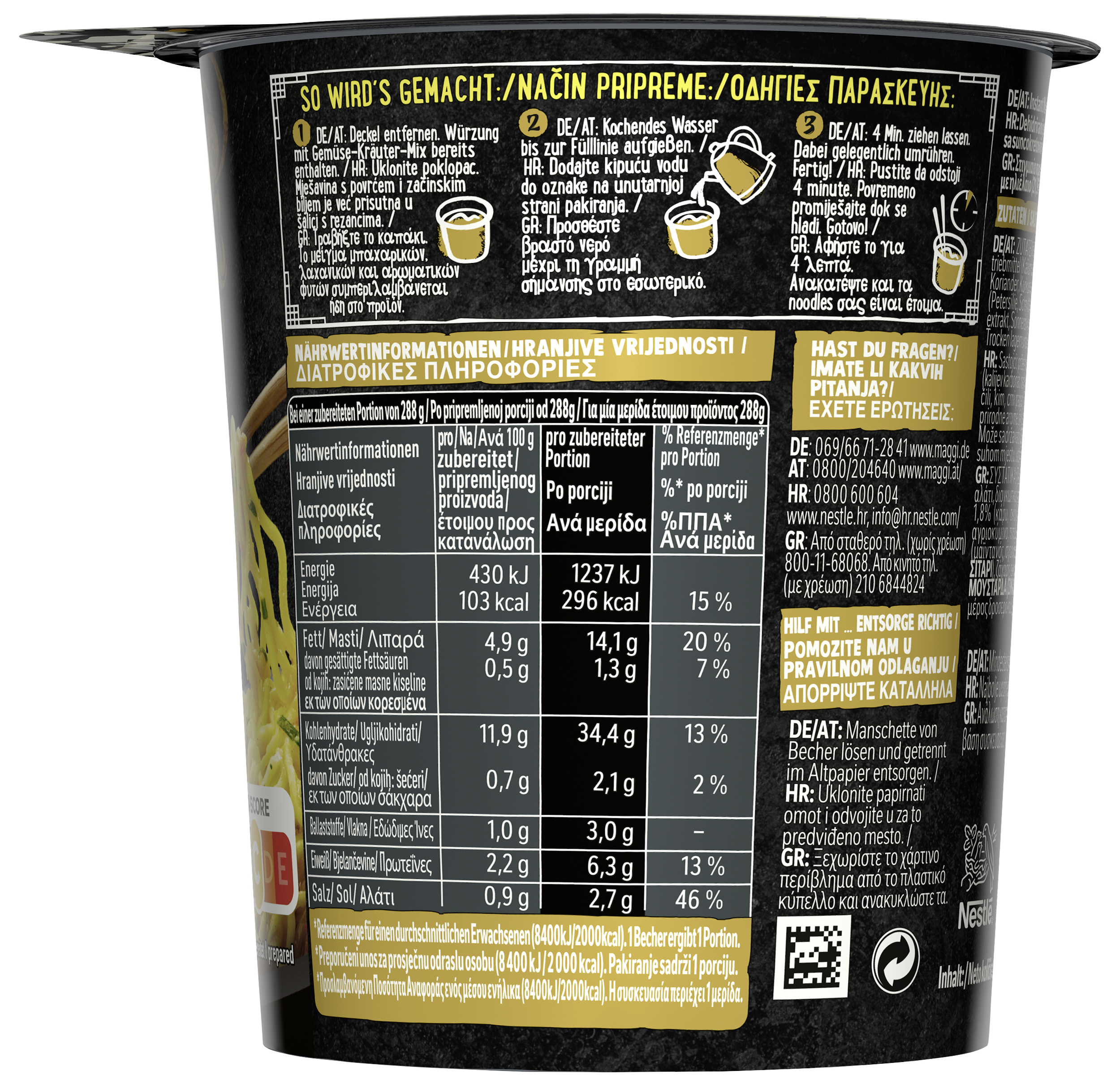 | Preparation Instructions | So wird's gemacht: 1. Deckel entfernen. Würzung mit Gemüse-Kräuter-Mix bereits enthalten. 2. Kochendes Wasser bis zur Fülllinie aufgießen. 3. 4 Min. ziehen lassen. Dabei gelegentlich umrühren. Fertig! |