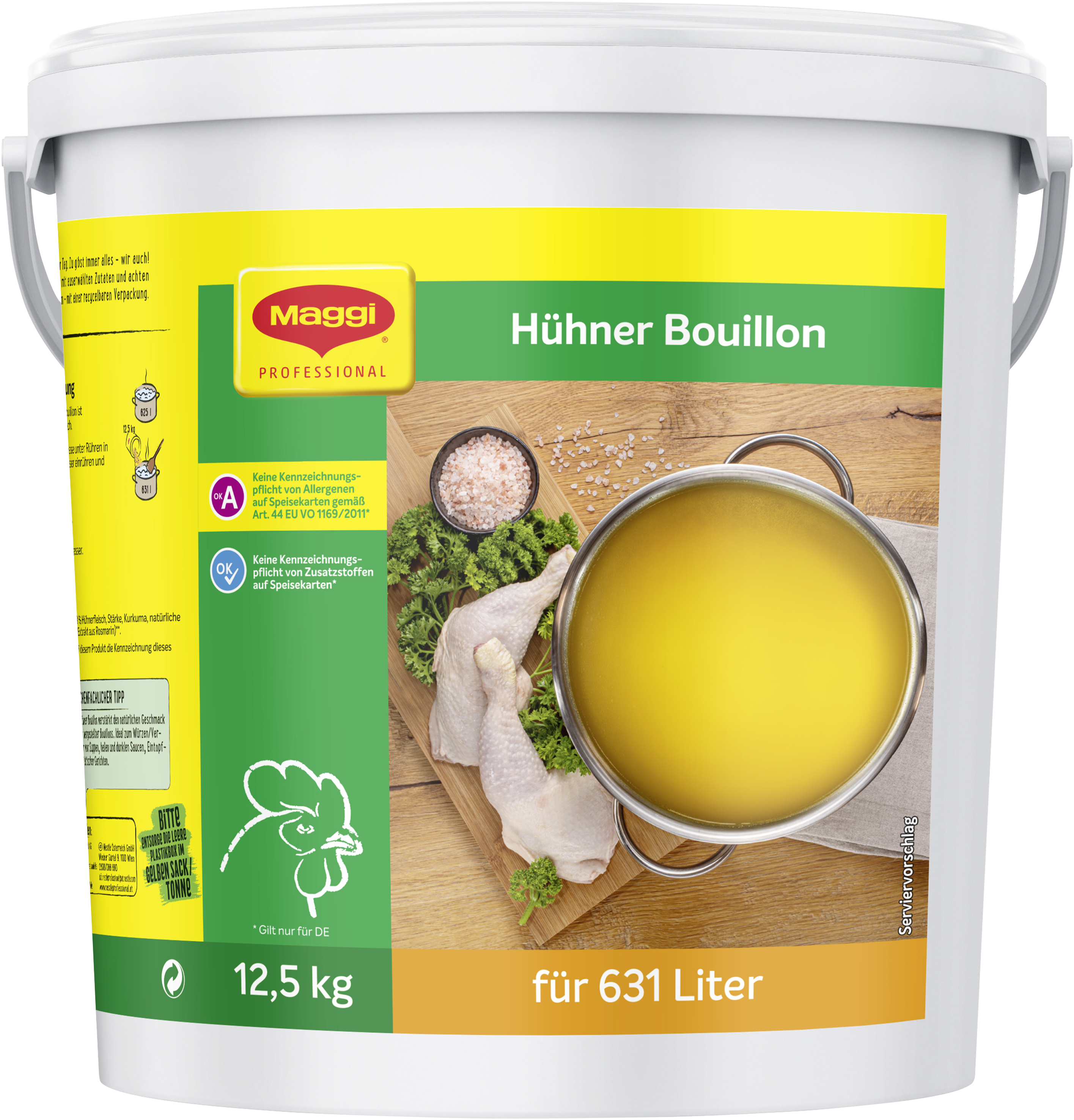 | Product Description | MAGGI Hühner Bouillon ohne kennzeichnungspflichtige Allergene 12,5kg, für 631 Liter |