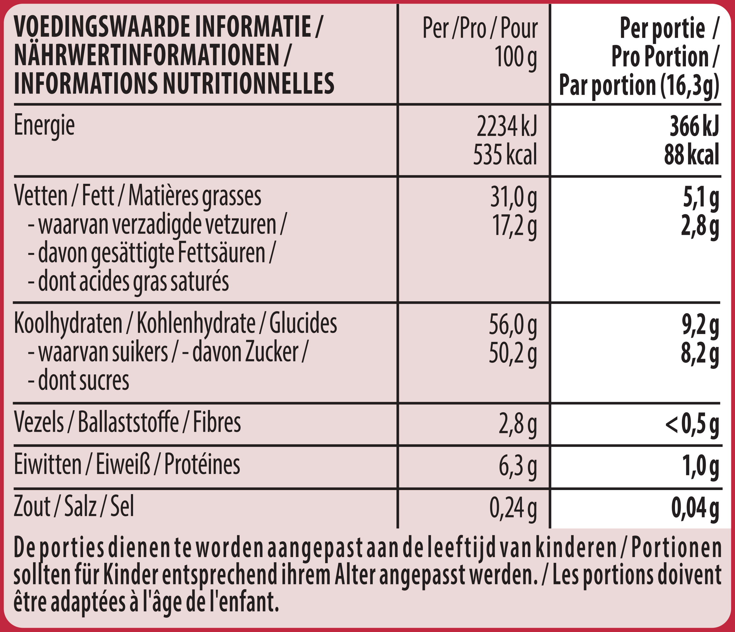 | 1. Nährwerte >>> | Zubereitungsgrad Bezugsgröße Portionsgröße Portionsgröße Beschreibung Tagesdosis Referenzwert Nährstoff: Teil von… Messgenauigkeit Nährwert % Messgenauigkeit % Referenzmenge UNPREPARED100GRMENER-EnergieAPPROXIMATELY2234kJ UNPREPARED100GRMENER-EnergieAPPROXIMATELY535kCal UNPREPARED100GRMFATFettAPPROXIMATELY31.0g UNPREPARED100GRMFASATFett, davon gesättigte FettsäurenAPPROXIMATELY17.2g UNPREPARED100GRMCHOAVLKohlenhydrateAPPROXIMATELY56.0g UNPREPARED100GRMSUGAR-Kohlenhydrate, davon ZuckerAPPROXIMATELY50.2g UNPREPARED100GRMFIBTGBallaststoffeAPPROXIMATELY2.8g UNPREPARED100GRMPRO-EiweißAPPROXIMATELY6.3g UNPREPARED100GRMSALTEQSalz ÄquivalentAPPROXIMATELY0.24g |