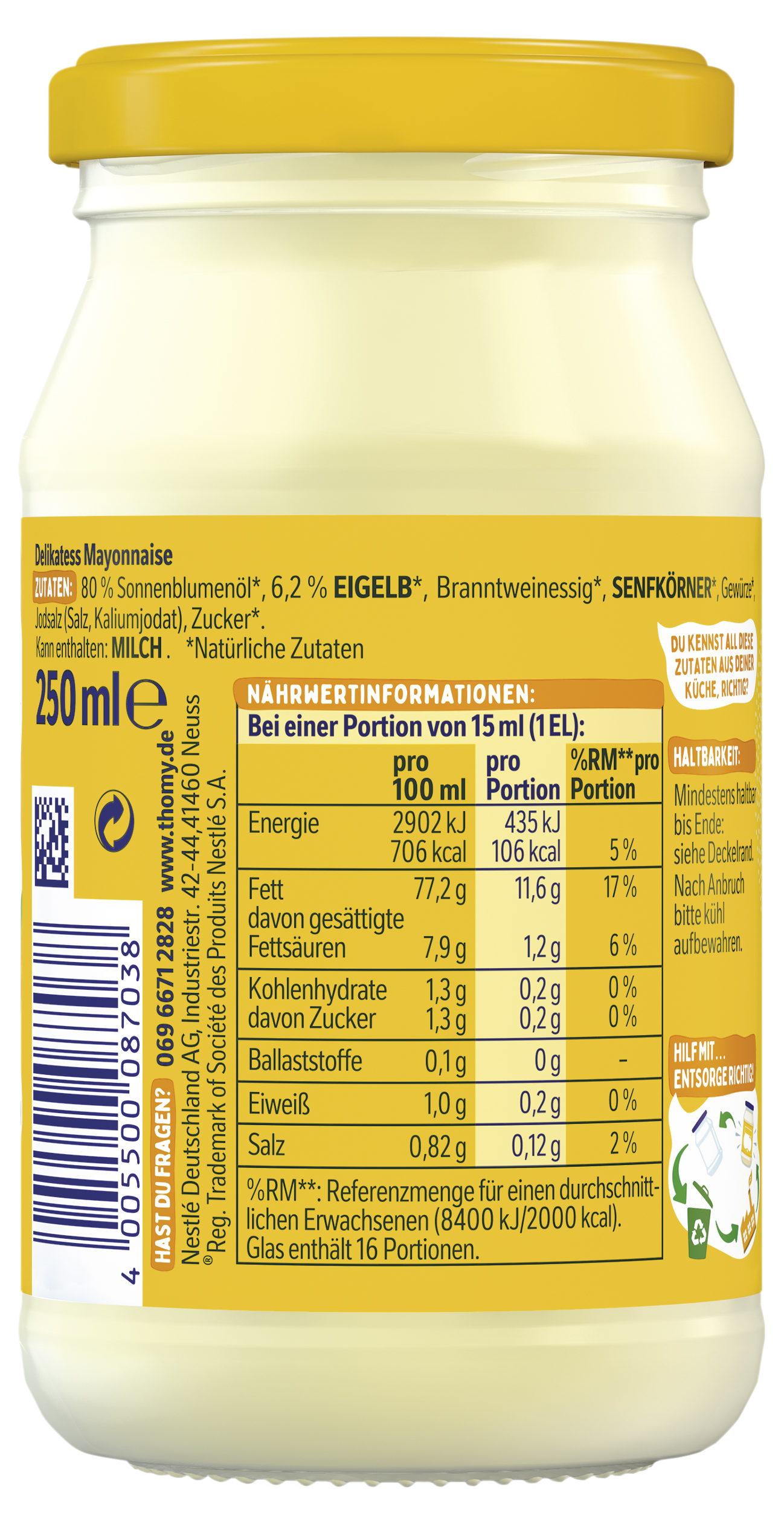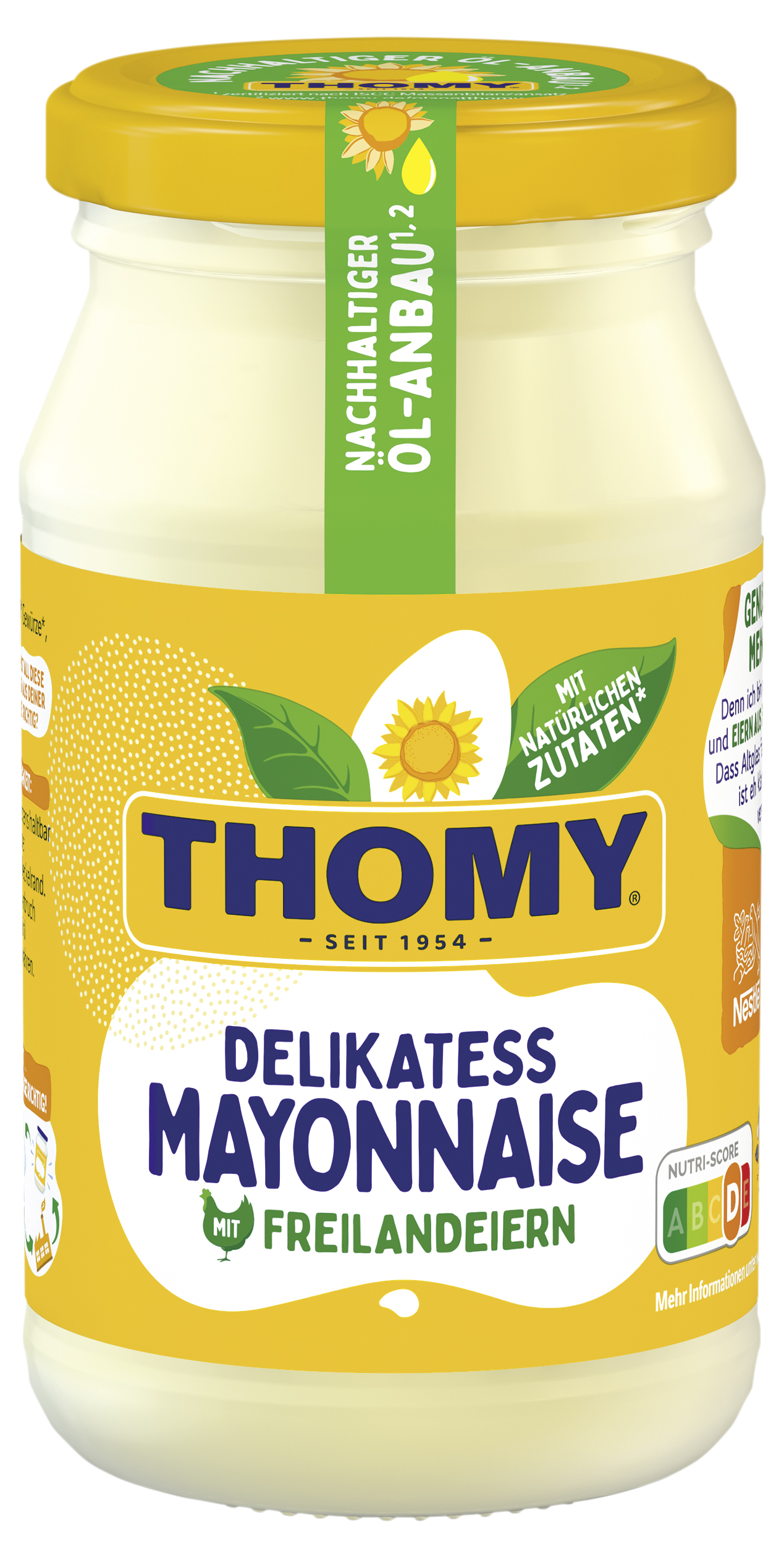 | Marketing Message | Genuss liegt in meiner Natur Für den vollen Geschmack: Deckel ab. Denn ich bin mit natürlichen Zutaten* und Eiern aus Freilandhaltung gemacht. Dass Altglas fast zu 100% recycelbar ist, ist eh klar. Und einen Teil davon verwenden wir selbst auch wieder. Schmeckt und fühlt sich gut an. • Mit Eiern aus Freilandhaltung • Mit natürlichen Zutaten • Ohne Konservierungsstoffe, Farb- oder Aromastoffe • Mit reinem Sonnenblumenöl und besonders cremig-lecker • Nutri-Score D • Recycelbare Verpackung: Altglas ist fast zu 100 % recycelbar • Ideal für Kartoffel- und Nudelsalate, Sandwiches, Pommes und noch vieles mehr THOMY… hier kommt der Genuss In höchster THOMY-Qualität Der Nutri-Score ist ein freiwilliges Kennzeichnungssystem, das als Orientierungshilfe dient, Lebensmittel nach ihrer Nährwertqualität zu bewerten. Verbraucher können mithilfe der fünfstufigen und farbig hinterlegten Buchstabenskala das Nährwertprofil eines Produkts erkennen. |