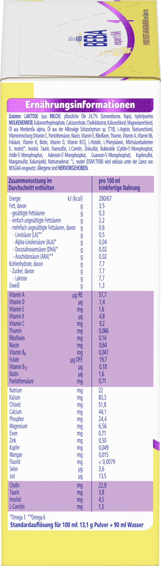 | Ingredient List | Zutaten: LAKTOSE (aus MILCH), pflanzliche Öle 24,7%, (Sonnenblume, Raps), hydrolysiertes MOLKENEIWEISS, Kaliumorthophosphate, Calciumcitrate, Cholinbitartrat, Kaliumchlorid, Magnesiumchlorid, Öl aus Mortierella alpina, Öl aus der Mikroalge Schizochytrium sp. (T18), L-Arginin, Natriumchlorid, Vitaminmischung (Vitamin C, Pantothensäure, Niacin, Vitamin E, Riboflavin, Thiamin, Vitamin A, Vitamin B6, Folsäure, Vitamin K, Biotin, Vitamin D, Vitamin B12), L-Histidin, L-Phenylalanin, Milchsäurebakterien (L. reuteri)*, Inositol, Taurin, Eisensulfat, L-Carnitin, Zinksulfat, Nukleotide (Cytidin-5'-Monophosphat, Uridin-5'-Monophosphat, Adenosin-5'-Monophosphat, Guanosin-5'-Monophosphat), Kupfersulfat, Mangansulfat, Kaliumjodid, Natriumselenat. *L. reuteri (DSM17938) wird exklusiv unter der Lizenz von BIOGAIA eingesetzt. |