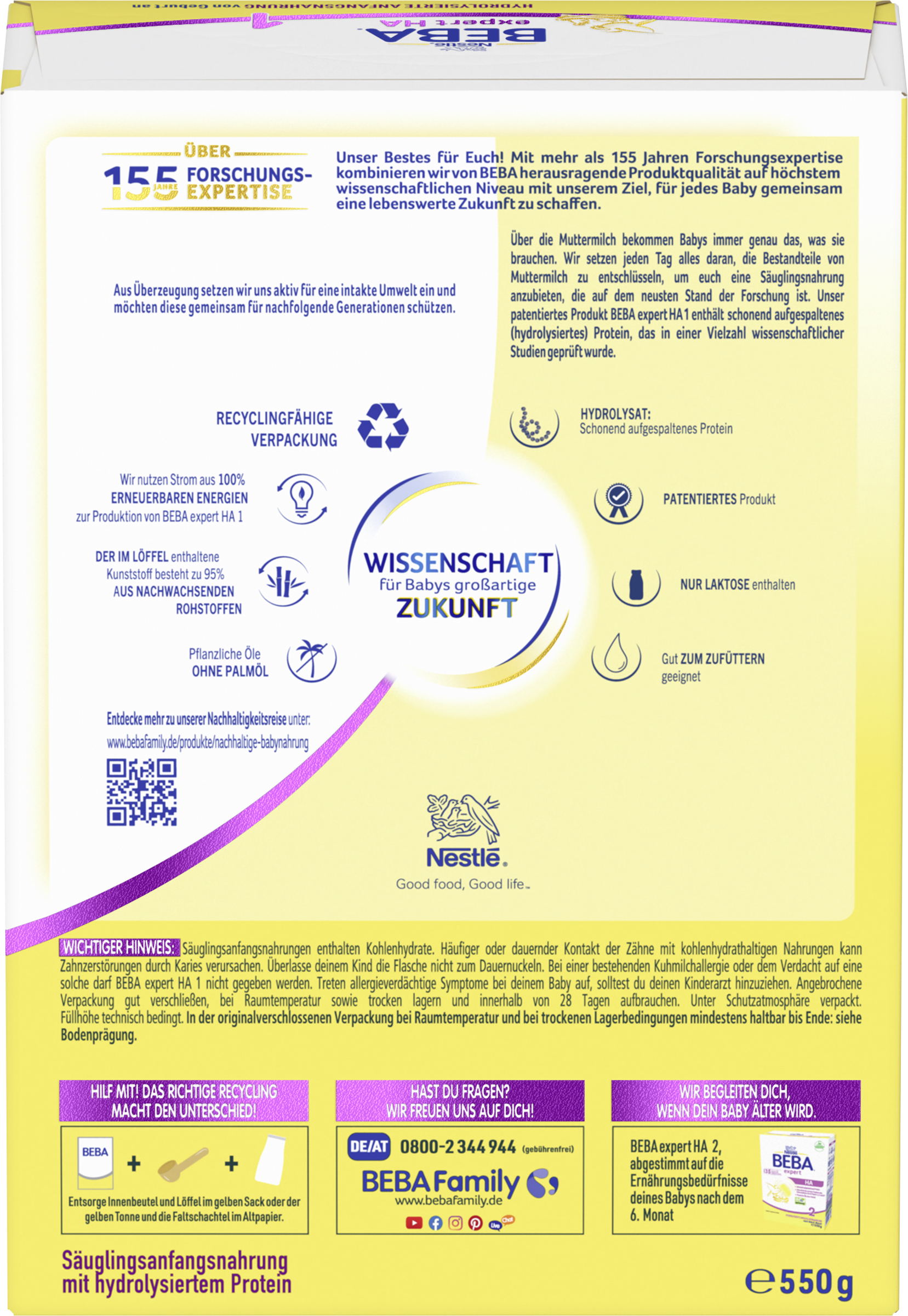 | Marketing Message | Über die Muttermilch bekommen Babys immer genau das, was sie brauchen. Daher setzen wir alles daran, die Bestandteile von Muttermilch zu entschlüsseln. BEBA expert HA 1 enthält schonend aufgespaltenes Protein, nur Laktose und ist als alleinige Nahrung, wenn nicht gestillt wird, von Geburt an geeignet. BEBA expert HA 1 Anfangsnahrung ist als hydrolysierte Anfangsnahrung auf die besonderen Ernährungsbedürfnisse deines Babys von Geburt an abgestimmt: • Schonend hydrolysiertes Protein, Hydrolysat wissenschaftlich geprüft • Pflanzliche Öle ohne Palmöl • Patentiertes Produkt • Gut zum Zufüttern oder als alleinige Säuglingsnahrung, wenn nicht gestillt wird, solange du deinem Baby eine Anfangsnahrung geben möchtest • Erfinder der HA-Nahrung: BEBA ist seit über 35 Jahre Pionier in der Proteinforschung und hat weltweit die erste HA-Nahrung eingeführt |