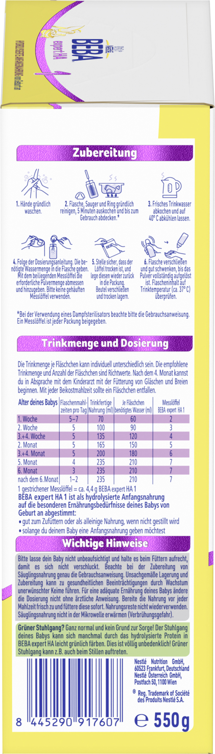 | Consumer Usage Instructions | Trinkmenge und Dosierung: Die Trinkmenge je Fläschchen kann individuell unterschiedlich sein. Die empfohlene Trinkmenge und Anzahl der Fläschchen sind Richtwerte. Nach dem 4. Monat kannst du in Absprache mit dem Kinderarzt mit der Fütterung von Gläschen und Breien beginnen. Mit jeder Beikostmahlzeit sollte ein Fläschchen entfallen. - Alter deines Babys: 1. Woche, Flaschenmahlzeiten pro Tag: 5-7, Trinkfertige Nahrung: 70ml, Je Fläschchen benötigtes Wasser: 60ml, Messlöffel BEBA expert HA 1: 2 - Alter deines Babys: 2. Woche, Flaschenmahlzeiten pro Tag: 5, Trinkfertige Nahrung: 100ml, Je Fläschchen benötigtes Wasser: 90ml, Messlöffel BEBA expert HA 1: 3 - Alter deines Babys: 3.+4. Woche, Flaschenmahlzeiten pro Tag: 5, Trinkfertige Nahrung: 135ml, Je Fläschchen benötigtes Wasser: 120ml, Messlöffel BEBA expert HA 1: 4 - Alter deines Babys: 2. Monat, Flaschenmahlzeiten pro Tag: 5, Trinkfertige Nahrung: 165ml, Je Fläschchen benötigtes Wasser: 150ml, Messlöffel BEBA expert HA 1: 5 - Alter deines Babys: 3.+4. Monat, Flaschenmahlzeiten pro Tag: 5, Trinkfertige Nahrung: 200ml, Je Fläschchen benötigtes Wasser: 180ml, Messlöffel BEBA expert HA 1: 6 - Alter deines Babys: 5. Monat, Flaschenmahlzeiten pro Tag: 4, Trinkfertige Nahrung: 235ml, Je Fläschchen benötigtes Wasser: 210ml, Messlöffel BEBA expert HA 1: 7 - Alter deines Babys: 6. Monat, Flaschenmahlzeiten pro Tag: 3, Trinkfertige Nahrung: 235ml, Je Fläschchen benötigtes Wasser: 210ml, Messlöffel BEBA expert HA 1: 7 - Alter deines Babys: nach dem 6. Monat, Flaschenmahlzeiten pro Tag: 1-2, Trinkfertige Nahrung: 235ml, Je Fläschchen benötigtes Wasser: 210ml, Messlöffel BEBA expert HA 1: 7 1 gestrichener Messlöffel = ca. 4,4 g BEBA expert HA 1 Standardauflösung für 100ml: 13,1g Pulver + 90ml Wasser |