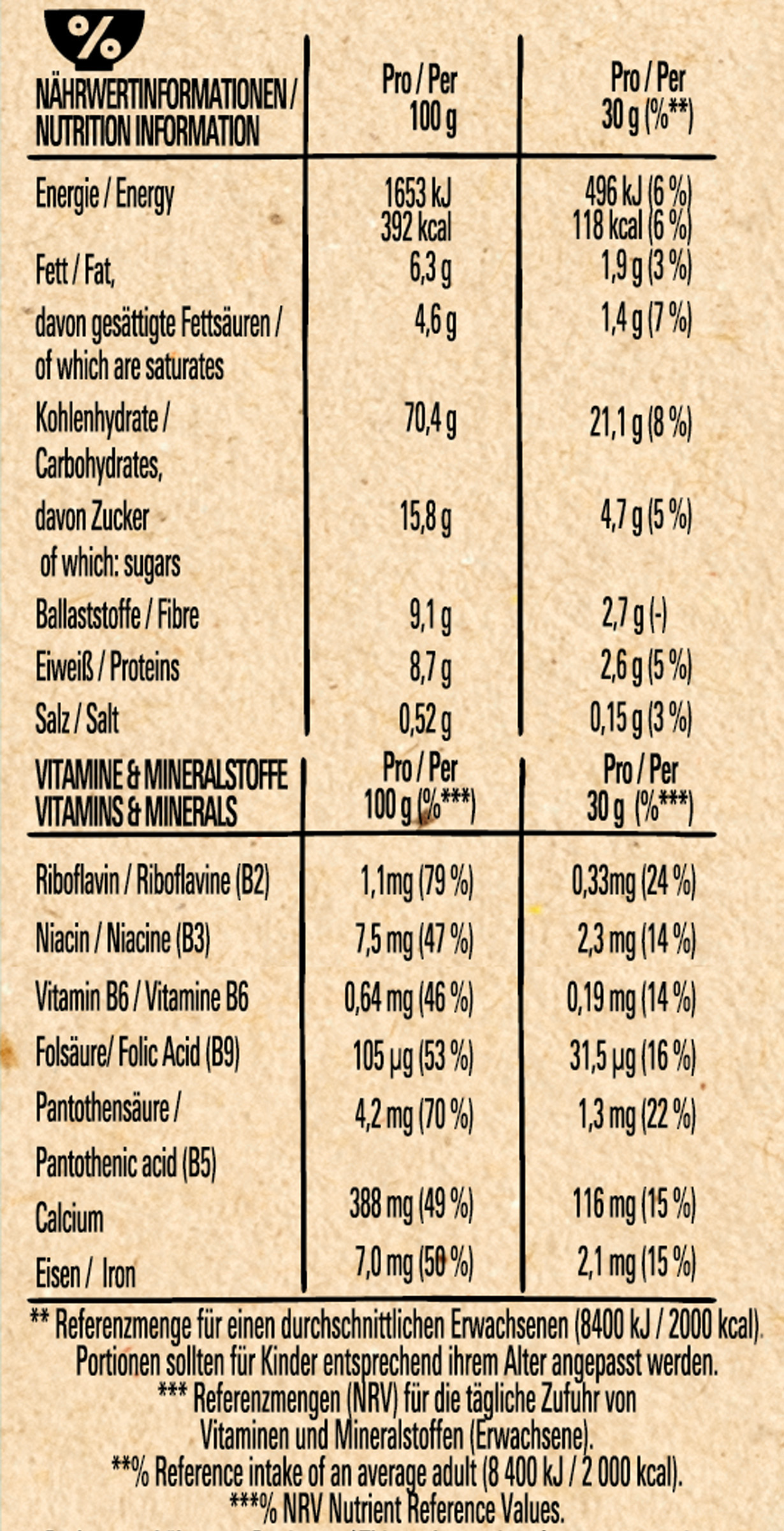 | 2. Nährwerte >>> | Zubereitungsgrad Bezugsgröße Portionsgröße Portionsgröße Beschreibung Tagesdosis Referenzwert Nährstoff: Teil von… Messgenauigkeit Nährwert % Messgenauigkeit % Referenzmenge UNPREPARED1PTN30GRMReferenzmenge für einen durchschnittlichen Erwachsenen (8400 kJ/ 2000 kcal).#Referenzmengen (NRV) für die tägliche Zufuhr von Vitaminen und Mineralstoffen (Erwachsene).ENER-EnergieAPPROXIMATELY496kJ6 UNPREPARED1PTN30GRMReferenzmenge für einen durchschnittlichen Erwachsenen (8400 kJ/ 2000 kcal).#Referenzmengen (NRV) für die tägliche Zufuhr von Vitaminen und Mineralstoffen (Erwachsene).ENER-EnergieAPPROXIMATELY118kCal6 UNPREPARED1PTN30GRMReferenzmenge für einen durchschnittlichen Erwachsenen (8400 kJ/ 2000 kcal).#Referenzmengen (NRV) für die tägliche Zufuhr von Vitaminen und Mineralstoffen (Erwachsene).FATFettAPPROXIMATELY1.9g3 UNPREPARED1PTN30GRMReferenzmenge für einen durchschnittlichen Erwachsenen (8400 kJ/ 2000 kcal).#Referenzmengen (NRV) für die tägliche Zufuhr von Vitaminen und Mineralstoffen (Erwachsene).FASATFett, davon gesättigte FettsäurenAPPROXIMATELY1.4g7 UNPREPARED1PTN30GRMReferenzmenge für einen durchschnittlichen Erwachsenen (8400 kJ/ 2000 kcal).#Referenzmengen (NRV) für die tägliche Zufuhr von Vitaminen und Mineralstoffen (Erwachsene).CHOAVLKohlenhydrateAPPROXIMATELY21.1g8 UNPREPARED1PTN30GRMReferenzmenge für einen durchschnittlichen Erwachsenen (8400 kJ/ 2000 kcal).#Referenzmengen (NRV) für die tägliche Zufuhr von Vitaminen und Mineralstoffen (Erwachsene).SUGAR-Kohlenhydrate, davon ZuckerAPPROXIMATELY4.7g5 UNPREPARED1PTN30GRMReferenzmenge für einen durchschnittlichen Erwachsenen (8400 kJ/ 2000 kcal).#Referenzmengen (NRV) für die tägliche Zufuhr von Vitaminen und Mineralstoffen (Erwachsene).FIBTGBallaststoffeAPPROXIMATELY2.7g UNPREPARED1PTN30GRMReferenzmenge für einen durchschnittlichen Erwachsenen (8400 kJ/ 2000 kcal).#Referenzmengen (NRV) für die tägliche Zufuhr von Vitaminen und Mineralstoffen (Erwachsene).PRO-EiweißAPPROXIMATELY2.6g5 UNPREPARED1PTN30GRMReferenzmenge für einen durchschnittlichen Erwachsenen (8400 kJ/ 2000 kcal).#Referenzmengen (NRV) für die tägliche Zufuhr von Vitaminen und Mineralstoffen (Erwachsene).SALTEQSalz ÄquivalentAPPROXIMATELY0.15g3 UNPREPARED1PTN30GRMReferenzmenge für einen durchschnittlichen Erwachsenen (8400 kJ/ 2000 kcal).#Referenzmengen (NRV) für die tägliche Zufuhr von Vitaminen und Mineralstoffen (Erwachsene).RIBFVitamin B 2, RiboflavinAPPROXIMATELY0.33mg24 UNPREPARED1PTN30GRMReferenzmenge für einen durchschnittlichen Erwachsenen (8400 kJ/ 2000 kcal).#Referenzmengen (NRV) für die tägliche Zufuhr von Vitaminen und Mineralstoffen (Erwachsene).NIANiacinAPPROXIMATELY2.3mg14 UNPREPARED1PTN30GRMReferenzmenge für einen durchschnittlichen Erwachsenen (8400 kJ/ 2000 kcal).#Referenzmengen (NRV) für die tägliche Zufuhr von Vitaminen und Mineralstoffen (Erwachsene).VITB6-Vitamin B 6APPROXIMATELY0.19mg14 UNPREPARED1PTN30GRMReferenzmenge für einen durchschnittlichen Erwachsenen (8400 kJ/ 2000 kcal).#Referenzmengen (NRV) für die tägliche Zufuhr von Vitaminen und Mineralstoffen (Erwachsene).FOLDFEFOLDEisenAPPROXIMATELY31.5μg16 UNPREPARED1PTN30GRMReferenzmenge für einen durchschnittlichen Erwachsenen (8400 kJ/ 2000 kcal).#Referenzmengen (NRV) für die tägliche Zufuhr von Vitaminen und Mineralstoffen (Erwachsene).PANTACPantothensäureAPPROXIMATELY1.3mg22 UNPREPARED1PTN30GRMReferenzmenge für einen durchschnittlichen Erwachsenen (8400 kJ/ 2000 kcal).#Referenzmengen (NRV) für die tägliche Zufuhr von Vitaminen und Mineralstoffen (Erwachsene).CACalciumAPPROXIMATELY116mg15 UNPREPARED1PTN30GRMReferenzmenge für einen durchschnittlichen Erwachsenen (8400 kJ/ 2000 kcal).#Referenzmengen (NRV) für die tägliche Zufuhr von Vitaminen und Mineralstoffen (Erwachsene).FEEisenAPPROXIMATELY2.1mg15 |