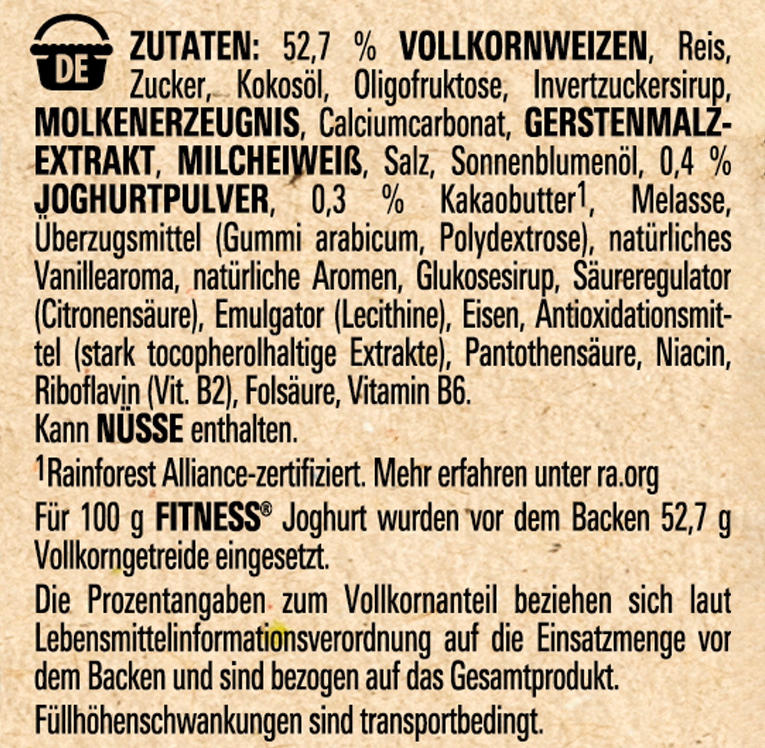 | Ingredient List | Zutaten: 52,7% VOLLKORNWEIZEN, Reis, Zucker, Kokosöl, Oligofruktose, Invertzuckersirup, MOLKENERZEUGNIS, Calciumcarbonat, GERSTENMALZEXTRAKT, MILCHEIWEISS, Salz, Sonnenblumenöl, 0,4 % JOGHURTPULVER, 0,3% Kakaobutter*, Melasse, Überzugsmittel (Gummi arabicum, Polydextrose), natürliches Vanillearoma, natürliche Aromen, Glukosesirup, Säureregulator (Citronensäure), Emulgator (Lecithine), Eisen, Antioxidationsmittel (stark tocopherolhaltige Extrakte), Pantothensäure, Niacin, Riboflavin (Vit. B2), Folsäure, Vitamin B6. Kann NÜSSE enthalten. *Rainforest Alliance-zertifiziert. |