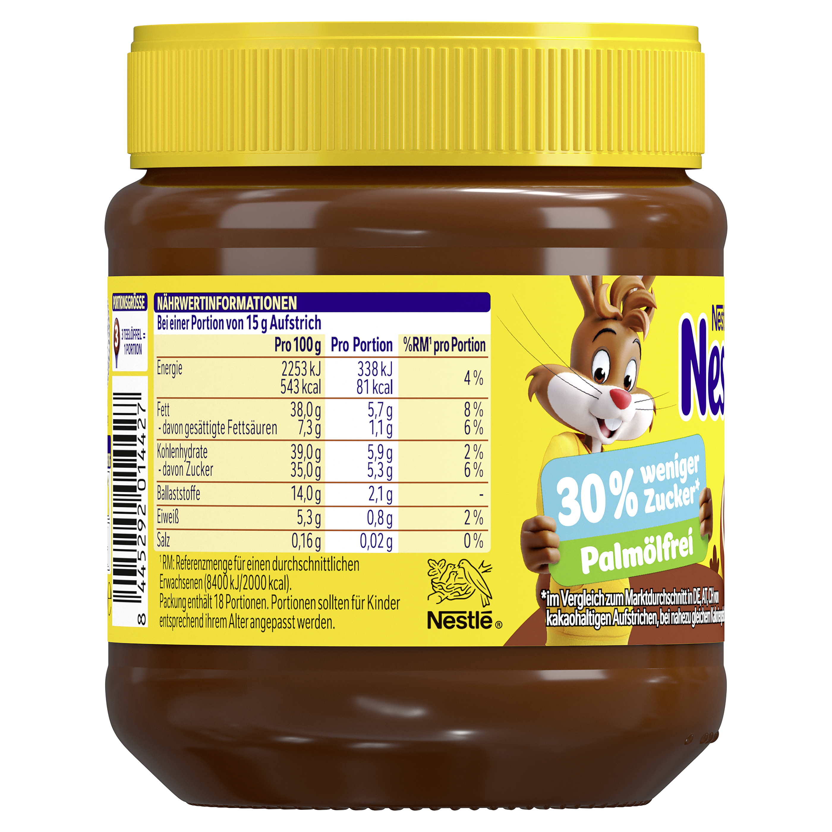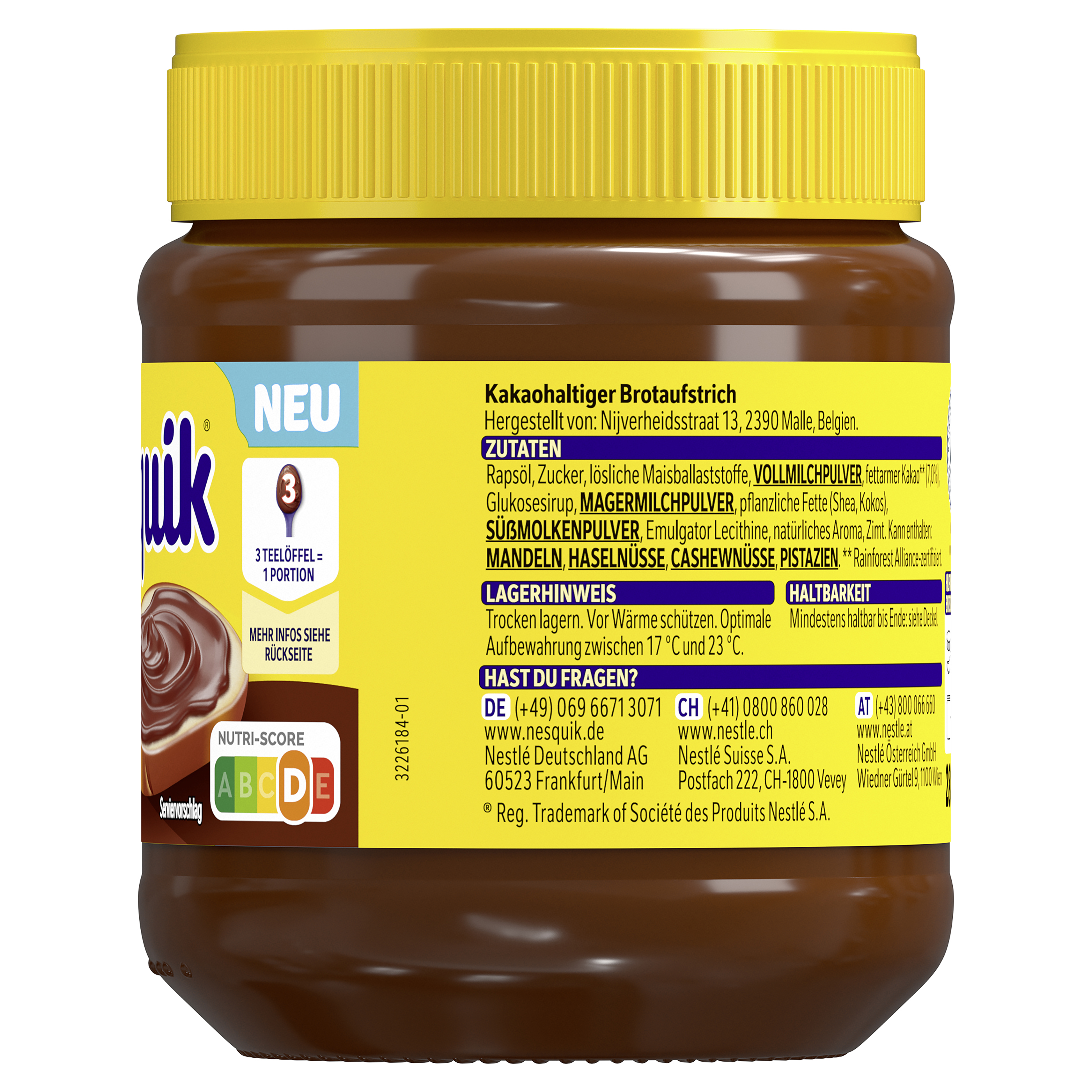 | Marketing Message | Starte den Tag mit einem Lächeln und dem unwiderstehlichen Geschmack von Nestlé Nesquik Brotaufstrich! Dieser cremige Brotaufstrich bringt den beliebten Nestlé Nesquik Kakao-Genuss direkt auf dein Frühstücksbrot. Ideal für die ganze Familie, verwandelt er jedes Brot in ein leckeres Frühstückserlebnis. Cremiger Nestlé Nesquik Brotaufstrich: - 30% weniger Zucker* - Palmölfrei hergestellt - Cremiger Aufstrich mit dem beliebten Nesquik Geschmack Vertraue auf die Nestlé Nesquik Qualität für hochwertigen Kakaogenuss. * Im Vergleich zum Marktdurchschnitt in DE, AT, CH von kakaohaltigen Aufstrichen, bei nahezu gleichem Kaloriengehalt. |