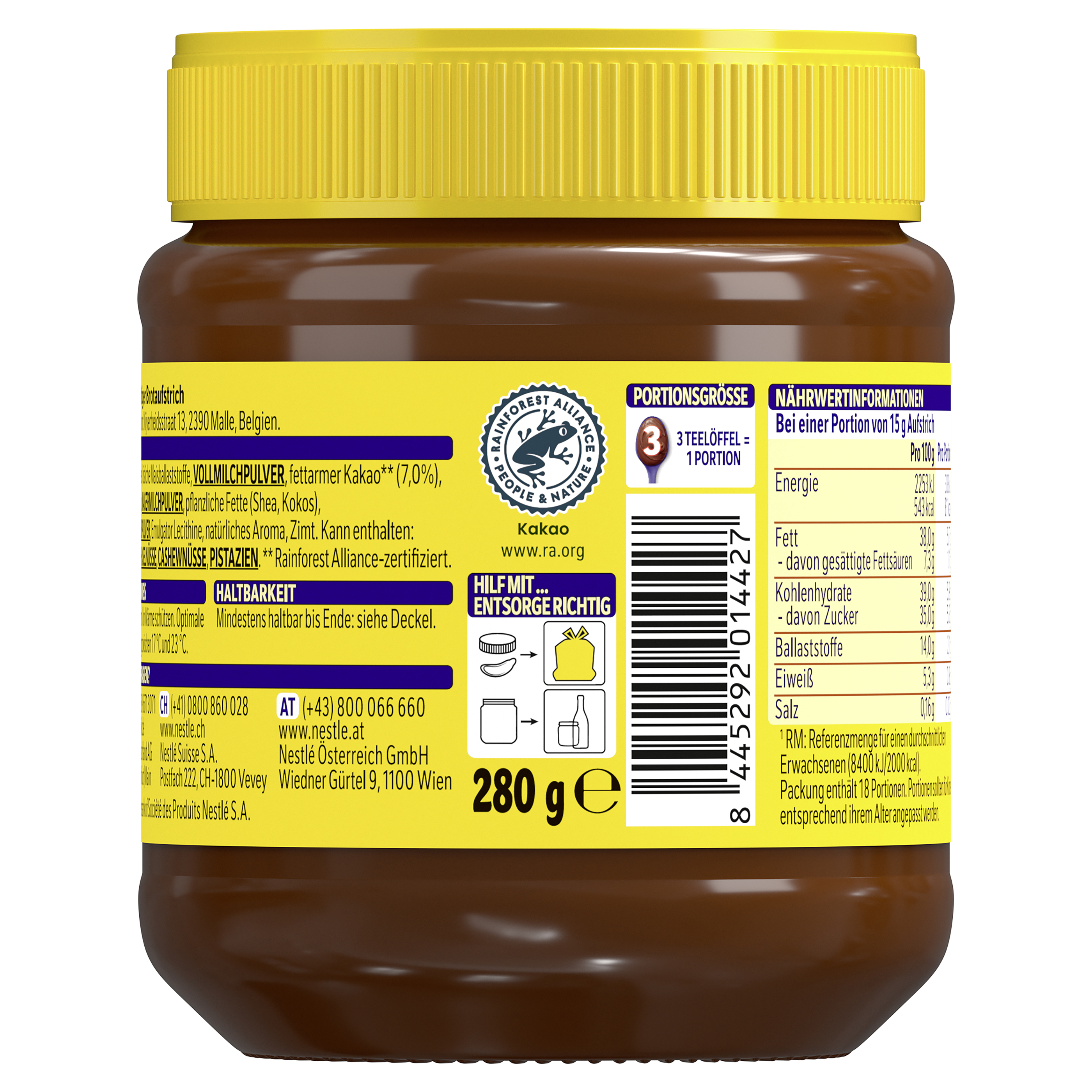 | Ingredient List | Zutaten: Rapsöl, Zucker, lösliche Maisballaststoffe, VOLLMILCHPULVER, fettarmer Kakao** (7,0%), Glukosesirup, MAGERMILCHPULVER, pflanzliche Fette (Shea, Kokos), SÜSSMOLKENPULVER, Emulgator Lecithine, natürliches Aroma, Zimt. Kann enthalten: MANDELN, HASELNÜSSE, CASHEWNÜSSE, PISTAZIEN. **Rainforest Alliance-zertifiziert. |