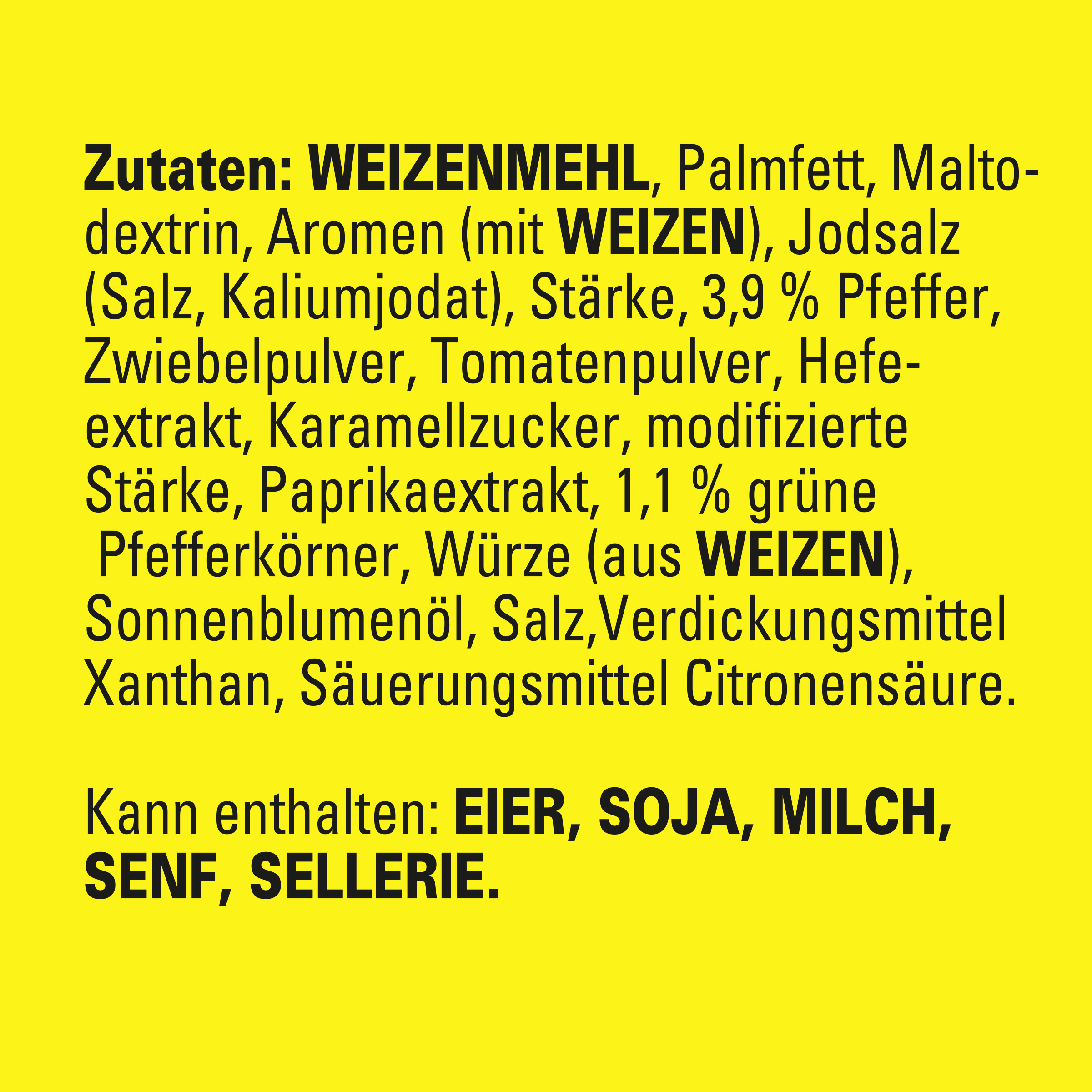 | Ingredient List | Zutaten: WEIZENMEHL, Palmfett, Maltodextrin, Aromen (mit WEIZEN), Jodsalz (Salz, Kaliumjodat), Stärke, 3,9% Pfeffer, Zwiebelpulver, Tomatenpulver, Hefeextrakt, Karamellzucker, modifizierte Stärke, Paprikaextrakt, 1,1% grüne Pfefferkörner, Würze (aus WEIZEN), Sonnenblumenöl, Salz, Verdickungsmittel Xanthan, Säuerungsmittel Citronensäure. Kann enthalten: EIER, SOJA, MILCH, SENF, SELLERIE. |