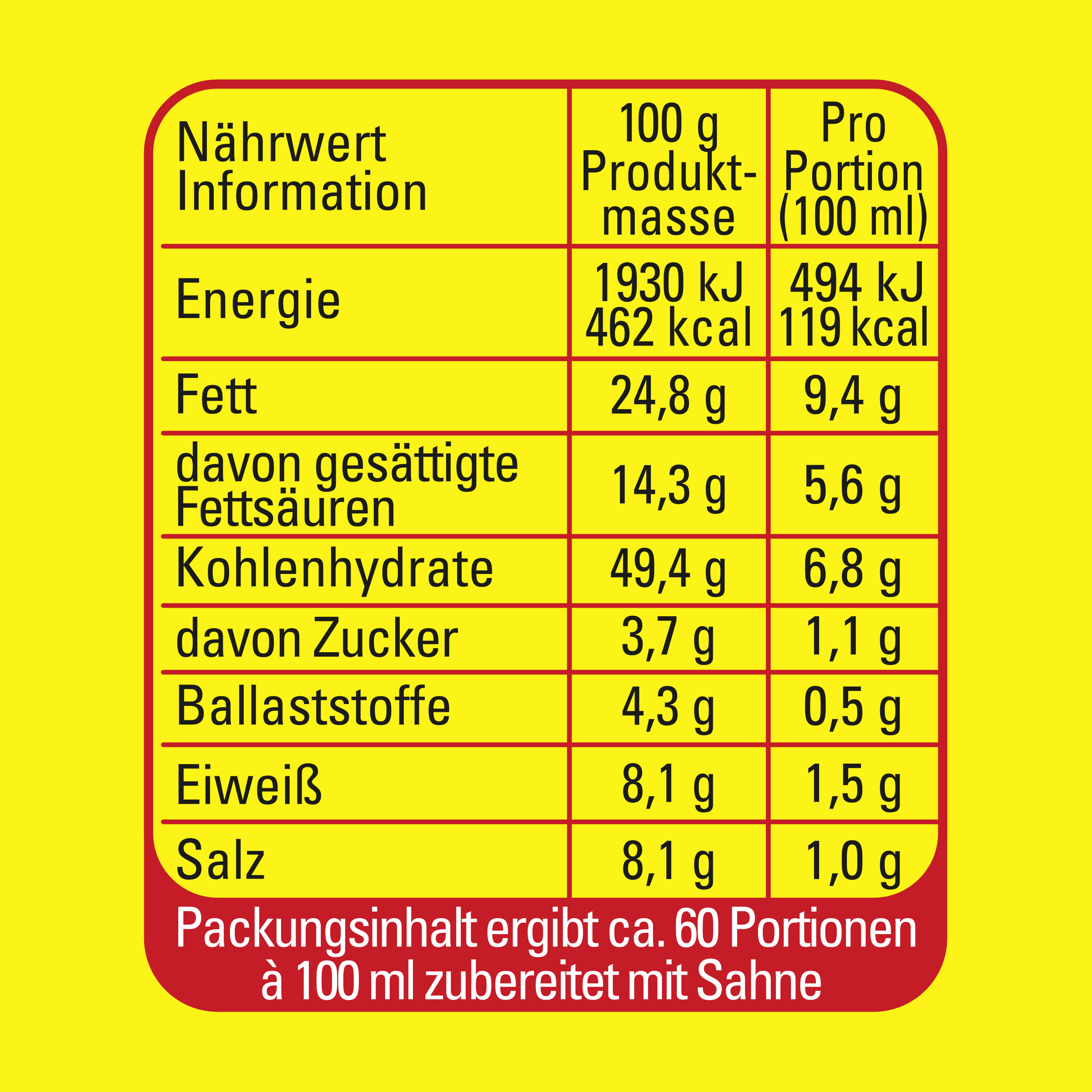 | Preparation Instructions | Zubereitung: 1. Wasser und Sahne aufkochen. Energie abstellen. 2. Produktmasse einrühren und aufwallen lassen. 3. Kochzeit 3 Minuten, gelegentlich umrühren. Dosierung: 125 g für 800 ml Wasser und 200 ml Sahne. |