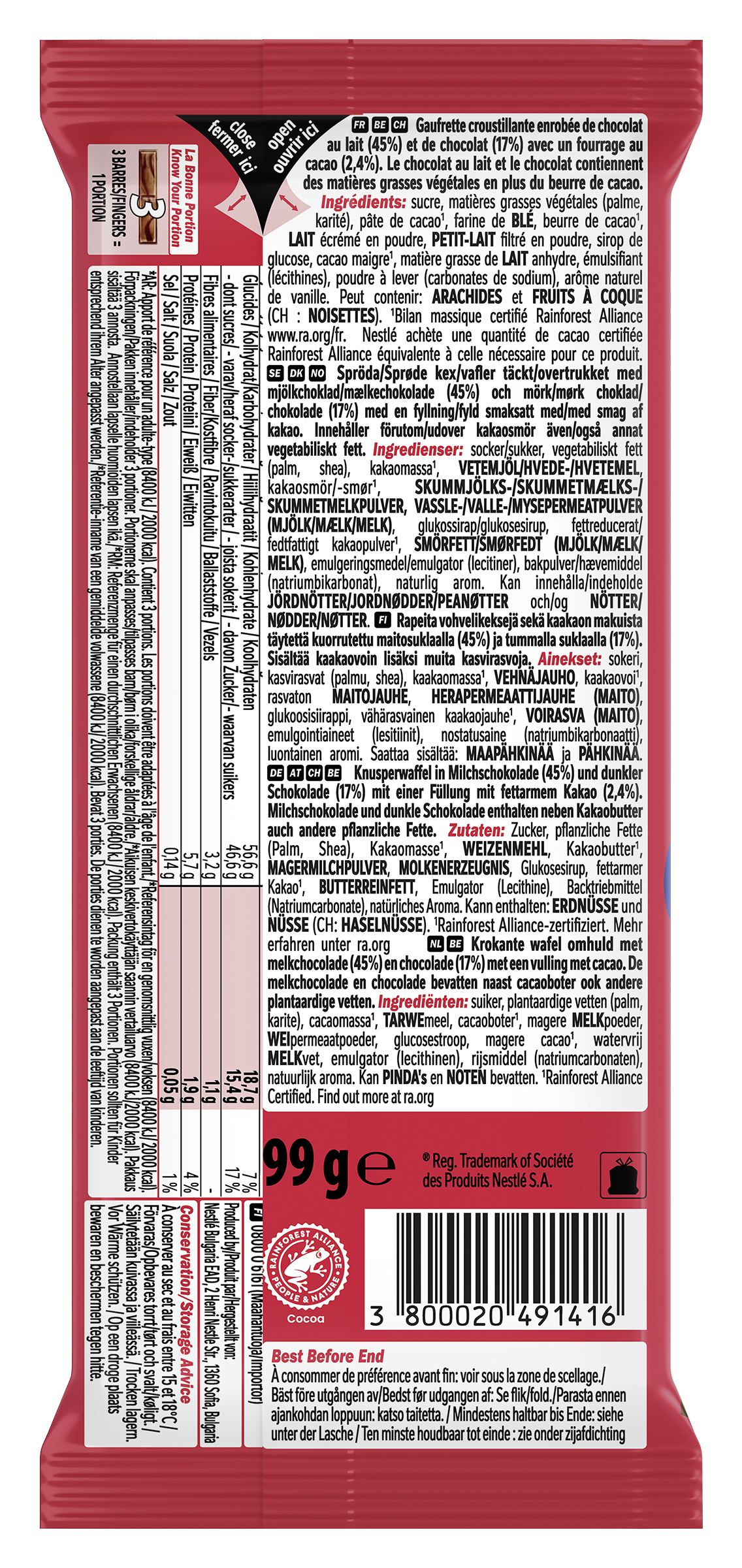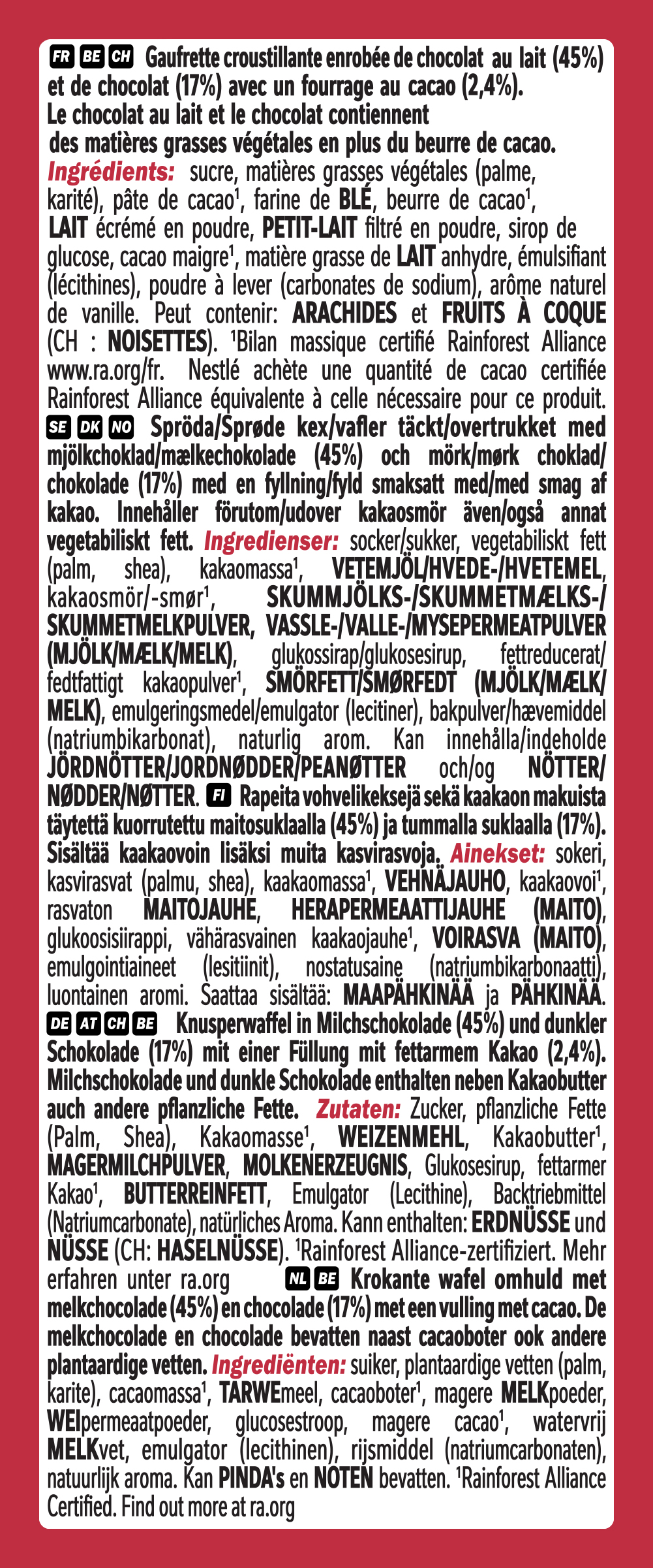 | Regulated Product Name | Knusperwaffel in Milchschokolade (45%) und dunkler Schokolade (17%) mit einer Füllung mit fettarmem Kakao (2,4%). |