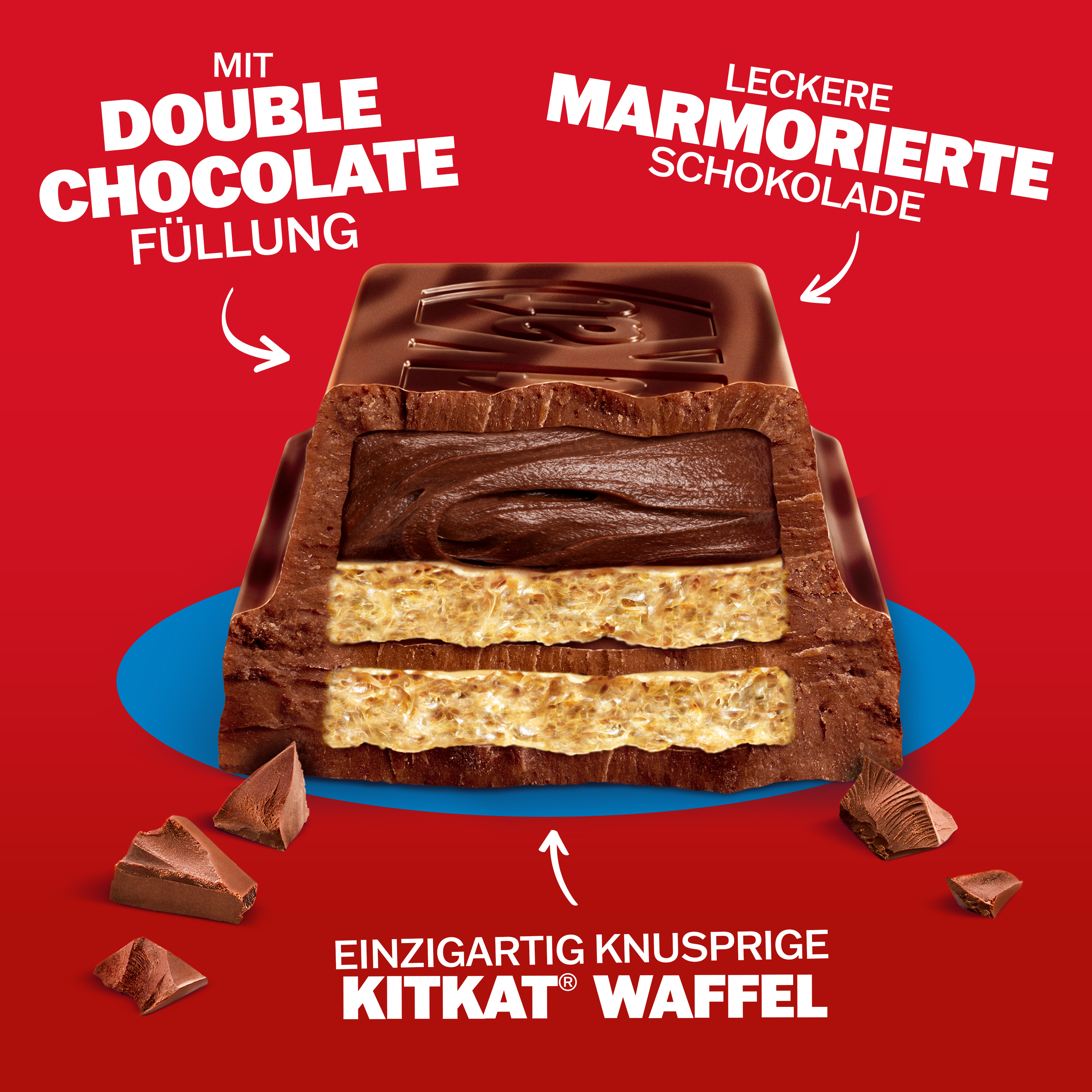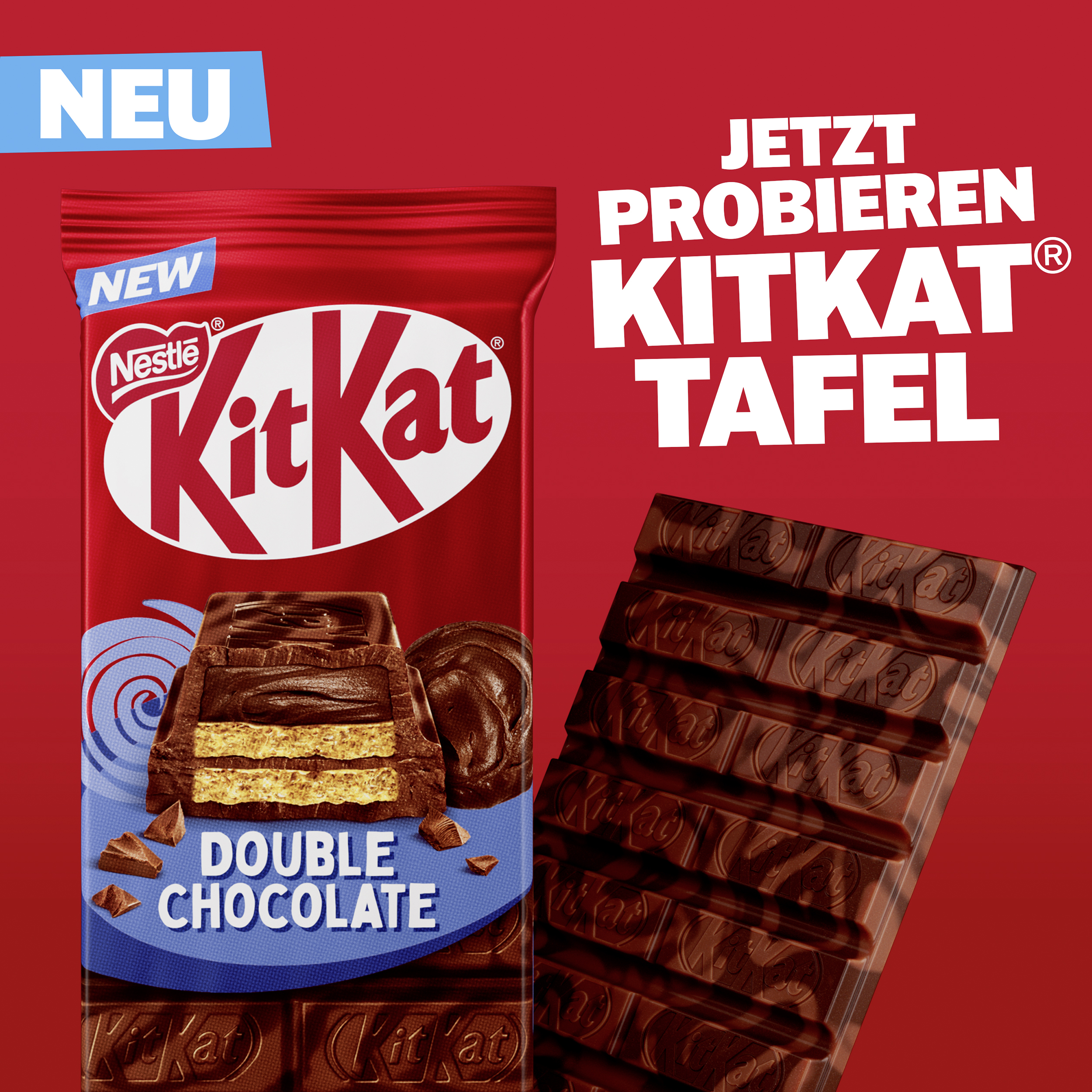 | Marketing Message | Have a break, have a KITKAT Die neue KITKAT Tafel Double Chocolate ist der ideale Snack für eine neue Art von Pause - ideal zum Teilen mit Freunden, alleine oder zu Hause. Seine einzigartige Kombination von leichter, knuspriger Waffel mit cremiger Schokoladen Füllung und leckerer marmorierter Schokolade macht die KITKAT Tafel zum idealen Pausensnack. Aber egal, ob man sie alleine oder gemeinsam genießt: eine entspannte Pause zu Hause mit der KITKAT Tafel Double Chocolate lädt den Akku wieder auf. Die knusprig luftige Waffel mit cremiger Schokoladen Füllung wird umhüllt von einer leckeren, marmorierten Schokolade. Diese Balance aus knusprig und zart schmeckt nicht nur großartig, sondern fühlt sich auch herrlich leicht an – also perfekt für Schokoladen-Fans und eine lässige Pause zwischendurch! |