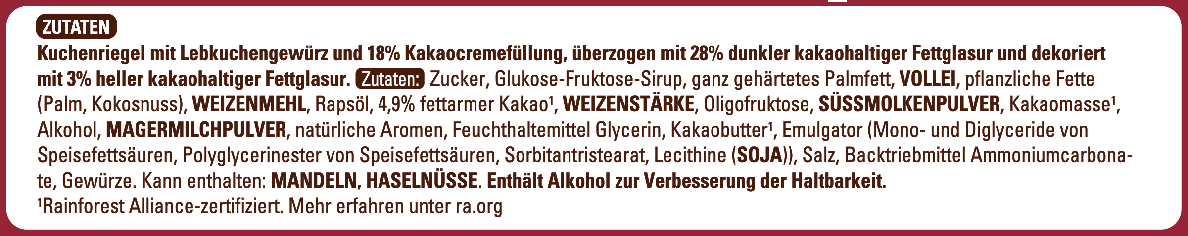 | Ingredient List | Zutaten: Zucker, Glukose-Fruktose-Sirup, gaz gehärtetes Palmfett, VOLLEI, pflanzliche Fette (Palm, Kokosnuss), WEIZENMEHL, Rapsöl, 49% fettarmer Kakao*, WEIZENSTÄRKE, Oligofruktose, SÜSSMOLKENPULVER, Kakaomasse*, Alkohol, MAGERMILCHPULVER, natürliche Aromen, Feuchthaltemittel Glycerin, Kakaobutter*, Emulgator (Mono- und Diglyceride von Speisefettsäuren, Polyglycerinester von Speisefettsäuren, Polyglycerinester von Speisefettsäuren, Sorbitantristearat, Lecithine (SOJA)), Salz, Backtriebmittel Ammoniumcarbonate, Gewürze. Kann enthalten: MANDELN, HASELNÜSSE. Enthält Alkohol zur Verbesserung der Haltbarkeit. *Rainforest Alliance-zertifiziert. |