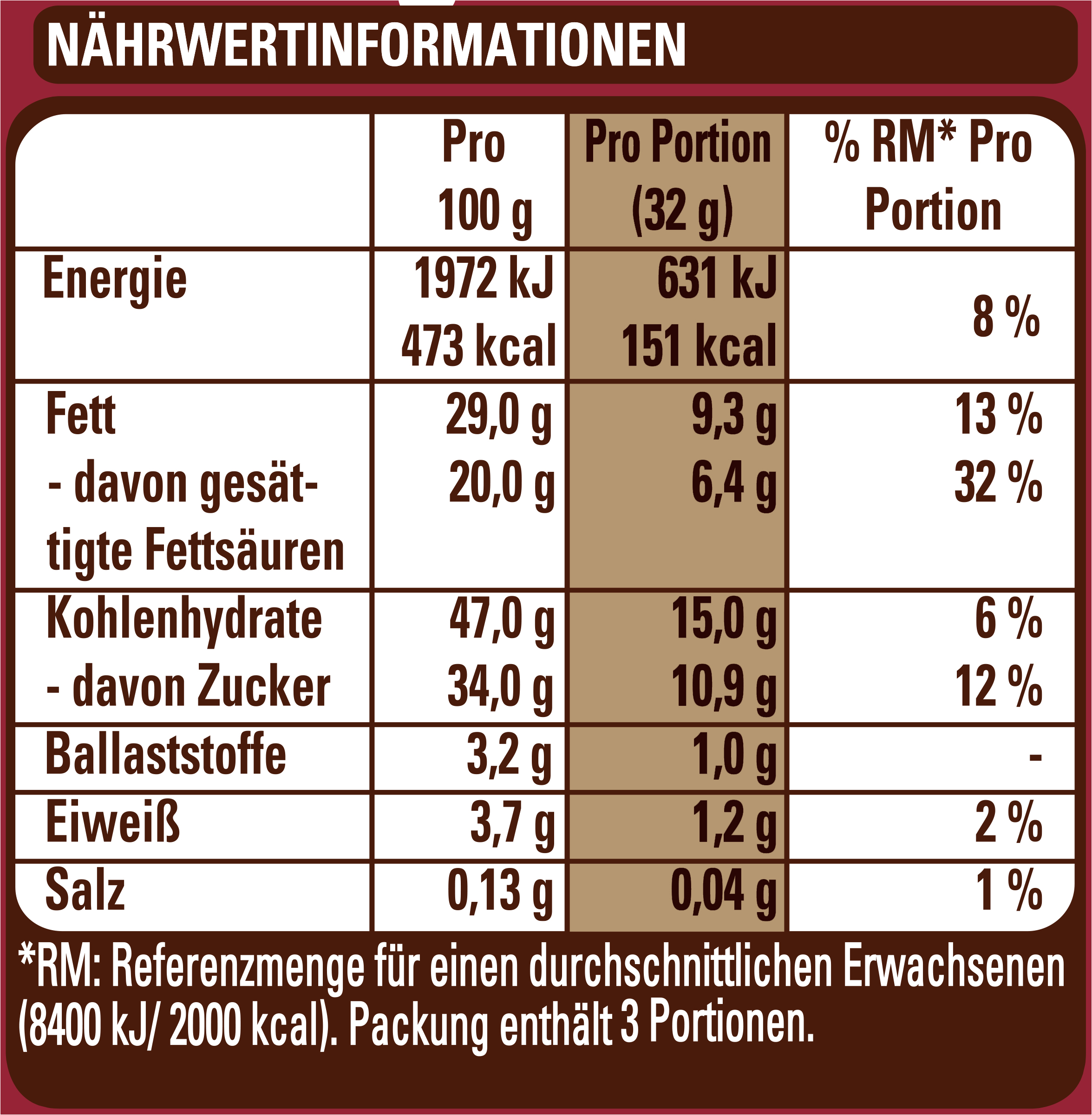 | 1. Nährwerte >>> | Zubereitungsgrad Bezugsgröße Portionsgröße Portionsgröße Beschreibung Tagesdosis Referenzwert Nährstoff: Teil von… Messgenauigkeit Nährwert % Messgenauigkeit % Referenzmenge UNPREPARED100GRMENER-EnergieAPPROXIMATELY1972kJ UNPREPARED100GRMENER-EnergieAPPROXIMATELY473kCal UNPREPARED100GRMFATFettAPPROXIMATELY29.0g UNPREPARED100GRMFASATFett, davon gesättigte FettsäurenAPPROXIMATELY20.0g UNPREPARED100GRMCHOAVLKohlenhydrateAPPROXIMATELY47.0g UNPREPARED100GRMSUGAR-Kohlenhydrate, davon ZuckerAPPROXIMATELY34.0g UNPREPARED100GRMFIBTGBallaststoffeAPPROXIMATELY3.2g UNPREPARED100GRMPRO-EiweißAPPROXIMATELY3.7g UNPREPARED100GRMSALTEQSalz ÄquivalentAPPROXIMATELY0.13g |