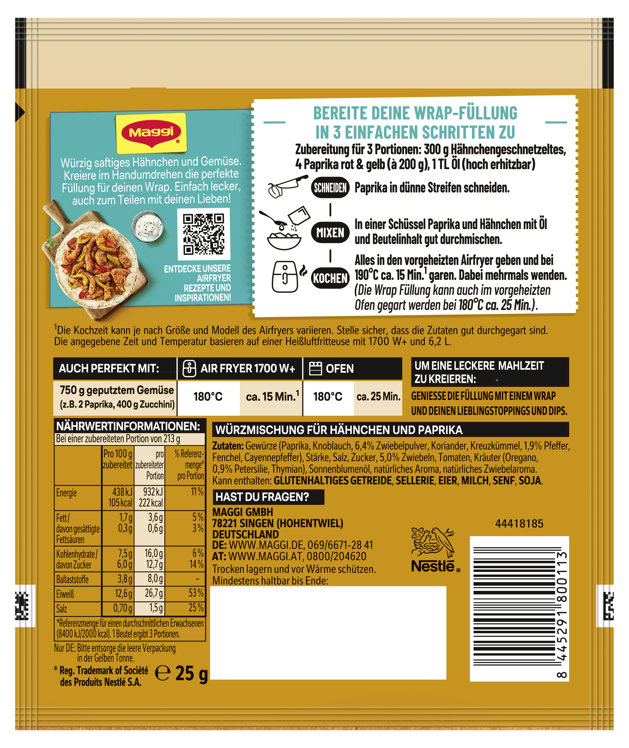 | Preparation Instructions | Zubereitung für 3 Portionen: 300 g Hähnchengeschnetzeltes, 4 Paprika rot & gelb (à 200 g), Paprika in dünne Streifen schneiden. In einer Schüssel Paprika und Hähnchen mit Öl und Beutelinhalt gut durchmischen. Alles in den vorgeheizten Airfryer geben und bei 190°C ca. 15 Min.* garen. Dabei mehrmals wenden. (Die Wrap Füllung kann auch im vorgeheizten Ofen gegart werden bei 180°C ca. 25 Min.) *Die Kochzeit kann je nach Größe und Modell des Airfryers variieren. Stelle sicher, dass die Zutaten gut durchgegart sind. Die angegebene Zeit und Temperatur basieren auf einer Heißluftfritteuse mit 1700W+ 6,2L. |
