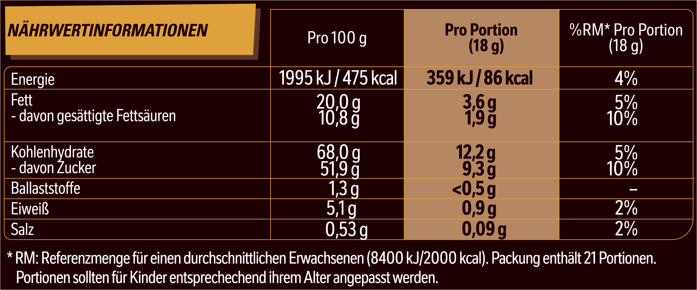 | 1. Nährwerte >>> | Zubereitungsgrad Bezugsgröße Portionsgröße Portionsgröße Beschreibung Tagesdosis Referenzwert Nährstoff: Teil von… Messgenauigkeit Nährwert % Messgenauigkeit % Referenzmenge UNPREPARED100GRMENER-EnergieAPPROXIMATELY1995kJ UNPREPARED100GRMENER-EnergieAPPROXIMATELY475kCal UNPREPARED100GRMFATFettAPPROXIMATELY20.0g UNPREPARED100GRMFASATFett, davon gesättigte FettsäurenAPPROXIMATELY10.8g UNPREPARED100GRMCHOAVLKohlenhydrateAPPROXIMATELY68.0g UNPREPARED100GRMSUGAR-Kohlenhydrate, davon ZuckerAPPROXIMATELY51.9g UNPREPARED100GRMFIBTGBallaststoffeAPPROXIMATELY1.3g UNPREPARED100GRMPRO-EiweißAPPROXIMATELY5.1g UNPREPARED100GRMSALTEQSalz ÄquivalentAPPROXIMATELY0.53g |