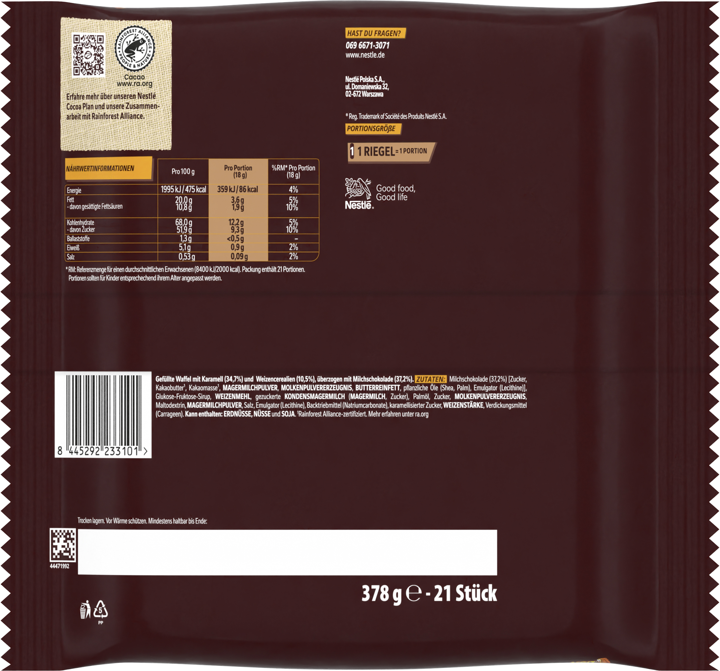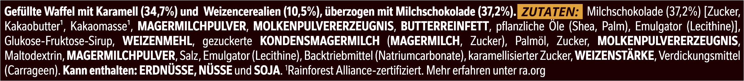 | Ingredient List | Zutaten: Milchschokolade (37,2%) [Zucker, Kakaobutter*, Kakaomasse*, MAGERMILCHPULVER, MOLKENPULVERERZEUGNIS, BUTTERREINFETT, pflanzliche Öle (Shea, Palm), Emulgator (Lecithine)], Glukose-Fruktose-Sirup, WEIZENMEHL, gezuckerte KONDENSMAGERMILCH (MAGERMILCH, Zucker), Palmöl, Zucker, MOLKENPULVERERZEUGNIS, Maltodextrin, MAGERMILCHPULVER, Salz, Emulgator (Lecithine), Backtriebmittel (Natriumcarbonate), karamellisierter Zucker, WEIZENSTÄRKE, Verdickungsmittel (Carrageen). Kann enthalten: ERDNÜSSE, NÜSSE und SOJA. *Rainforest Alliance-zertifiziert. Mehr erfahren unter ra.org |