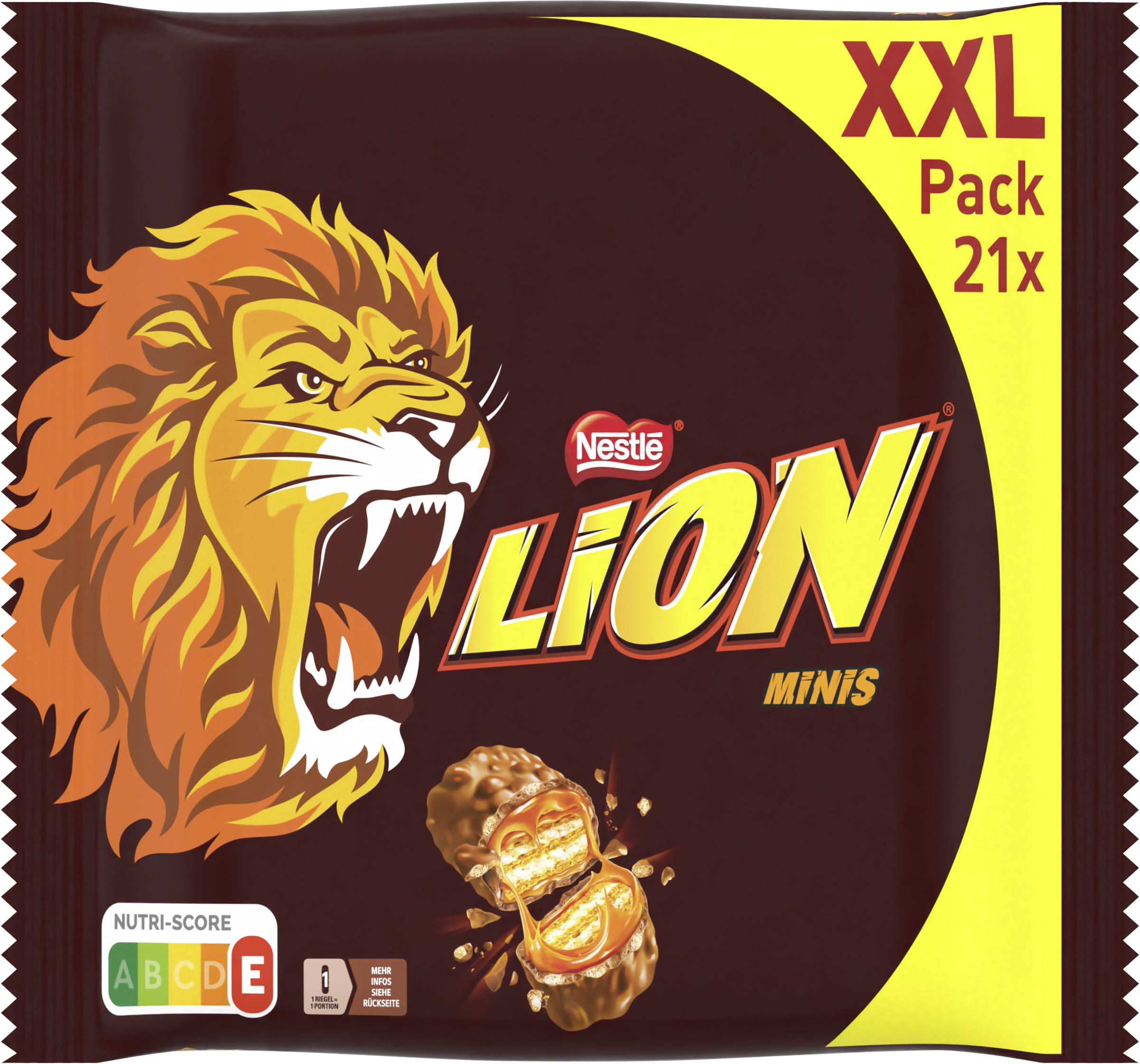 | Marketing Message | Ideal zum Teilen: LION Minis. Die leckeren LION Minis im XXL-Beutel bieten den echten LION Geschmack im kleineren Mini-Format mit Knusperwaffel, Karamell, Knuspergetreide und einem Überzug aus Milchschokolade. In jedem Beutel sind 21 einzelverpackte LION Minis enthalten, so dass die LION Minis auch gut portionierbar sind. |