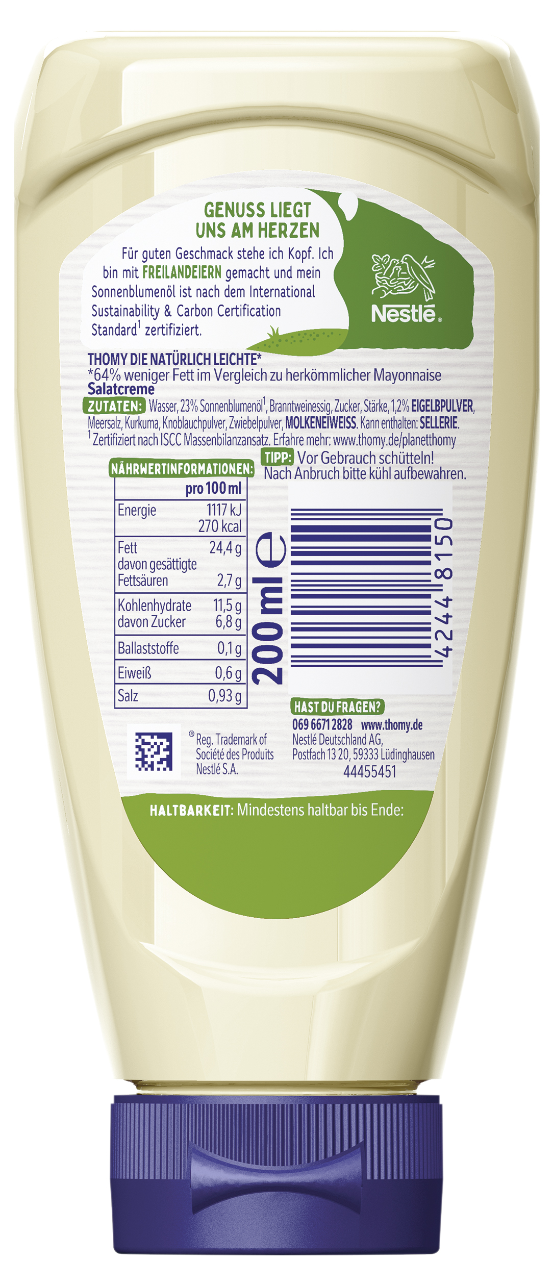 | Marketing Message | Genuss liegt uns am Herzen: Für guten Geschmack stehe ich Kopf. Ich bin mit Freilandeiern gemacht und mein Sonnenblumenöl ist nach dem International Sustainability & Carbon Certification Standard* zertifiziert. • Cremig wie Mayo, aber leicht: 64% weniger Fett im Vergleich zu Original-Mayonnaise • Ohne Konservierungsmittel und Farbstoffe • mit Freilandeiern ohne Küken töten • Ideal zu Brote, Salate, Sandwiches, Dips oder noch vieles mehr *Zertifiziert nach ISCC Massenbilanzansatz. Erfahre mehr: www.thomy.de/planetthomy |