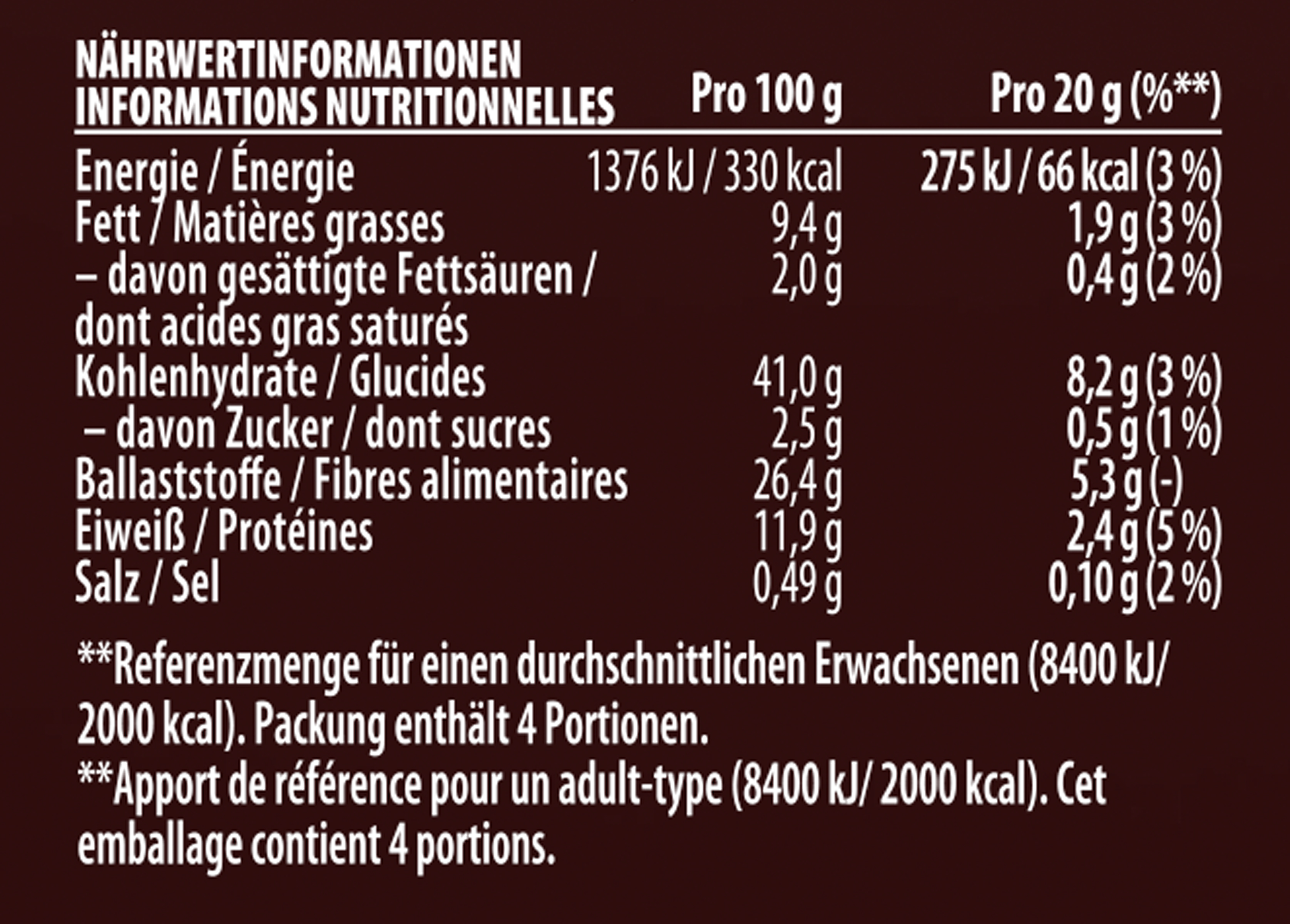 | 1. Nährwerte >>> | Zubereitungsgrad Bezugsgröße Portionsgröße Portionsgröße Beschreibung Tagesdosis Referenzwert Nährstoff: Teil von… Messgenauigkeit Nährwert % Messgenauigkeit % Referenzmenge UNPREPARED100GRMENER-EnergieAPPROXIMATELY1376kJ UNPREPARED100GRMENER-EnergieAPPROXIMATELY330kCal UNPREPARED100GRMFATFettAPPROXIMATELY9.4g UNPREPARED100GRMFASATFett, davon gesättigte FettsäurenAPPROXIMATELY2.0g UNPREPARED100GRMCHOAVLKohlenhydrateAPPROXIMATELY41.0g UNPREPARED100GRMSUGAR-Kohlenhydrate, davon ZuckerAPPROXIMATELY2.5g UNPREPARED100GRMFIBTGBallaststoffeAPPROXIMATELY26.4g UNPREPARED100GRMPRO-EiweißAPPROXIMATELY11.9g UNPREPARED100GRMSALTEQSalz ÄquivalentAPPROXIMATELY0.49g |