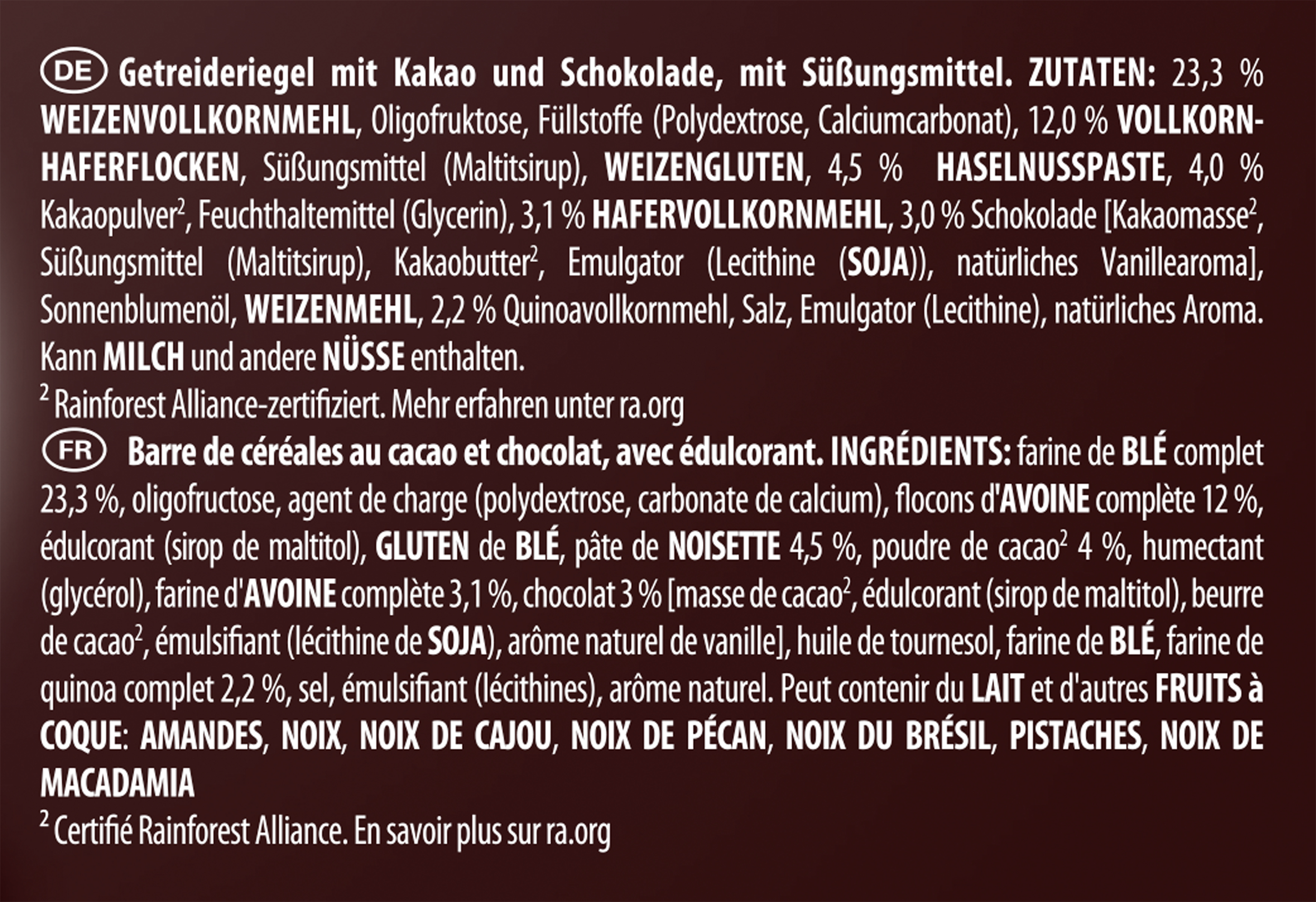 | Ingredient List | Zutaten: 23,3% WEIZENVOLLKORNMEHL, Oligofruktose, Füllstoffe (Polydextrose, Calciumcarbonat), 12,0% VOLLKORNHAFERFLOCKEN, Süßungsmittel (Maltitsirup), WEIZENGLUTEN, 4,5% HASELNUSSPASTE, 4,0% Kakaopulver*, Feuchthaltemittel (Glycerin), 3,1% HAFERVOLLKORNMEHL, 3,0% Schokolade [Kakaomasse*, Süßungsmittel (Maltitsirup), Kakaobutter*, Emulgator (Lecithine (SOJA)), natürliches Vanillearoma], Sonnenblumenöl, WEIZENMEHL, 2,2% Quinoavollkornmehl, Salz, Emulgator (Lecithine), natürliches Aroma. Kann MILCH und NÜSSE enthalten. *Rainforest Alliance-zertifiziert. |