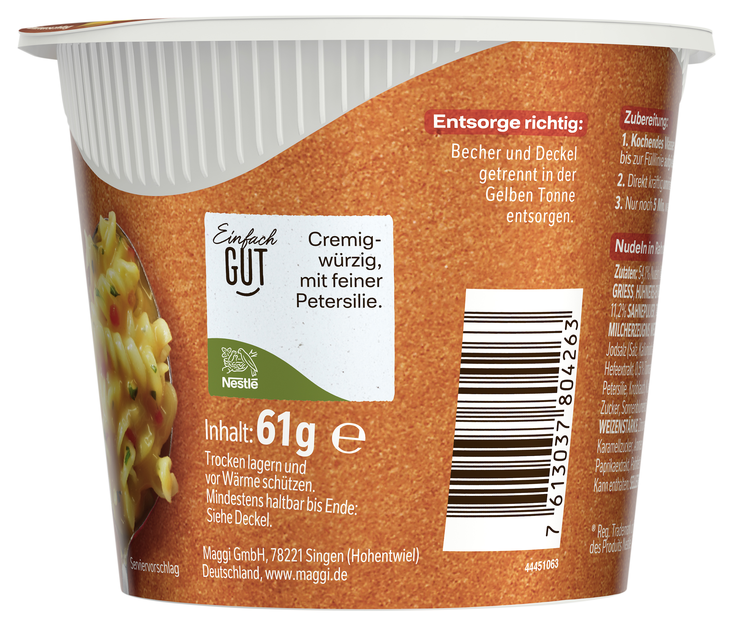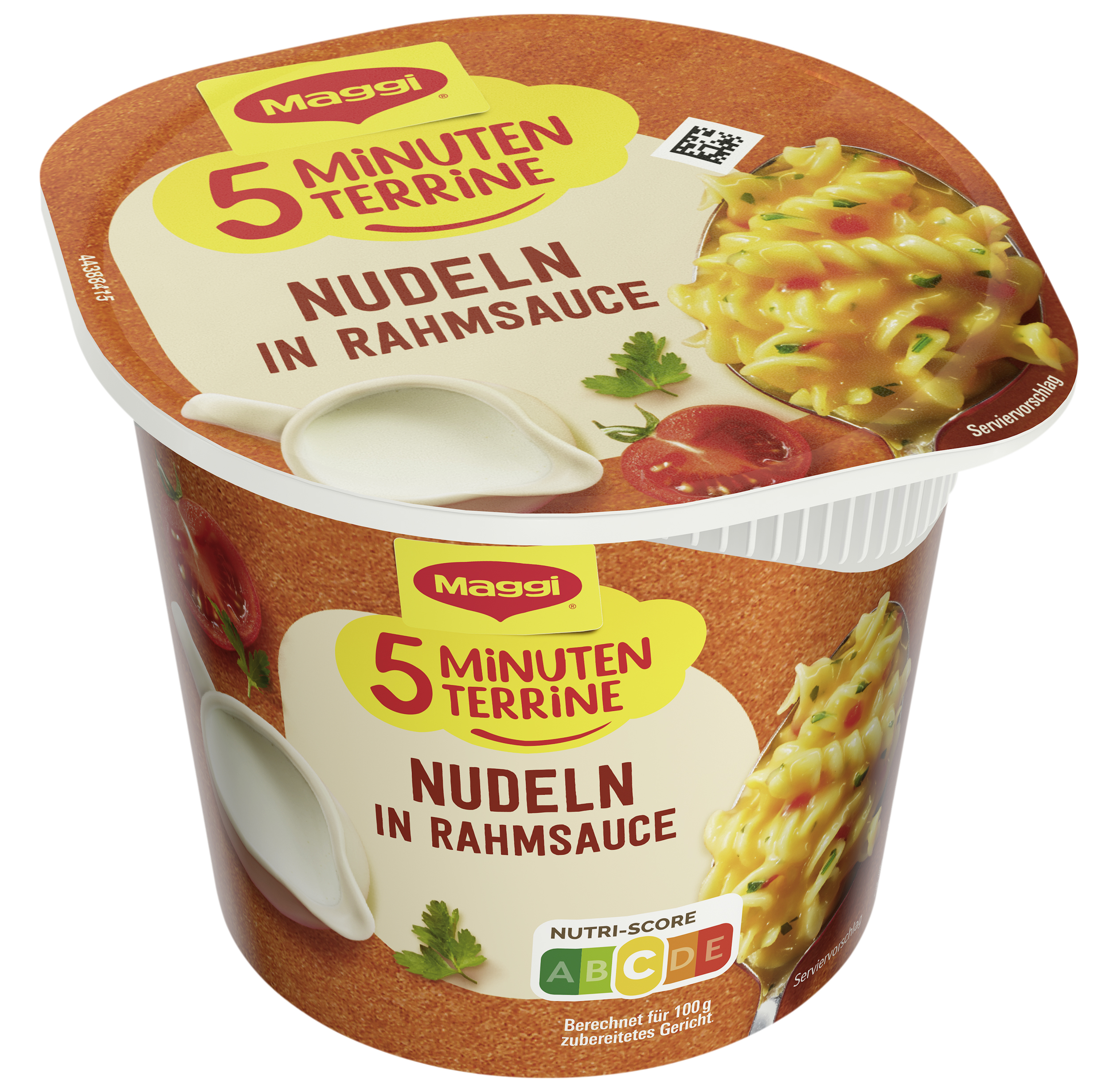 | Marketing Message | Wenn es mal schnell gehen muss, aber es dennoch lecker und cremig-pikant sein soll, ist die Maggi 5 Minuten Terrine Nudeln in Rahmsauce die ideale Wahl. Leckere Spirelli-Nudeln mit sahnigem Rahm und fruchtigen Tomatenstückchen – im praktischen Becher und in wenigen Minuten fertig. Schneller und unkomplizierter kann man Nudeln in Rahmsauce nicht zubereiten. Maggi 5 Minuten Terrine Nudeln in Rahmsauce: ein cremiger Genuss Maggi 5 Minuten Terrine gibt es mit verschiedenen köstlichen Nudelsaucen. Für die Maggi 5 Minuten Terrine Nudeln in Rahmsauce wurden viele Rahmsaucen-Rezepte probiert, bis die optimale Rezeptur gefunden wurde. Die würzig-cremige Rahmsauce wird von den Spirelli-Nudeln perfekt aufgenommen eine leckere Mahlzeit für zwischendurch. |