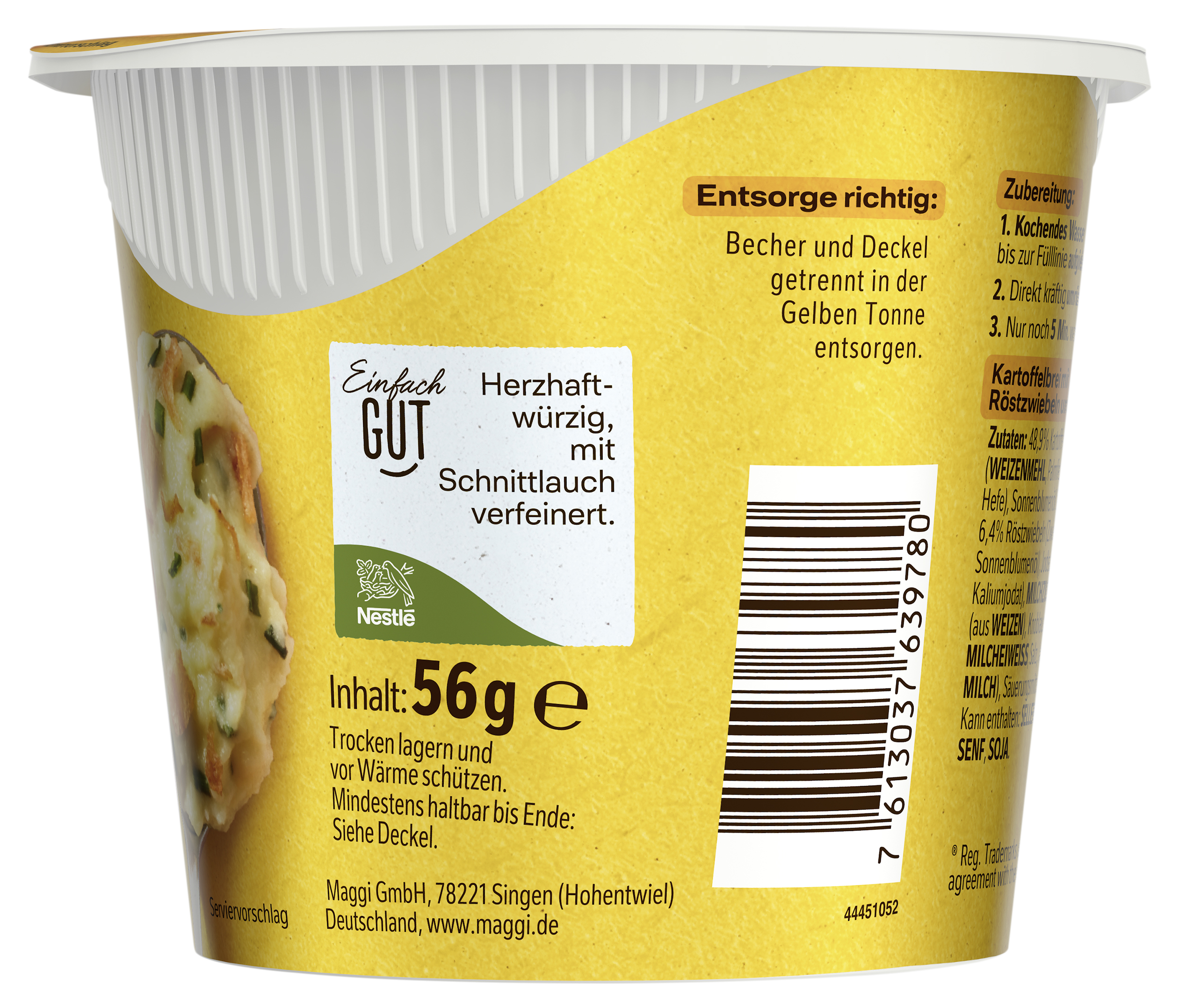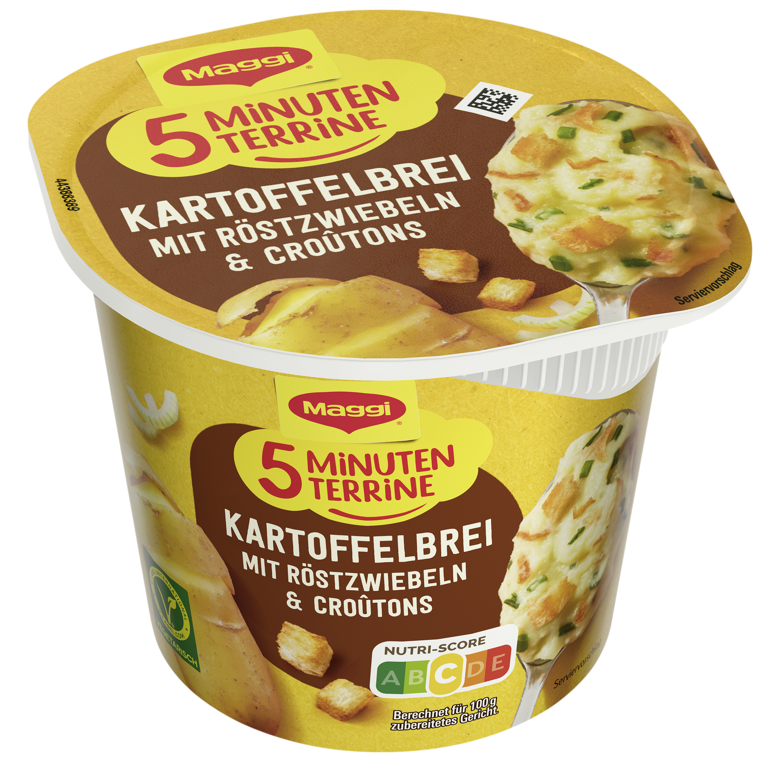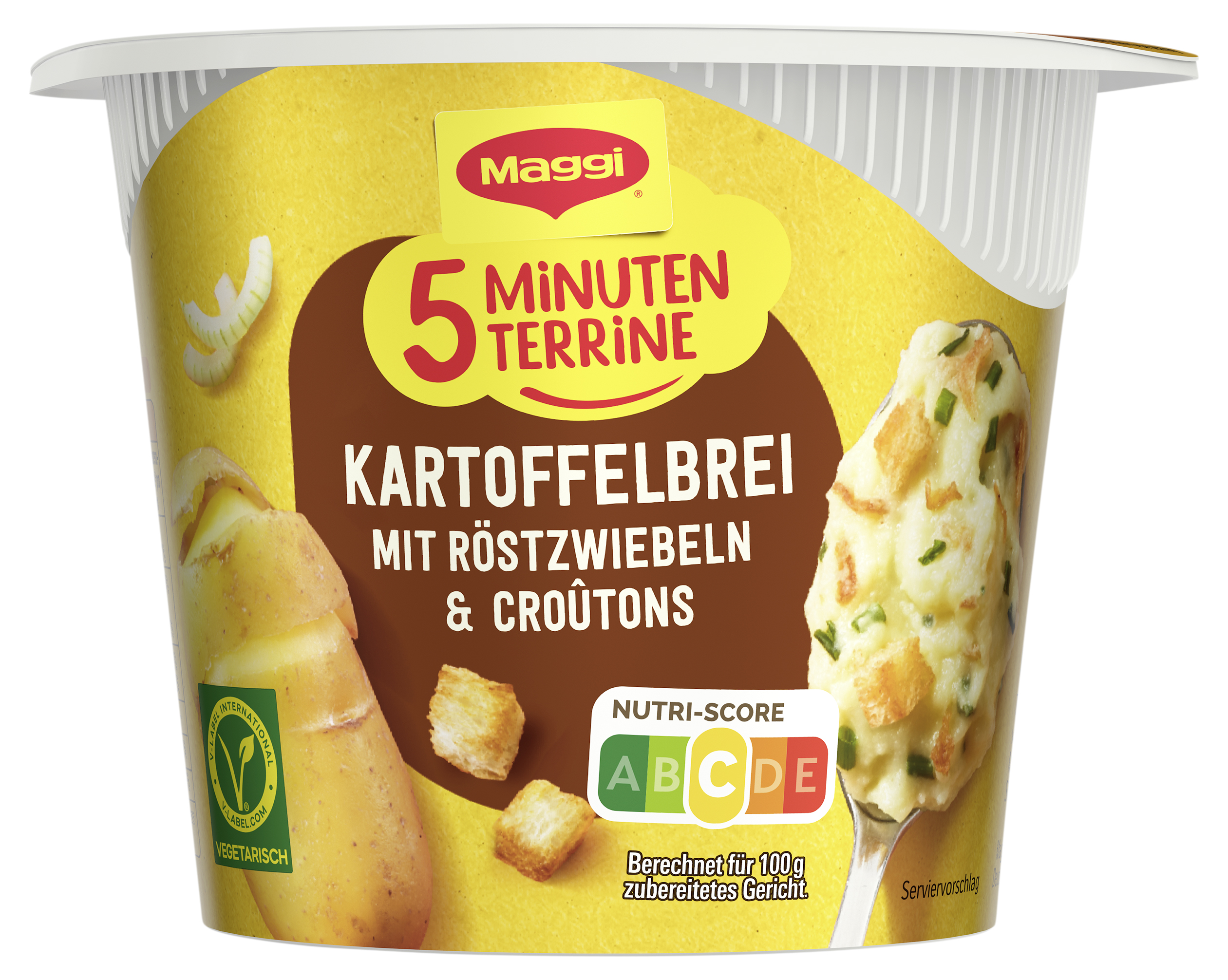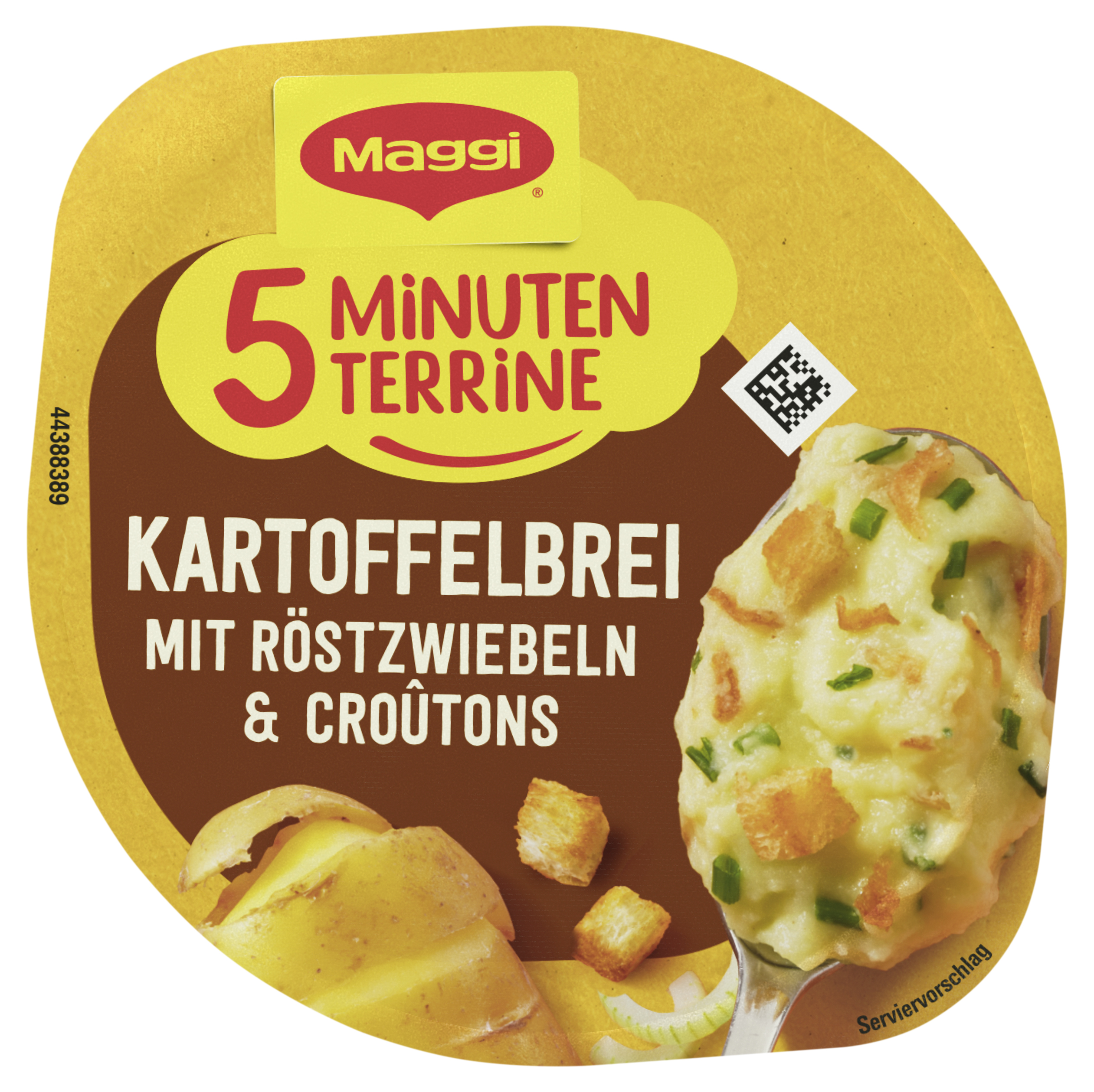 | Marketing Message | Schnelle Kartoffelgerichte können bei größtem Alltagsstress in kürzester Zeit zu einem leckeren Pausensnack verhelfen. Mit Maggi 5 Minuten Terrine Kartoffelbrei mit Röstzwiebeln & Croutons genießt man innerhalb weniger Minuten einen warmen Snack, der jedes Genießer Herz höherschlagen lässt. Richtig lecker ist der cremige Kartoffelbrei mit gerösteten Zwiebeln & knusprigen Croutons. Kartoffelbrei Snack als Zwischenmahlzeit, für die Pause oder unterwegs |