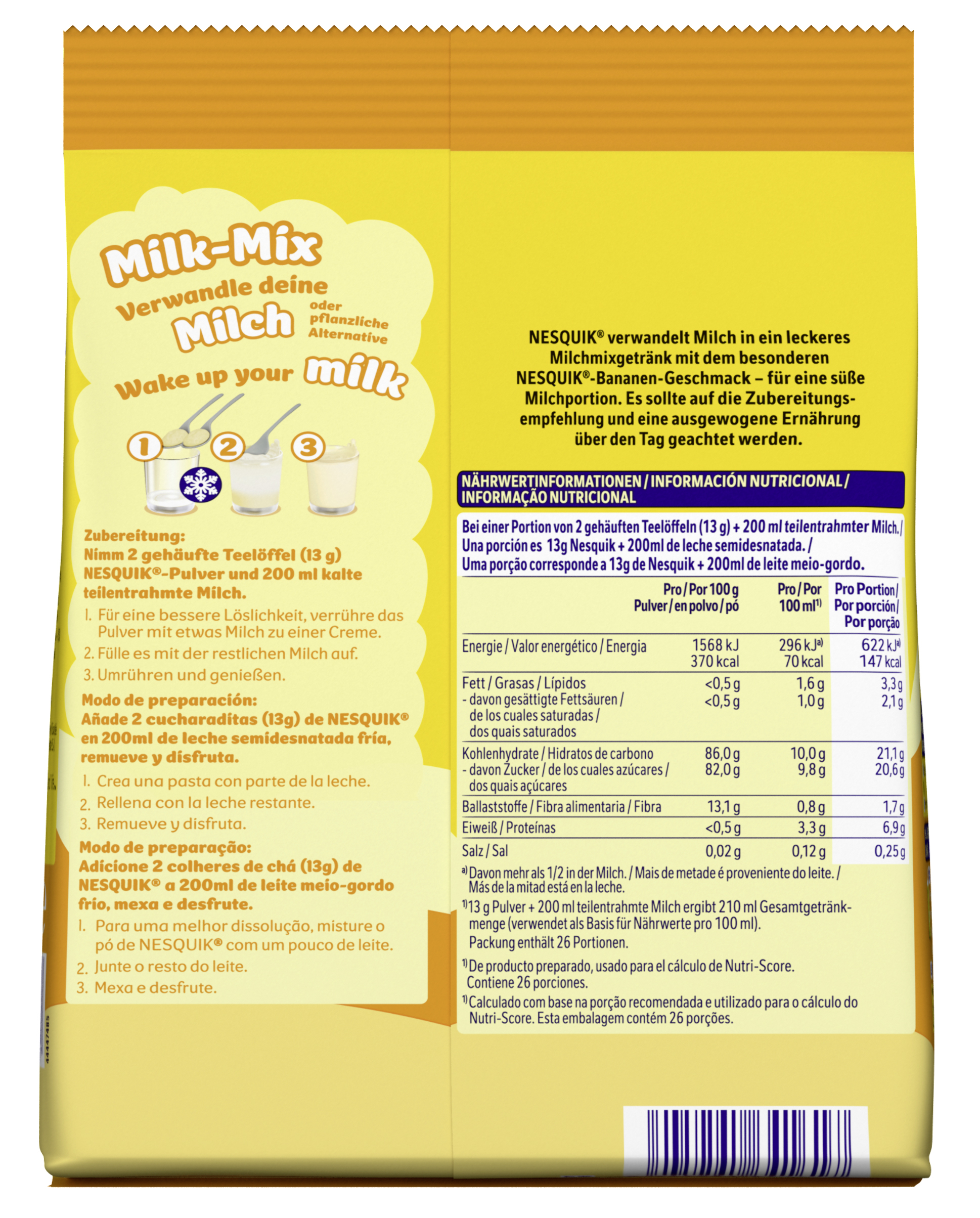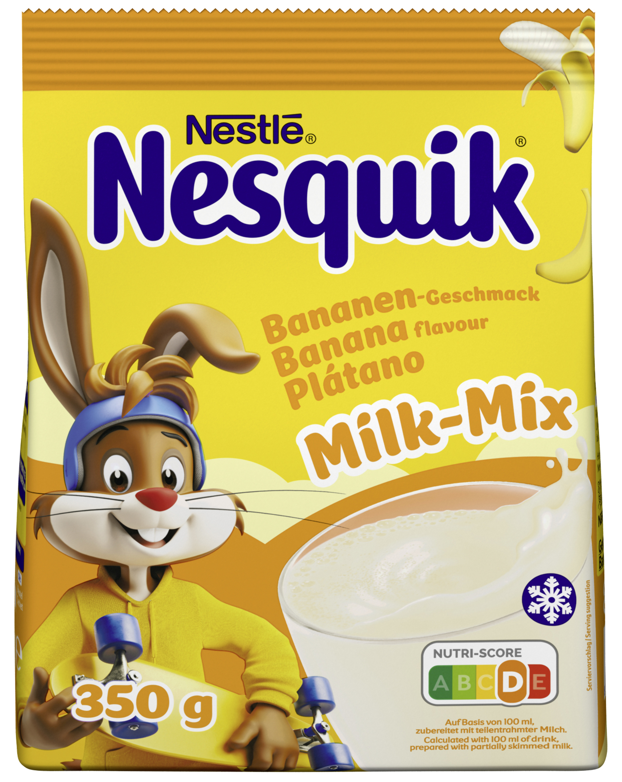 | Marketing Message | Verwandle deine Milch mit NESQUIK Banane in ein leckeres Milchmixgetränk mit Bananengeschmack. • Nutri-Score D - Nutri-Score wurde von unabhängigen Expertengremien entwickelt, um die Nährwertqualität von Lebensmitteln innerhalb einer Kategorie zu vergleichen; bei diesem Produkt auf Grundlage von 100ml zubereitet mit fettarmer Milch. • Sehr gute Löslichkeit in der Milch • Einfache Dosierung: 2 gehäufte Teelöffel NESQUIK Banane + 200ml kalte fettarme Milch, umrühren und genießen! • Geeignet zur Verfeinerung von Getränken und Desserts Mit Nesquik wird jedes Glas Milch zum Highlight! |