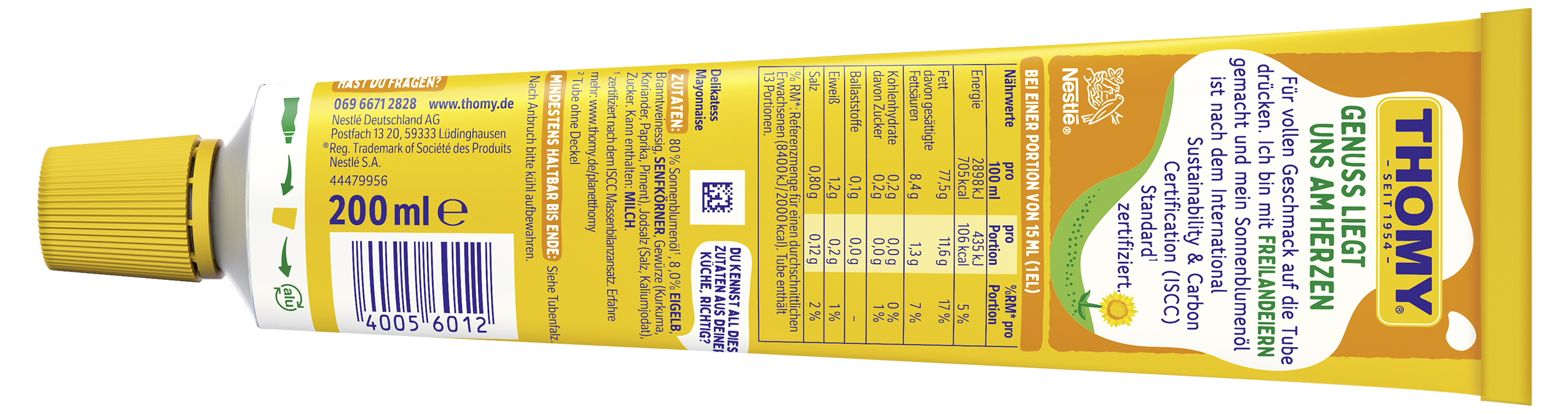 | Marketing Message | Genuss liegt in meiner Natur Für vollen Geschmack einfach auf die Tube drücken. Hier sind natürliche Zutaten* und Eier aus Freilandhaltung drin. Dass die Tube recycelbar ist, ist eh klar. Schmeckt und fühlt sich gut an. • Mit Eiern aus Freilandhaltung • Mit natürlichen Zutaten • Ohne Konservierungsstoffe, Farb- oder Aromastoffe • Mit reinem Sonnenblumenöl und besonders cremig-lecker • Nutri-Score E • Recycelbare Tube: Aluminium ist recycelbar • Ideal für Kartoffel- und Nudelsalate, Sandwiches, Pommes und noch vieles mehr THOMY… hier kommt der Genuss In höchster THOMY-Qualität Der Nutri-Score ist ein freiwilliges Kennzeichnungssystem, das als Orientierungshilfe dient, Lebensmittel nach ihrer Nährwertqualität zu bewerten. Verbraucher können mithilfe der fünfstufigen und farbig hinterlegten Buchstabenskala das Nährwertprofil eines Produkts erkennen. |
