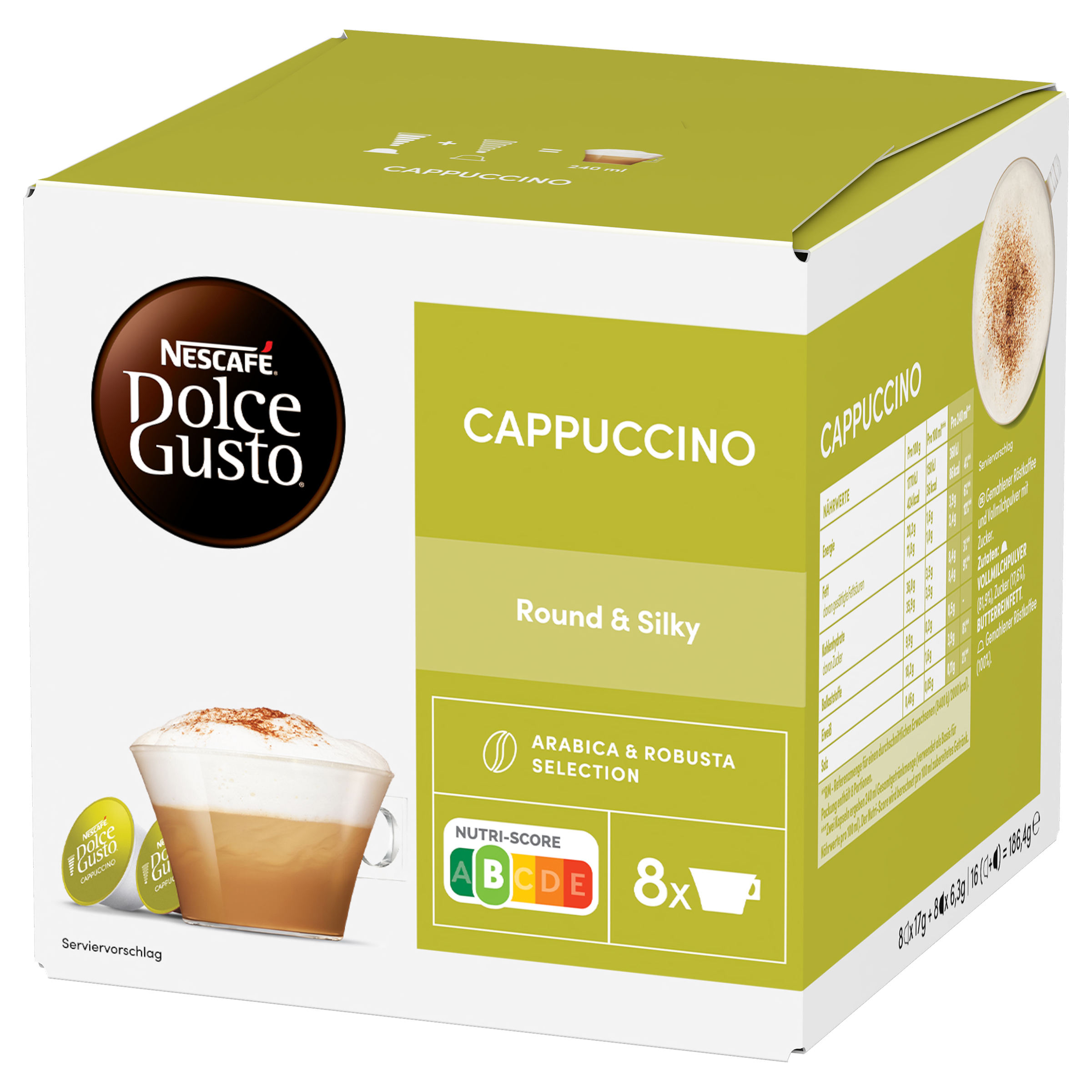 | Marketing Message | Unsere NESCAFÉ Dolce Gusto Cappuccino Kaffeekapseln: Leckerer Kaffeegenuss aus Premium Arabica und Robusta Bohnen mit Vollmilchschaum für noch mehr Cremigkeit und besonders vollmundigen Schaumgenuss. Kaffeearoma & Geschmack Vollmundiges Aroma und feinster Geschmack durch intensive Röstung Premium Arabica und Robusta Bohnen Mit dichtem, lockerem Milchschaum, ausgewogener Cremigkeit Herkunft & Origin: Arabica-und Robusta-Bohnen aus Kolumbien, Brasilien und Vietnam. Zubereitung: Eine Packung enthält 16 Kapseln (8 Kaffee- und 8 Milchkapseln) für 8 Gläser á 240ml Cappuccino. Patentierte Kapseltechnologie Individuelle Druckregulierung pro Sorte für den perfekten Genuss Aromaversiegelung für ein exzellentes Kaffeeerlebnis |