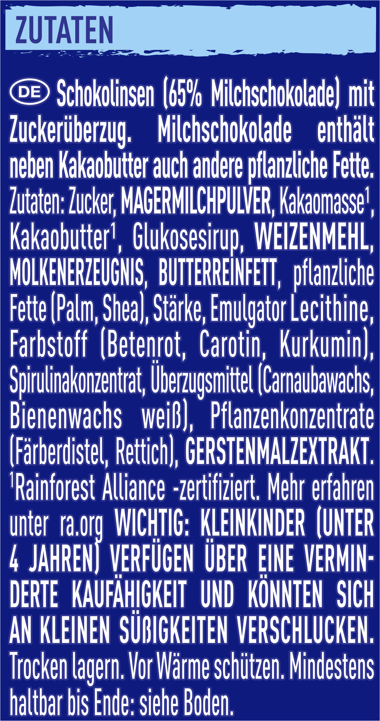 | Ingredient List | Zutaten: Zucker, MAGERMILCHPULVER, Kakaomasse*, Kakaobutter*, Glukosesirup, WEIZENMEHL, MOLKENERZEUGNIS, BUTTERREINFETT, pflanzliche Fette (Palm, Shea), Stärke, Emulgator Lecithine, Farbstoff (Betenrot, Carotin, Kurkumin), Spirulinakonzentrat, Überzugsmittel (Carnaubawachs, Bienenwachs weiß), Pflanzenkonzentrate (Färberdistel, Rettich) GERSTENMALZEXTRAKT. *Rainforest Alliance-zertifiziert. |