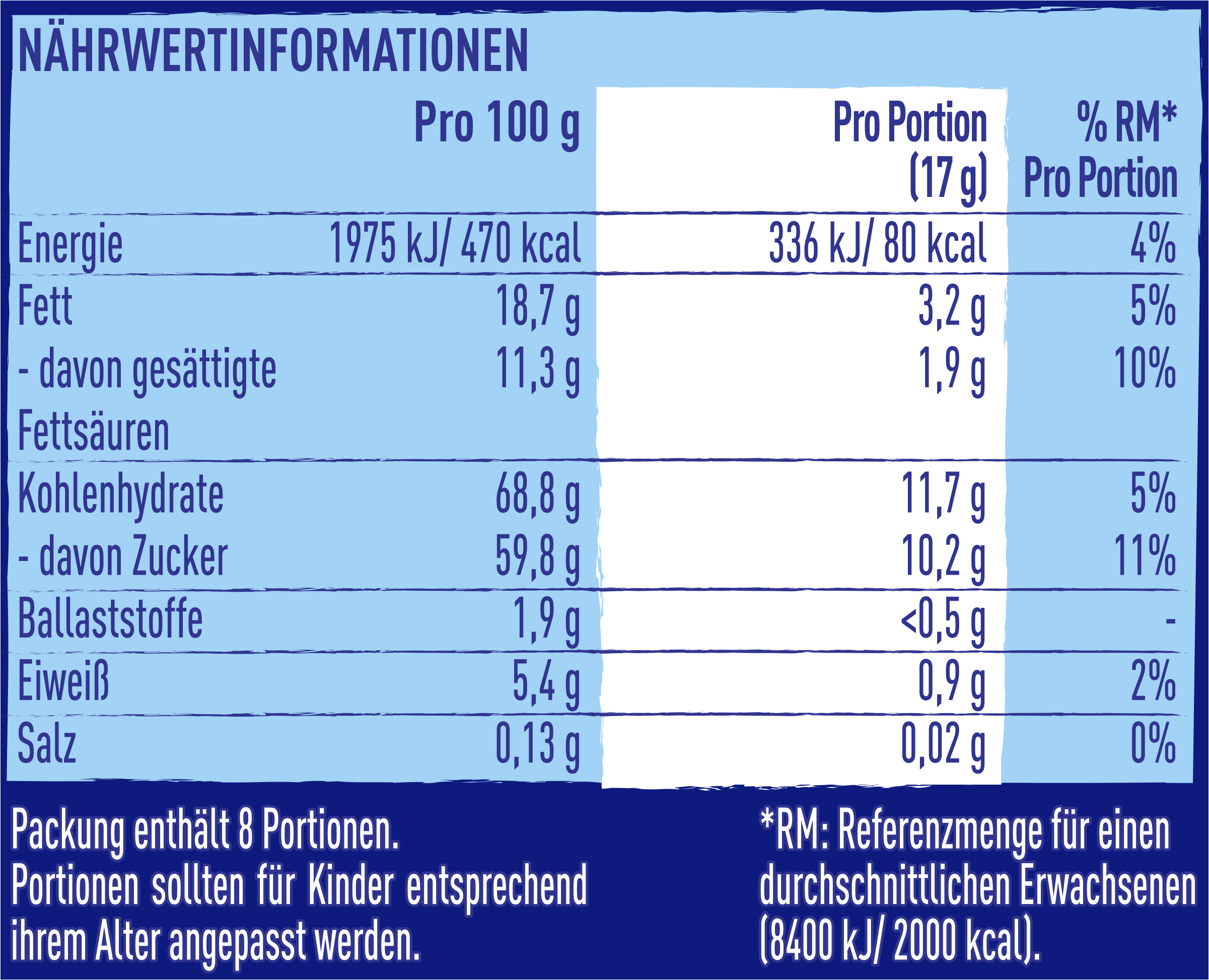| 1. Nährwerte >>> | Zubereitungsgrad Bezugsgröße Portionsgröße Portionsgröße Beschreibung Tagesdosis Referenzwert Nährstoff: Teil von… Messgenauigkeit Nährwert % Messgenauigkeit % Referenzmenge UNPREPARED100GRMENER-EnergieAPPROXIMATELY1975kJ UNPREPARED100GRMENER-EnergieAPPROXIMATELY470kCal UNPREPARED100GRMFATFettAPPROXIMATELY18.7g UNPREPARED100GRMFASATFett, davon gesättigte FettsäurenAPPROXIMATELY11.3g UNPREPARED100GRMCHOAVLKohlenhydrateAPPROXIMATELY68.8g UNPREPARED100GRMSUGAR-Kohlenhydrate, davon ZuckerAPPROXIMATELY59.8g UNPREPARED100GRMFIBTGBallaststoffeAPPROXIMATELY1.9g UNPREPARED100GRMPRO-EiweißAPPROXIMATELY5.4g UNPREPARED100GRMSALTEQSalz ÄquivalentAPPROXIMATELY0.13g |