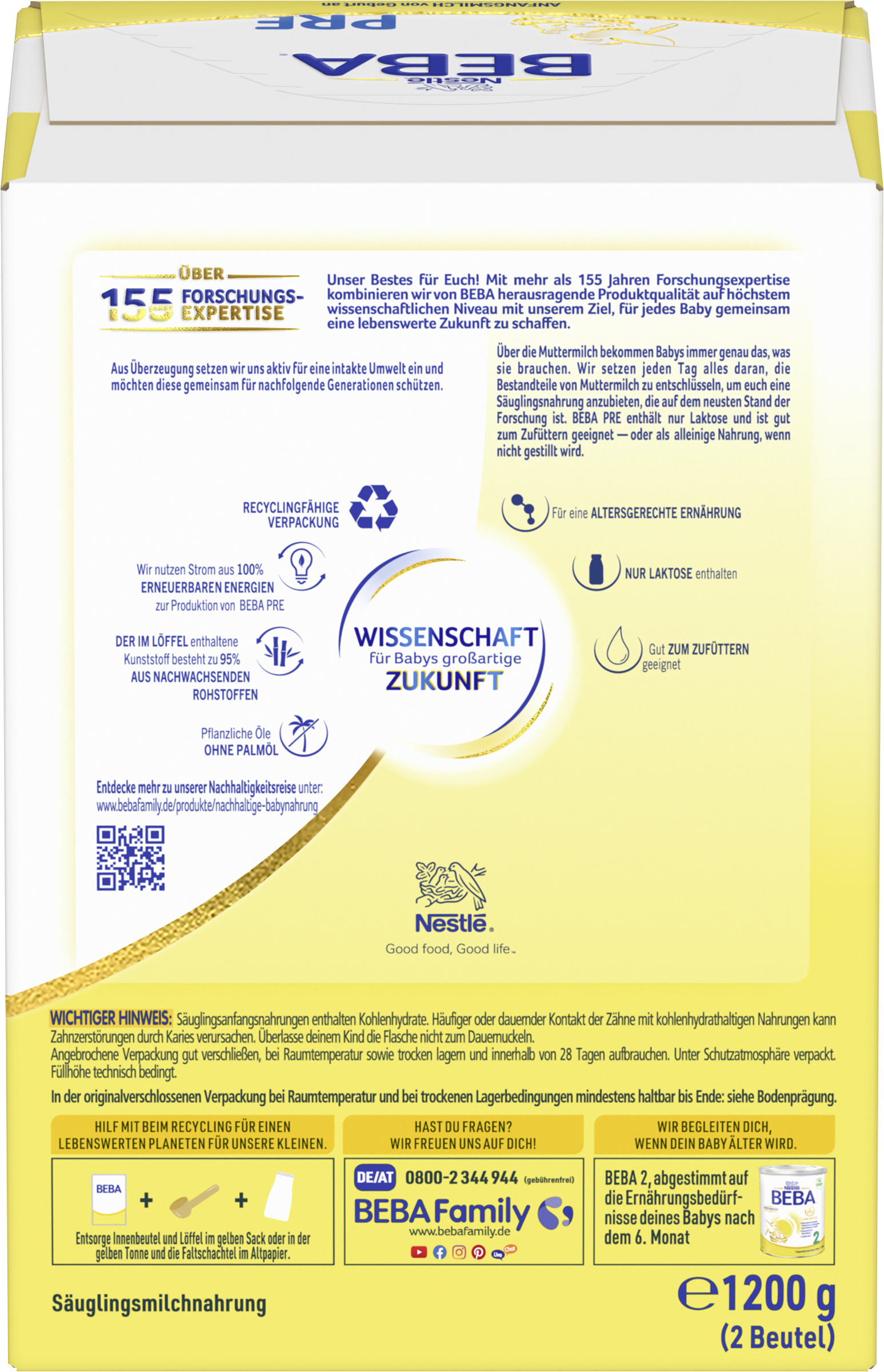 | Marketing Message | Unser Bestes für Euch! Mit mehr als 155 Jahren Forschungsexpertise kombinieren wir von BEBA herausragende Produktqualität auf höchstem wissenschaftlichem Niveau mit unserem Ziel, für jedes Baby gemeinsam eine lebenswerte Zukunft zu schaffen. BEBA PRE Anfangsmilch im 1,2kg Vorratspack ist auf die Bedürfnisse deines Babys von Geburt an abgestimmt. Warum BEBA PRE Anfangsmilch? - Enthält pflanzliche Öle ohne Palmöl - Nur Laktose enthalten - Geeignet als alleinige Nahrung, wenn nicht gestillt wird, oder zum Zufüttern Als Mama oder Papa möchtest du nur das Beste für dein kleines Wunder und einen großartigen Start ins Leben. Dazu gehört: deine Liebe, Fürsorge und die richtige Ernährung. Über die Muttermilch bekommen Babys immer genau das, was sie brauchen. Daher setzen wir jeden Tag alles daran, die Bestandteile von Muttermilch zu entschlüsseln. Uns ist es wichtig, euch eine Säuglingsnahrung anzubieten, die auf dem neusten Stand der Forschung ist. Wichtiger Hinweis: Stillen ist die beste Ernährung für dein Baby, daher sollte so lange wie möglich gestillt werden. Sprich bitte mit deinem Kinderarzt oder deiner Hebamme, wenn du eine Säuglingsnahrung verwenden willst. |