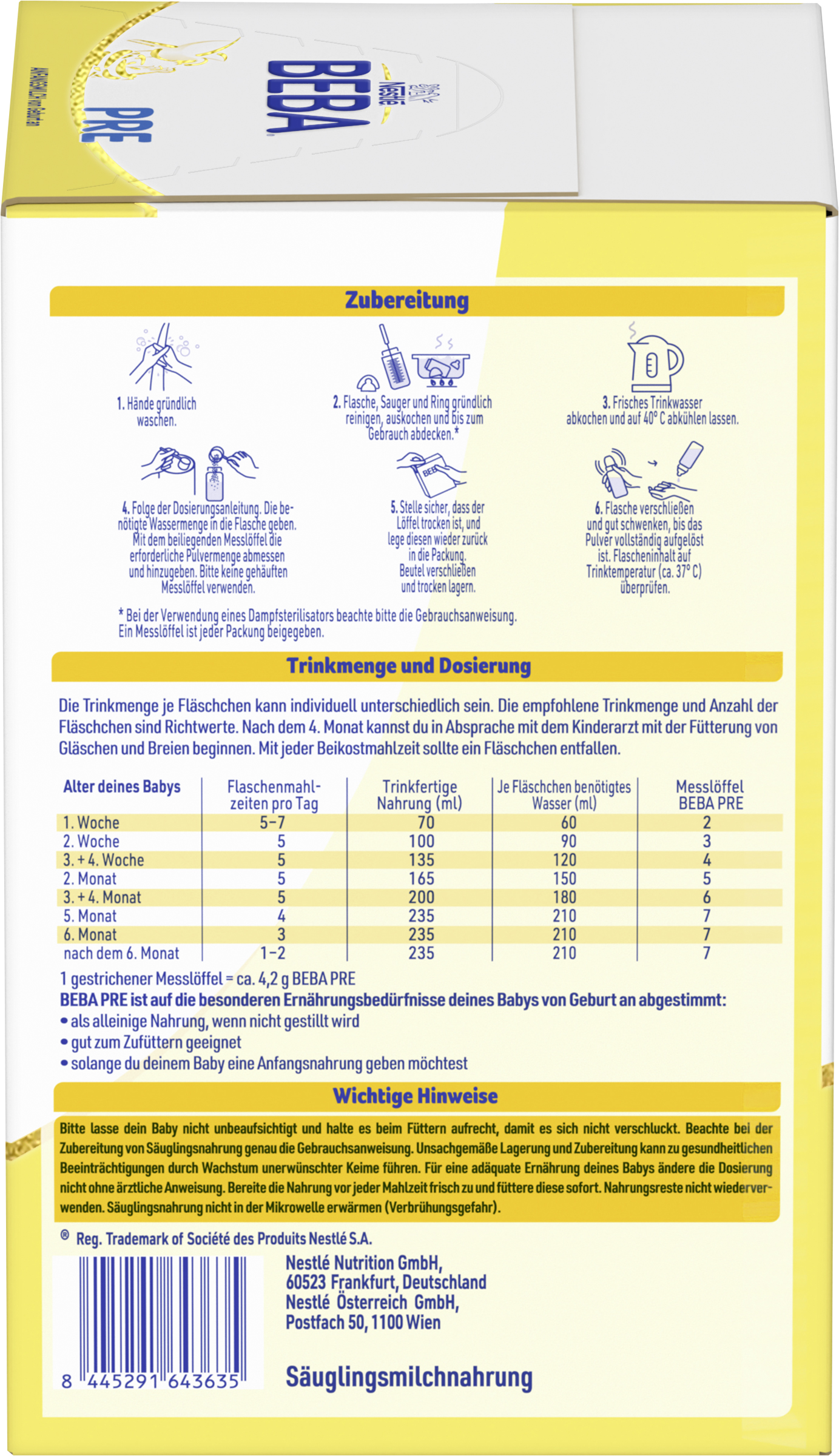 | Consumer Usage Instructions | Trinkmenge und Dosierung: Die Trinkmenge je Fläschchen kann individuell unterschiedlich sein. Die empfohlene Trinkmenge und Anzahl der Fläschchen sind Richtwerte. Nach dem 4. Monat kannst du in Absprache mit dem Kinderarzt mit der Fütterung von Gläschen und Breien beginnen. Mit jeder Beikostmahlzeit sollte ein Fläschchen entfallen. - Alter deines Babys: 1. Woche, Flaschenmahlzeiten pro Tag: 5-7, Trinkfertige Nahrung: 70ml, Je Fläschchen benötigtes Wasser: 60ml, Messlöffel BEBA PRE: 2 - Alter deines Babys: 2. Woche, Flaschenmahlzeiten pro Tag: 5, Trinkfertige Nahrung: 100ml, Je Fläschchen benötigtes Wasser: 90ml, Messlöffel BEBA PRE: 3 - Alter deines Babys: 3.+4. Woche, Flaschenmahlzeiten pro Tag: 5, Trinkfertige Nahrung: 135ml, Je Fläschchen benötigtes Wasser: 120ml, Messlöffel BEBA PRE: 4 - Alter deines Babys: 2. Monat, Flaschenmahlzeiten pro Tag: 5, Trinkfertige Nahrung: 165ml, Je Fläschchen benötigtes Wasser: 150ml, Messlöffel BEBA PRE: 5 - Alter deines Babys: 3.+4. Monat, Flaschenmahlzeiten pro Tag: 5, Trinkfertige Nahrung: 200ml, Je Fläschchen benötigtes Wasser: 180ml, Messlöffel BEBA PRE: 6 - Alter deines Babys: 5. Monat, Flaschenmahlzeiten pro Tag: 4, Trinkfertige Nahrung: 235ml, Je Fläschchen benötigtes Wasser: 210ml, Messlöffel BEBA PRE: 7 - Alter deines Babys: 6. Monat, Flaschenmahlzeiten pro Tag: 3, Trinkfertige Nahrung: 235ml, Je Fläschchen benötigtes Wasser: 210ml, Messlöffel BEBA PRE: 7 - Alter deines Babys: nach dem 6. Monat, Flaschenmahlzeiten pro Tag: 1-2, Trinkfertige Nahrung: 235ml, Je Fläschchen benötigtes Wasser: 210ml, Messlöffel BEBA PRE: 7 1 gestrichener Messlöffel = ca. 4,2g BEBA PRE Standardauflösung für 100ml: 12,5 g Pulver + 90ml Wasser |