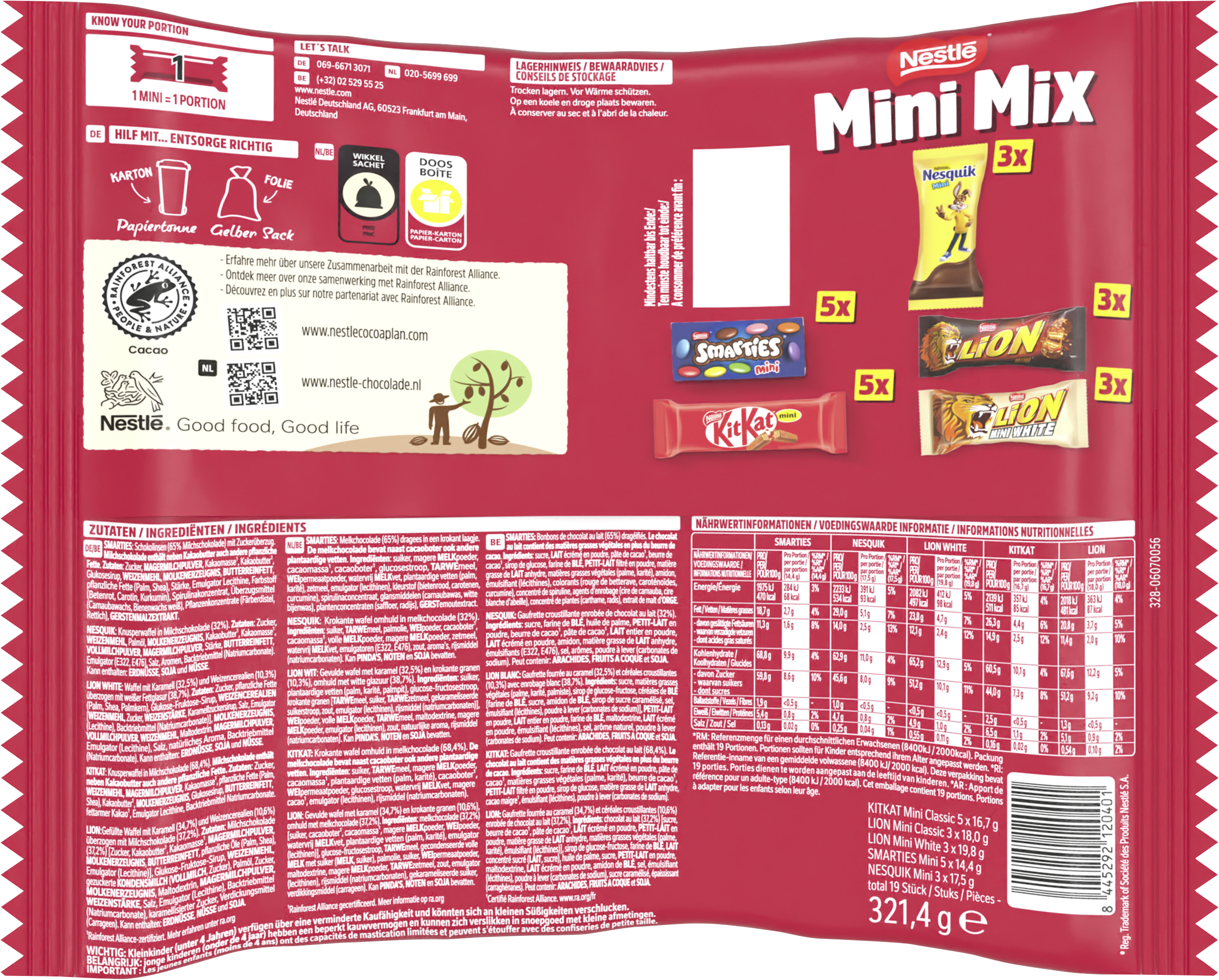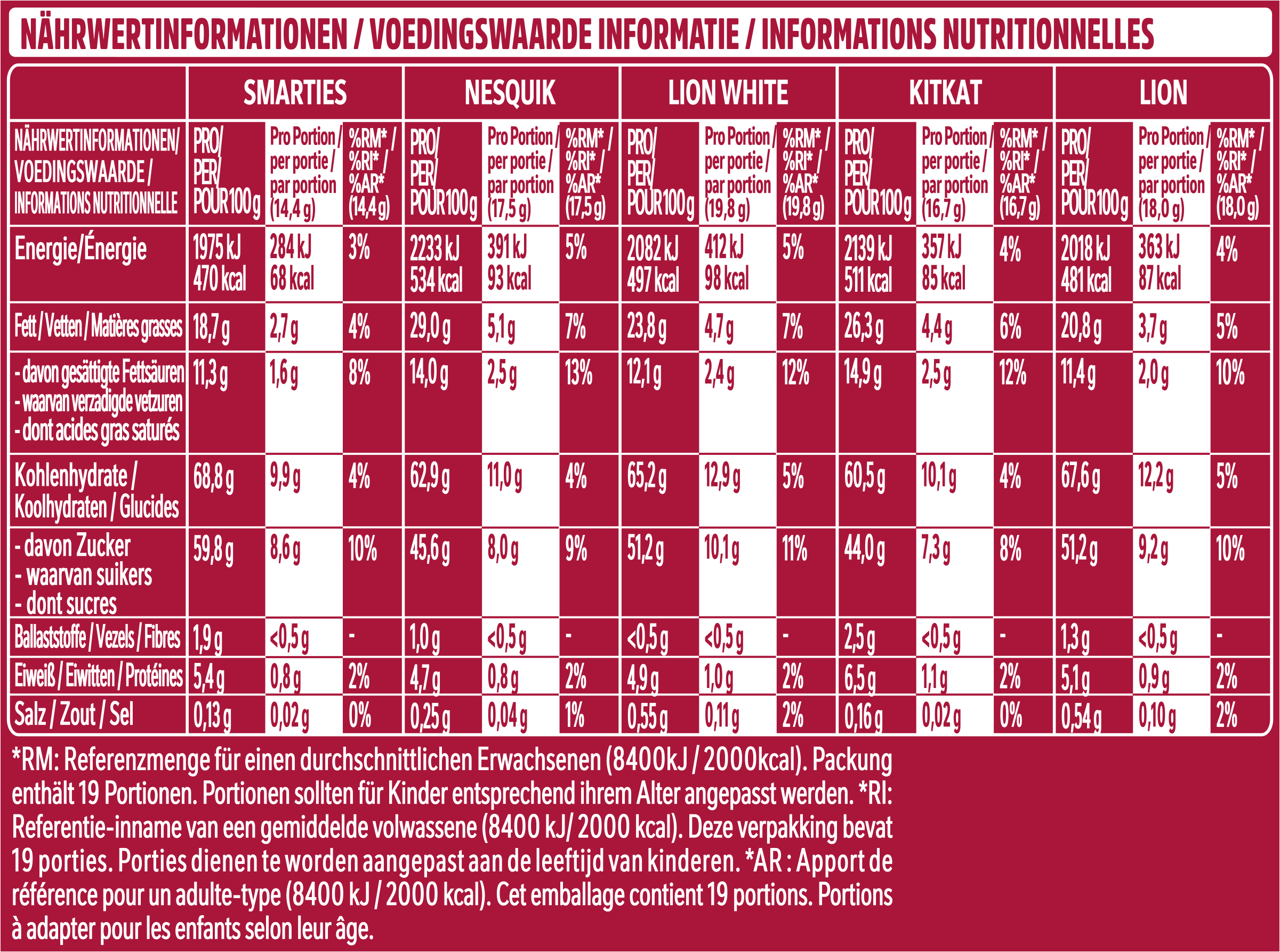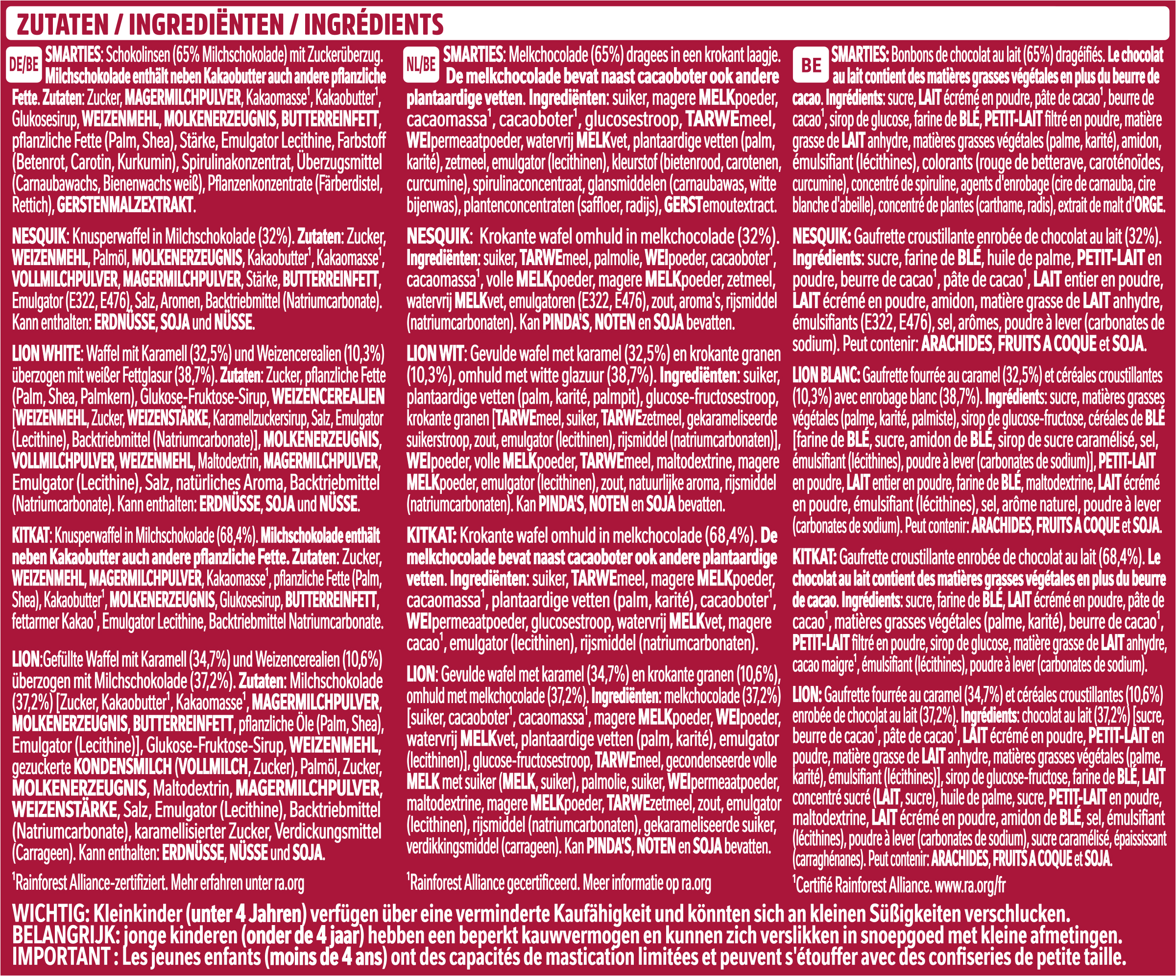 | Ingredient List | SMARTIES: Zutaten: Zucker, MAGERMILCHPULVER, Kakaomasse*, Kakaobutter*, Glukosesirup, WEIZENMEHL, MOLKENERZEUGNIS, BUTTERREINFETT, pflanzliche Fette (Palm, Shea), Stärke, Emulgator Lecithine, Farbstoff (Betenrot, Carotin, Kurkumin), Spirulinakonzentrat, Überzugsmittel (Carnaubawachs, Bienenwachs weiß), Pflanzenkonzentrate (Färberdistel, Rettich), GERSTENMALZEXTRAKT. NESQUIK: Zutaten: Zucker, WEIZENMEHL, Palmöl, MOLKENERZEUGNIS, Kakaobutter*, Kakaomasse*, VOLLMILCHPULVER, MAGERMILCHPULVER, Stärke, BUTTERREINFETT, Emulgator (E322, E476), Salz, Aromen, Backtriebmittel (Natriumcarbonate). Kann enthalten: ERDNÜSSE, SOJA und NÜSSE. LION WHITE: Zutaten: Zucker, pflanzliche Fette (Palm, Shea, Palmkern), Glukose-Fruktose-Sirup, WEIZENCEREALIEN [WEIZENMEHL, Zucker, WEIZENSTÄRKE, Karamellzuckersirup, Salz, Emulgator (Lecithine), Backtriebmittel (Natriumcarbonate)], MOLKENERZEUGNIS, VOLLMILCHPULVER, WEIZENMEHL, Maltodextrin, MAGERMILCHPULVER, Emulgator (Lecithine), Salz, natürliches Aroma, Backtriebmittel (Natriumcarbonate). Kann enthalten: ERDNÜSSE, SOJA und NÜSSE. KITKAT: Zutaten: Zucker, WEIZENMEHL, MAGERMILCHPULVER, Kakaomasse*, pflanzliche Fette (Palm, Shea), Kakaobutter*, MOLKENERZEUGNIS, Glukosesirup, BUTTERREINFETT, fettarmer Kakao*, Emulgator Lecithine, Backtriebmittel Natriumcarbonate. LION: Zutaten: Milchschokolade (37,2%) [Zucker, Kakaobutter*, Kakaomasse*, MAGERMILCHPULVER, MOLKENERZEUGNIS, BUTTERREINFETT, pflanzliche Öle (Palm, Shea), Emulgator (Lecithine)], Glukose-Fruktose-Sirup, WEIZENMEHL, gezuckerte KONDENSMILCH (VOLLMILCH, Zucker), Palmöl, Zucker, MOLKENERZEUGNIS, Maltodextrin, MAGERMILCHPULVER, WEIZENSTÄRKE, Salz, Emulgator (Lecithine), Backtriebmittel (Natriumcarbonate), karamellisierter Zucker, Verdickungsmittel (Carrageen). Kann enthalten: ERDNÜSSE, NÜSSE und SOJA. *Rainforest Alliance-zertifiziert. |