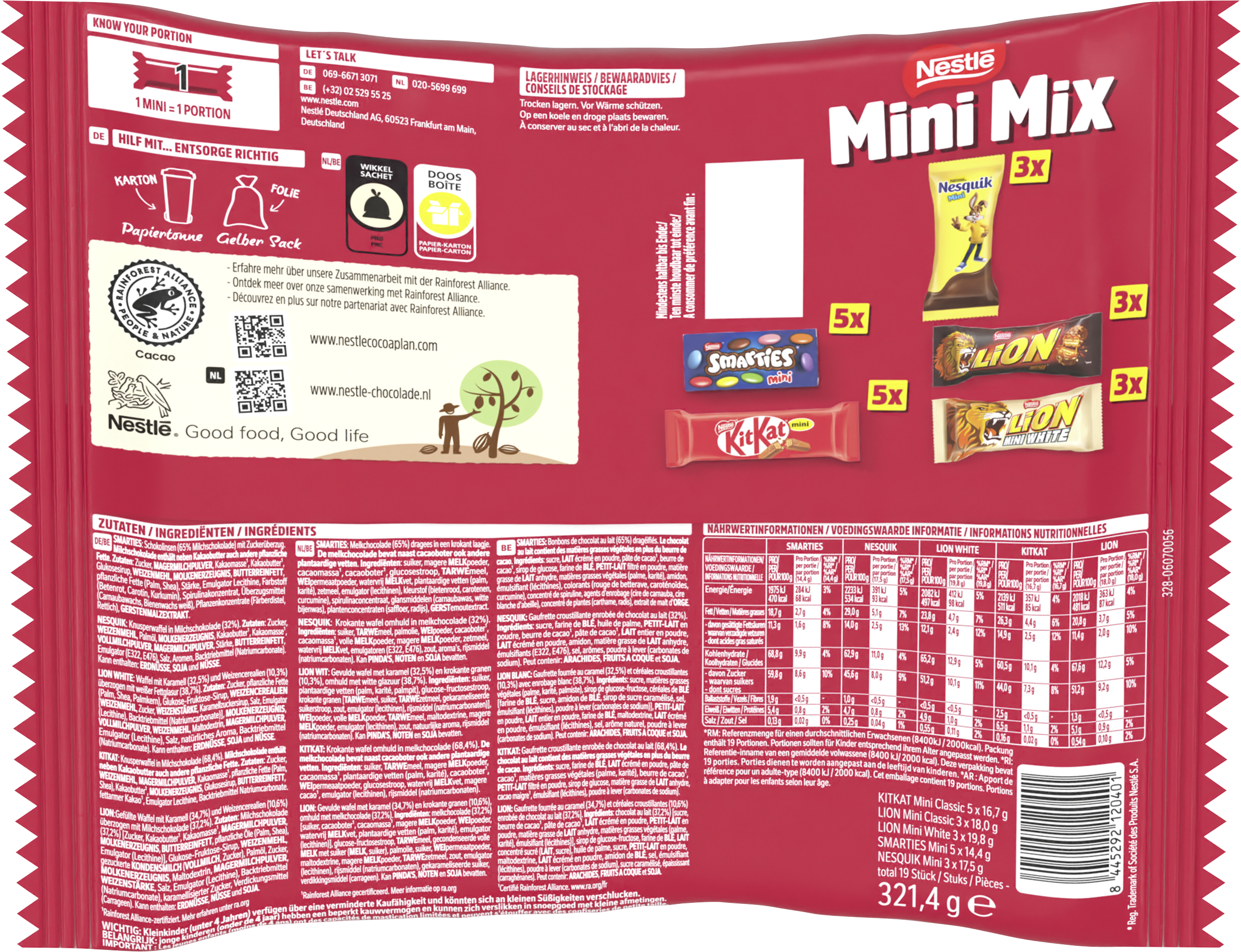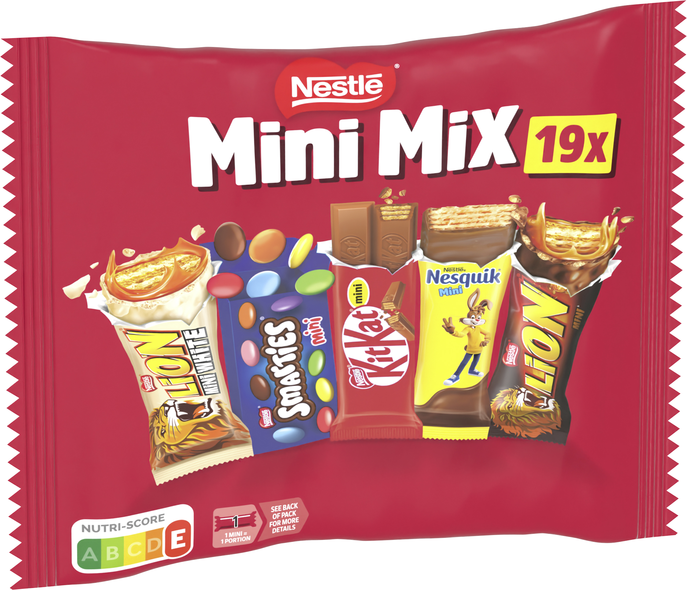 | Marketing Message | Lust auf mehr Vielfalt? Dann ist jetzt Zeit für den neuen Nestlé Marken Mini Mix - für jeden Geschmack ist etwas dabei! Die fünf leckeren Geschmacksrichtungen im Mix-Beutel bringen Abwechslung in deinen Alltag - ganz nach Lust und Laune: - KitKat Mini: Die Knupser-Waffel wird umhüllt von leckerer Milchschokolade. Der Schokoladen-Klassiker für die kleine Pause - Smarties Mini: Kleine Linsen mit einem Kern aus Vollmilchschokolade. Sie sorgen für einen bunten Spielspaß bei Groß und Klein - Lion Mini: Der echte LION Geschmack im kleinen Mini-Format mit Knusperwaffel, Karamell, Knuspergetreide und einem Überzug aus Milchschokolade. - Lion White Mini: Vorsicht bissig - Knusperwaffel, Karamell, Knuspergetreide und ein Überzug aus weißer Glasur sorgen für ein unverwechselbares Geschmackserlebnis. - Nesquik Mini: Knusprige Schokowaffeln umhüllt von cremiger Milchschokolade – eine süße Versuchung für Jung und Alt. Die Riegel sind einzeln verpackt und daher Ideal für Partys, als Mitbringsel oder einfach zum Genießen! Egal ob man den Mix-Beutel allein oder gemeinsam genießt: Die 5 unterschiedlichen Marken machen jeden Moment abwechslungsreicher. |