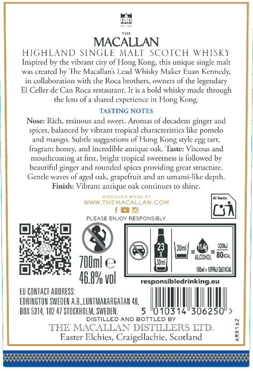 product_id 10013290 EAN_GTIN_UPC_MARA.EAN11 5010314306250 brand_name The Macallan product_display_name The Macallan Distil Your World Hong Kong 70cl ABV_MVKE.MVGR5 46.8 Size and UOM Picklist 700ml product_description_short This whisky captures the energy and complexity of Hong Kong. It is a symphony of flavours, with rich intensity from ginger, spice and antique oak, balanced by the tropical vibrancy of mango and grapefruit. Each layer contributes to a rich and multifaceted experience that mirrors the city's dynamic nature. product_description_medium Distil Your World Hong Kong is the encapsulation of a unique city in a finely crafted single malt. The Macallan Lead Whisky Maker, Euan Kennedy, and the Roca brothers, owners of El Celler de Can Roca, went in search of the essence of the global city that has managed to re-imagine the possibilities of the public space, mixing ancient tradition with startling modernity. The result is a whisky that captures the energy and complexity of Hong Kong. product_description_long The latest release in the Distil Your World series, Distil Your World — Hong Kong draws inspiration from the very soul of this magnificent city. Hong Kong is Asia’s gateway to the world, a city of sprawling skyscrapers and bustling streets that is constantly reinventing itself. The Macallan’s Euan Kennedy and the Roca brothers, went in search of the essence of the global city that has reimagined the possibilities of the public space, mixing ancient tradition with startling modernity. The result is a whisky that captures the energy and complexity of Hong Kong. The creativity for the campaign focuses on the documentary. A sensorial journey through the city where ‘East meets West’, and where the old and the new live side by side. The whisky is presented in a white boxed pack featuring a map of the city. The vibrant royal blue detailing was chosen to reflect the blue waters which surrounds Hong Kong, and inside is a removable artwork by the artist Flyingpig. colour Victoria Harbour Sunset. aroma Rich, resinous and sweet. Aromas of decadent ginger and spices, balanced by vibrant tropical characteristics like pomelo and mango. Subtle suggestions of Hong Kong style egg tart, fragrant honey, and incredible antique oak flavour The palate is a journey through contrasting layers of flavour. Viscous and mouth-coating at first, bright tropical sweetness is followed by beautiful ginger and rounded spices providing great structure. Gentle waves of aged oak, grapefruit and an umami like depth. finish Vibrant antique oak continues to shine.