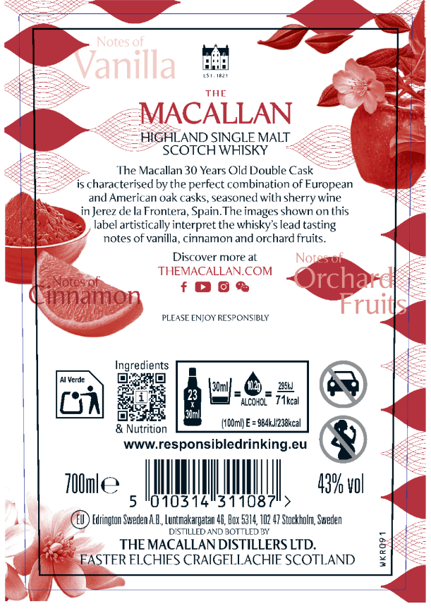 product_id 10013277 EAN_GTIN_UPC_MARA.EAN11 5010314311087 brand_name The Macallan product_display_name The Macallan Double Cask 30 Year Old 70cl ABV_MVKE.MVGR5 43.0 Size and UOM Picklist 700ml product_description_short A rare and precious single malt whisky. product_description_medium The Macallan Double Cask 30 Years Old, aged for thirty years in a harmonious union of American and European oak sherry seasoned casks, to create a unique taste and character. product_description_long The pinnacle of the Double Cask Collection, this rare and precious single malt whisky offers a multi-layered sensorial journey. Perfectly balanced by American and European oak, each cask is crafted by our expert coopers and seasoned with sherry wine in Jerez de la Frontera, Spain. The result is a smooth and creamy whisky of exceptional depth and character. key_words Macallan, Single Malt, Whisky, Whiskey, Scotch