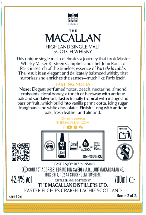 product_id 10013487 EAN_GTIN_UPC_MARA.EAN11 5010314314675 product_display_name The Macallan Distil Your World Paris 70cl ABV_MVKE.MVGR5 47.2 product_description_short A whisky inspired by the rich heritage of the Parisian restaurant culture. product_description_medium This whisky embodies the culture and cuisine that makes Paris so unique. A symphony of flavours with creamy sweetness and perfumed notes delivered by sherry seasoned American oak casks, with further fragrance, tropical and toasted notes from casks that previously held Bourbon. A touch of depth and soft spices introduced through sherry seasoned European oak casks, balanced with rich aromatics from Cognac casks. product_description_long The Macallan Master Whisky Maker, Kirsteen Campbell, and the Roca brothers, of El Celler de Can Roca, twice named World’s Best Restaurant in the world, went in search of the essence of the capital of cuisine. Paris, known for its rich culinary history, is world-renowned for its chefs and restaurants. The experience inspired them to translate the spirit of Paris into a unique single malt whisky and an extraordinary menu. The result is an exquisite single malt with unmistakable Parisian charm: sandalwood and gentle spices recall the perfumeries, buttery hints of baguette and brioche evoke the bakeries, and a cosmopolitan elegance emerges from sherry seasoned European oak casks and sherry seasoned American oak casks. colour Parisian Sunrise. aroma Elegant, baked almond croissants and a perfumed (rose) aroma. Sweet nectarines, sandalwood and vanilla. flavour Buttered pastry and brioche, peach melba and toasted oak. palate Buttered pastry and brioche, peach melba and toasted oak. finish Gentle spices.