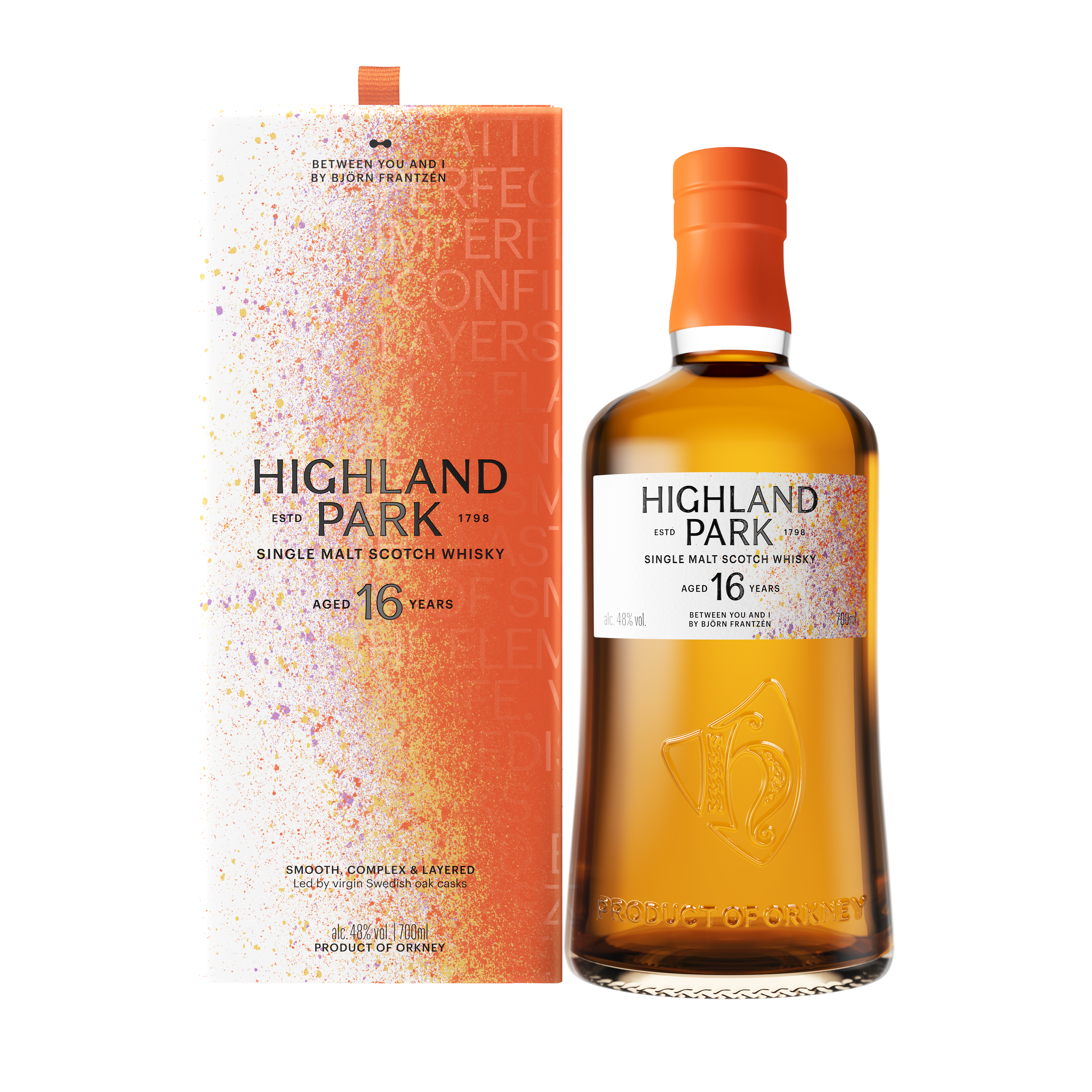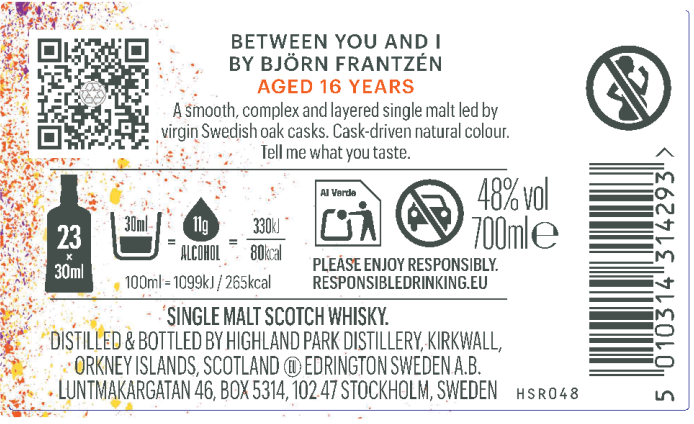 product_id 10203142 EAN_GTIN_UPC_MARA.EAN11 5010314314293 product_display_name Highland Park Between You & I 16 Year Old 70cl ABV_MVKE.MVGR5 48.0 product_description_short Between You and I is a 16 year old single malt that comes with no tasting notes—instead, you decide what it tastes like and the personal things its complex flavours evoke for you. The first person to taste this whisky was three Michelin star chef Björn Frantzén, and his personal tasting notes have inspired its packaging. product_description_medium Between You and I is all about our own personal responses to flavour. No two people will share the same thing, so the question is: what will you taste? To help you explore its complex layers of flavour, every bottle of Between You and I ordered from our webstore comes with a set of 16 prompt cards that offer surprising ways to think about and share your response to the whisky. product_description_long Between You and I is a 16-year-old single malt, crafted from virgin Swedish oak casks, ex-bourbon casks and sherry-seasoned oak casks. This special-edition, released in collaboration with Michelin-starred chef Björn Frantzén is all about discovering a more personal way to taste whisky, which is why, instead of tasting notes, each bottle comes with a set of prompts to help spark personal associations as you explore the whisky’s depths of flavour. colour We invite you to discover your own colour. aroma We invite you to discover your own aroma. flavour We invite you to discover your own tasting notes. palate We invite you to discover your own tasting notes. finish We invite you to discover your own finish.