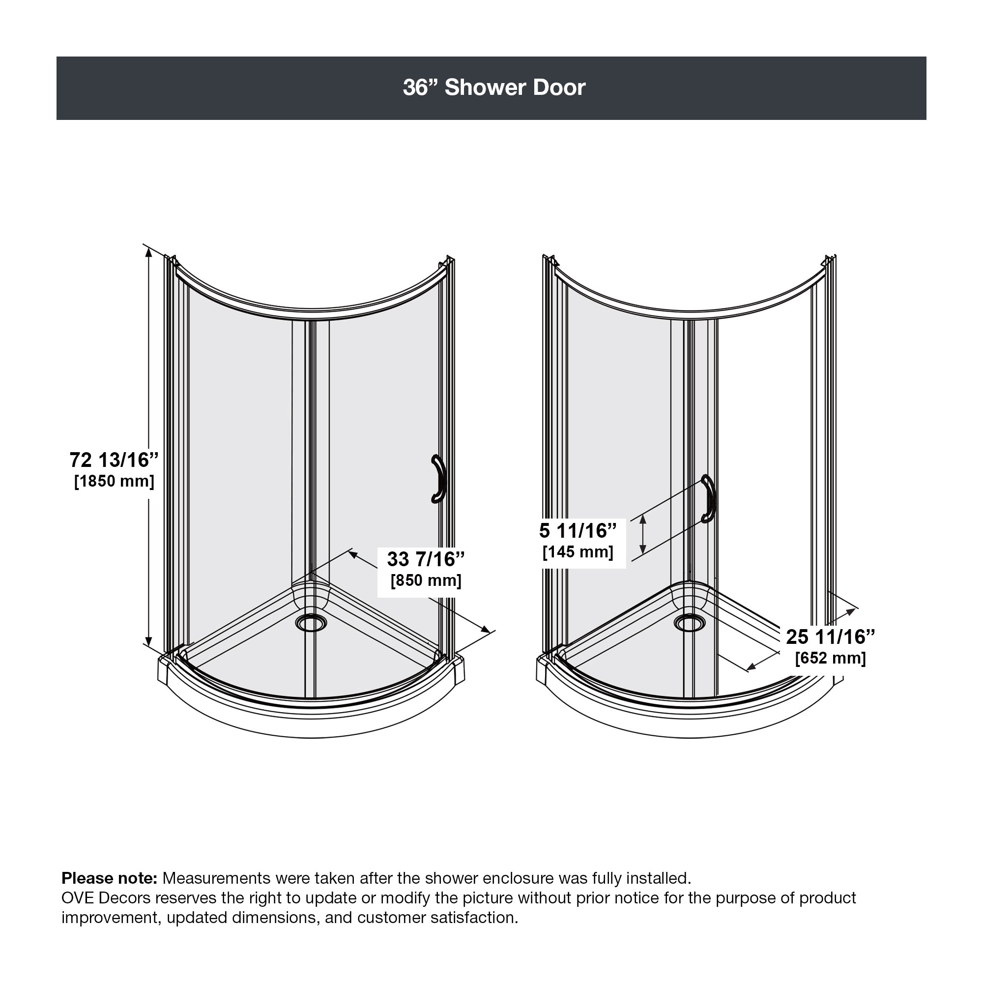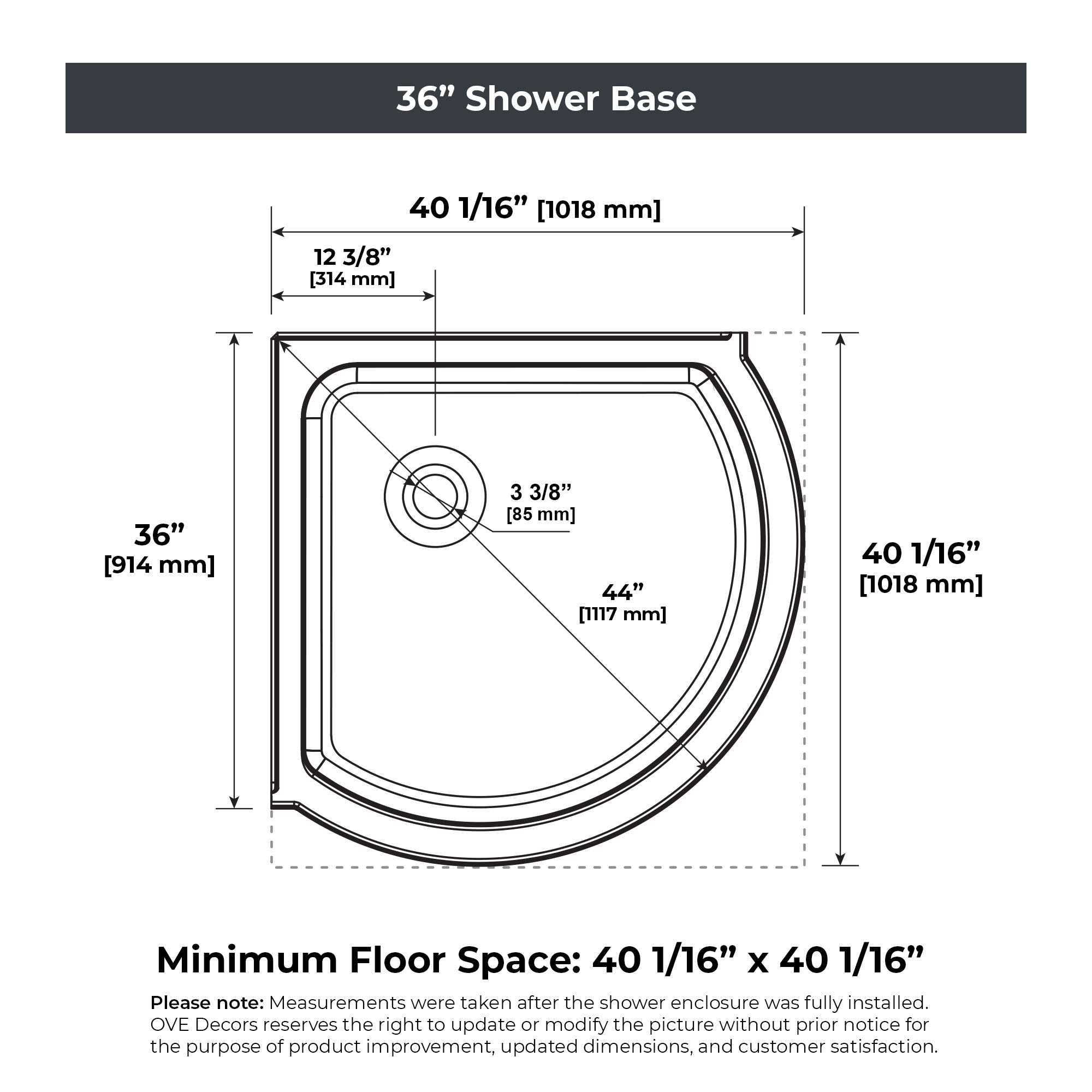 Rounded enclosure has width of 40 in. at its widest point, with 36 in. width from stud to stud (with 46 7/8 in. interior showering space from corner to curve)
