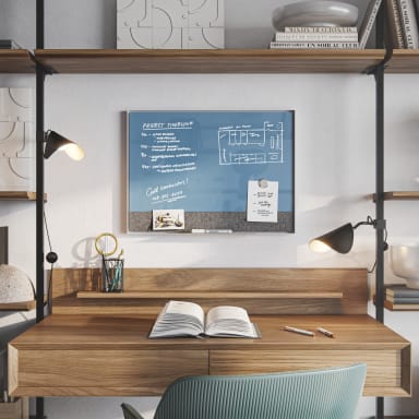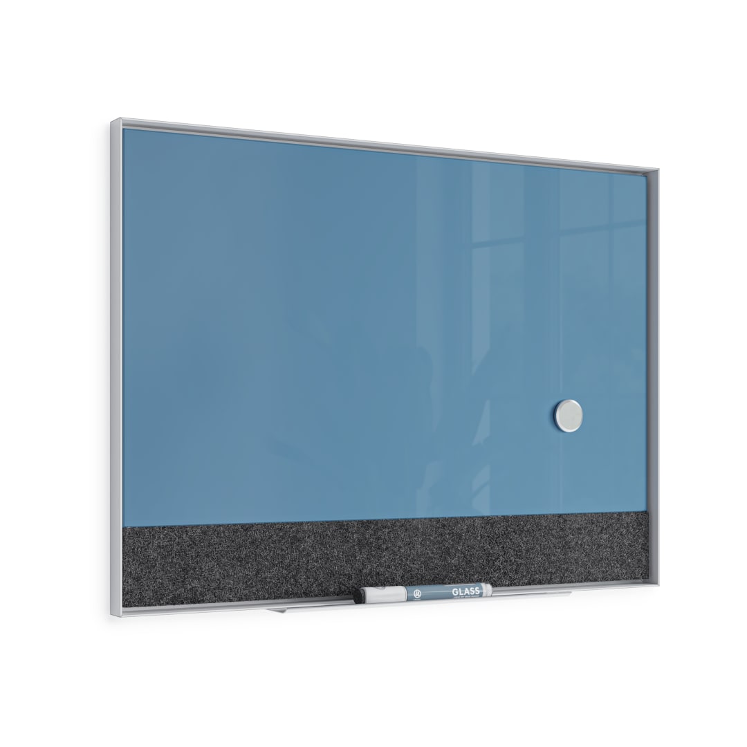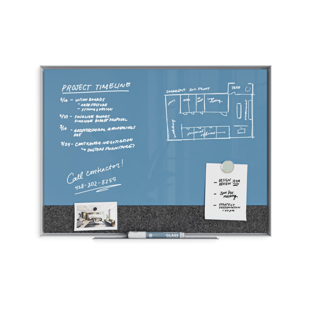 Marketing Long Copy This blue magnetic glass dry-erase board is a perfect and functional solution for the frequent and heavy usage areas of your office, school classroom, home or any commercial space. Durable white aluminum frame adds a clean modern touch to any room setting. The board's premium ultimate glass writing surface will never stain or ghost. Built in felt strip enables you to pin important notes and pictures. All ink erases easily with a simple eraser and the glass surface continuously outperforms all traditional melamine or painted steel dry-erase writing surfaces. Occasionally, use any dry-erase board spray or wet dry-erase board wipes after continuous use to clean the writing surface. Although all dry-erase and glass markers work well with this board, the U Brands® dry-erase markers provide the ultimate writing and eras-ability experience. For safety, the board is made from tempered glass as well. This whiteboard board has a universal mounting system, as it can be hung vertically or horizontally to fit your allocated space. All wall hanging hardware is hidden under the mounting bolts for a sleek and modern appearance. Mounting hardware and instructions are included for quick and easy mounting. The board is packaged with extra supportive corrugate material that is highly resistant to damage during shipping; all corrugated material can be recycled once unpacked. Features Bullets Combined - Premium tempered magnetic glass dry-erase surface never stains or ghosts. Blue glass background creates high contrast with white and bright color dry-erase or glass markers. Magnetic surface is only compatible with high energy magnets