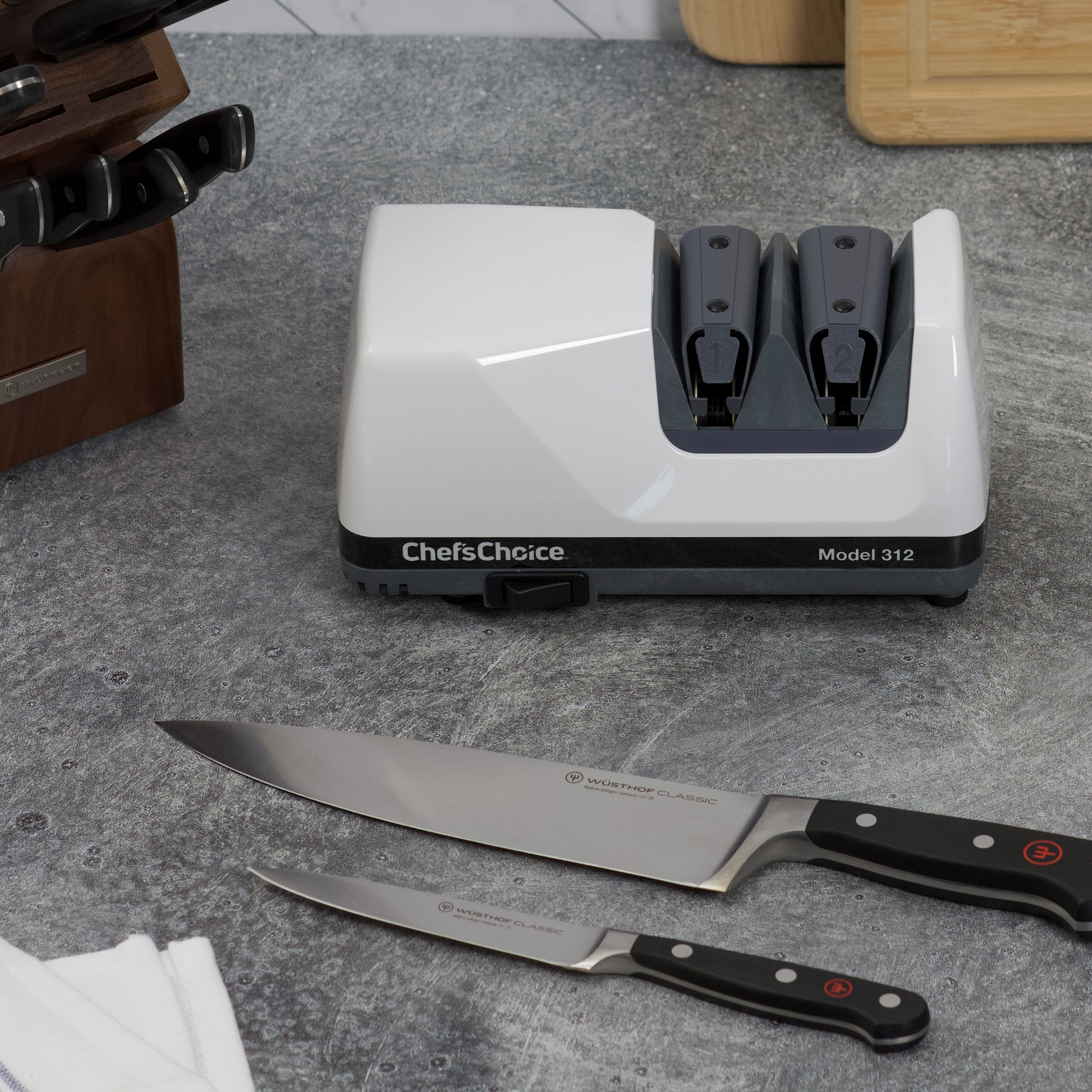 | Long Description | Keep your knives sharp and cutting like new with the Chef'sChoice Diamond UltraHone Knife Sharpener. This compact professional electric 2-stage knife sharpener sharpens both straight edge and serrated 20 degree class knives to better than factory edges, in just minutes. The 2-stage sharpening provides arch-shaped edges that are stronger and longer-lasting than hollow ground or conventional “V” edges. Stage 1 uses 100% fine diamond abrasives to create the first bevel and Stage 2 ultra-hones the edge using advanced micron size 100% diamond abrasives to complete the second bevel. The precisely formed conical diamond abrasive disks gently apply optimal sharpening pressure, guaranteed to never detemper the edge. Highly-precise knife guides automatically position and stabilize the knife as you sharpen for fast, foolproof results. It’s ideal for sharpening all types of knives, including kitchen, household, sporting and pocket knives. Engineered and assembled in the U.S.A. Covered by the Chef'sChoice Three-Year Limited Warranty. |