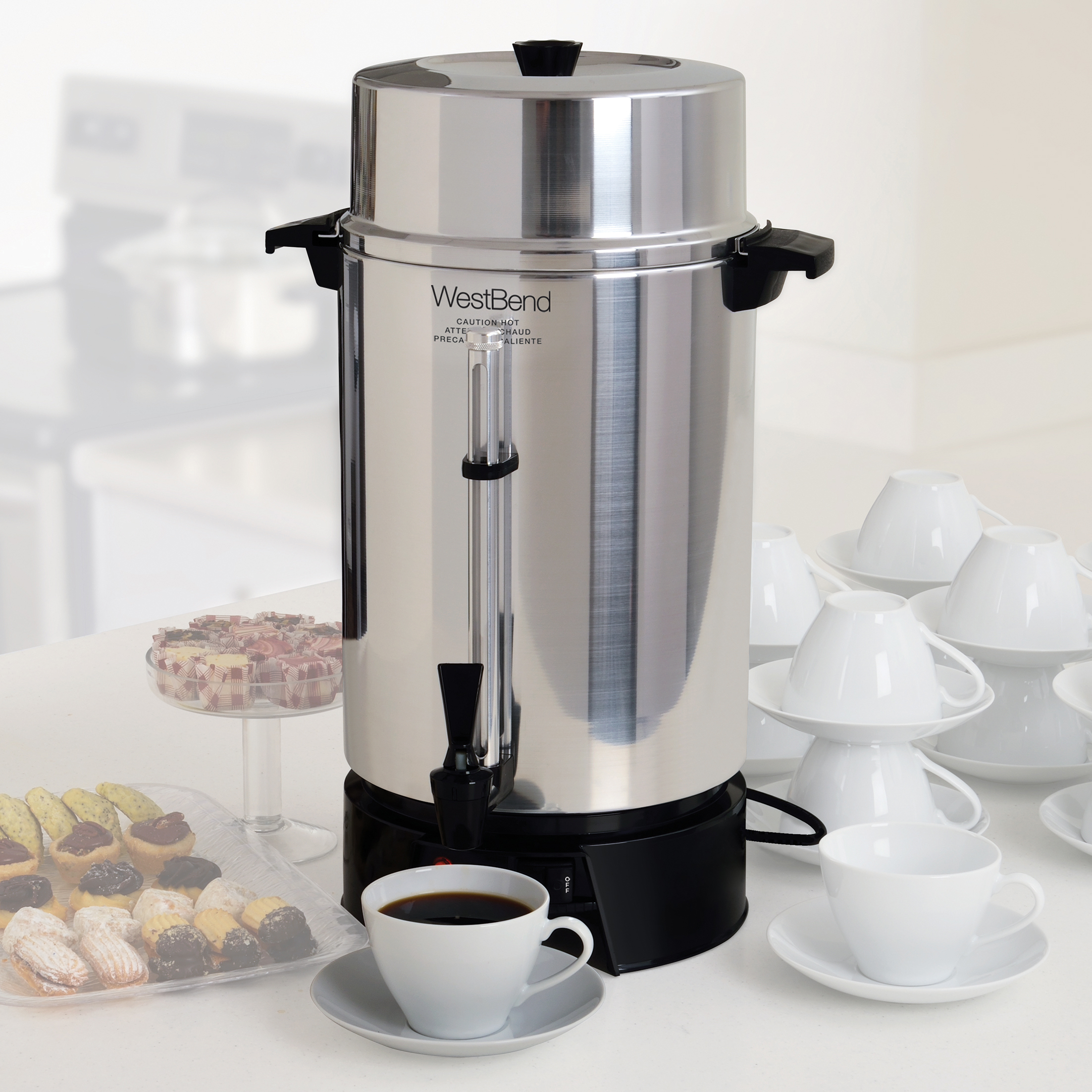 Description West Bend Coffee Urn 100 Cup 220-240V B Plug SKU 58010VB UPC 072244000658 Model 33600 Brand West Bend Product Line Drinking Category Coffee Subcategory Coffee Urn Division Countertop Commercial / Residential Residential SKU Status Established Warranty 1 Year Limited Warranty SRP 199.98571428571432 MAP Price 139.99 Long Description The West Bend 100 Cup Coffee Urn is the perfect tool for any gathering. Quickly make 40-100 servings of coffee, brews faster than one cup per minute. Continuous flow, two-way faucet is ideal for filling carafes or letting guests serve themselves. Features a twist-to-secure cover, cool-touch handles, and heat-resistant base for added safety. Coffee level gauge to view how much coffee remains. Bullet 1 READY LIGHT An indicator light informs you that the brewing cycle is done and Coffee is ready Bullet 2 EASY VIEWING Features a coffee-level gauge and interior water level markings Bullet 3 ALWAYS HOT Automatic temperature control Keeps Coffee hot for hours Bullet 4 Two-way dripless faucet for single-cup or continuous filling Assembled Weight (lb) 7.48 Unit Dimensions (in) 14.06" x 14.1" x 22.6" Assembly Required No Color Silver Material Stainless Steel Size 100 Cup Electric Yes Electrical Specs 12.5A/220V-240V/1500W Plug Type B Use and Care Instructions Hand Wash Only Included Components - West Bend 33600 100-Cup Commercial Coffee Urn