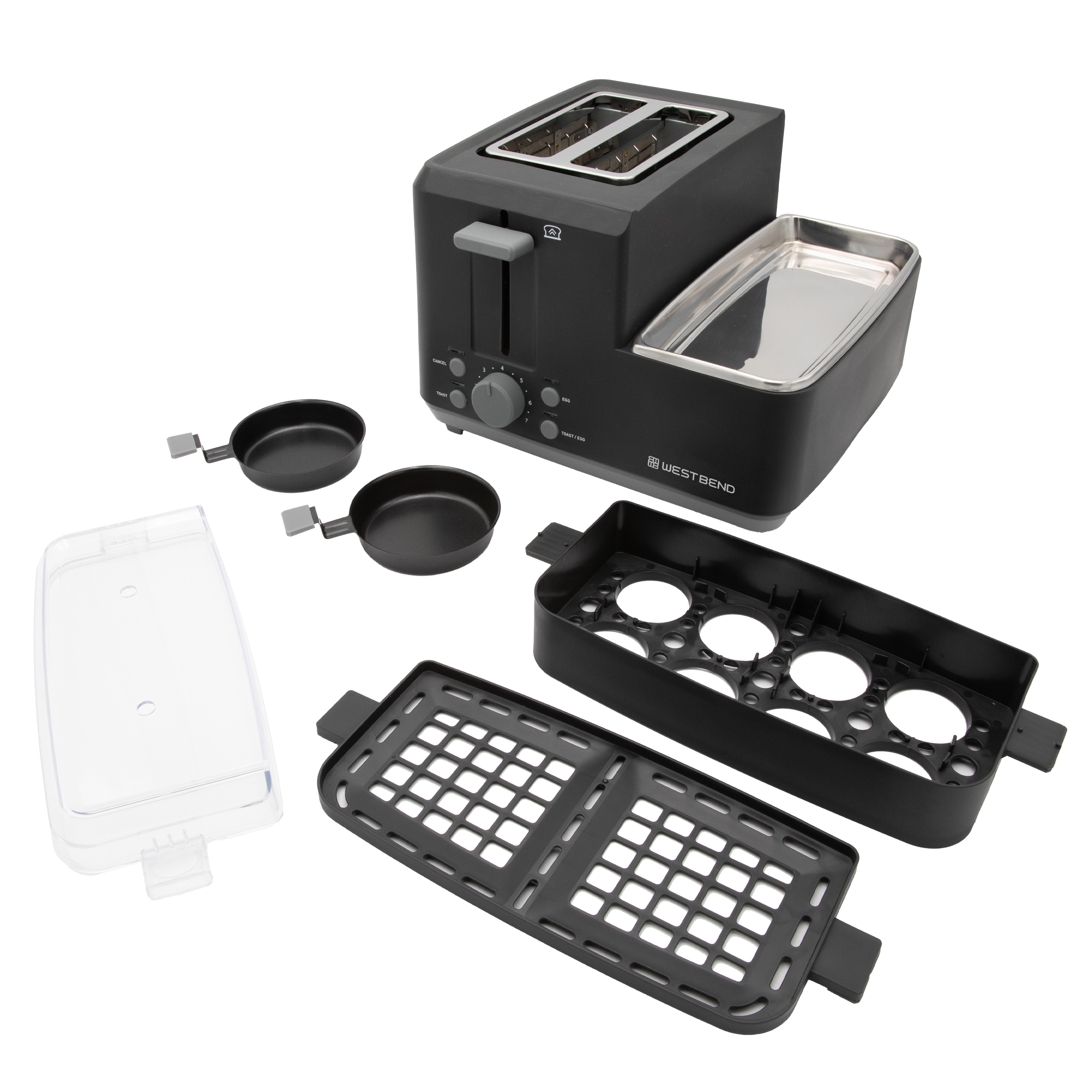 | Long Description | The West Bend breakfast station, egg and muffin, 2-slot toaster is a single compact breakfast station that can do it all! Toasts a variety of breads, English muffins, bagels, and croissants. High-toast lift makes removal of smaller bread types quick, easy, and safe. Includes color selection from light to dark toast, control settings. You can enjoy up to eight hard or soft-boiled eggs. This also includes two poaching trays and a meat warming tray to heat precooked meats, tomatoes, or pineapple slices. The egg and muffin breakfast station toaster can be used solely as a full functioning toaster and poacher or can be used simultaneously to make the ultimate breakfast sandwich in minutes! |