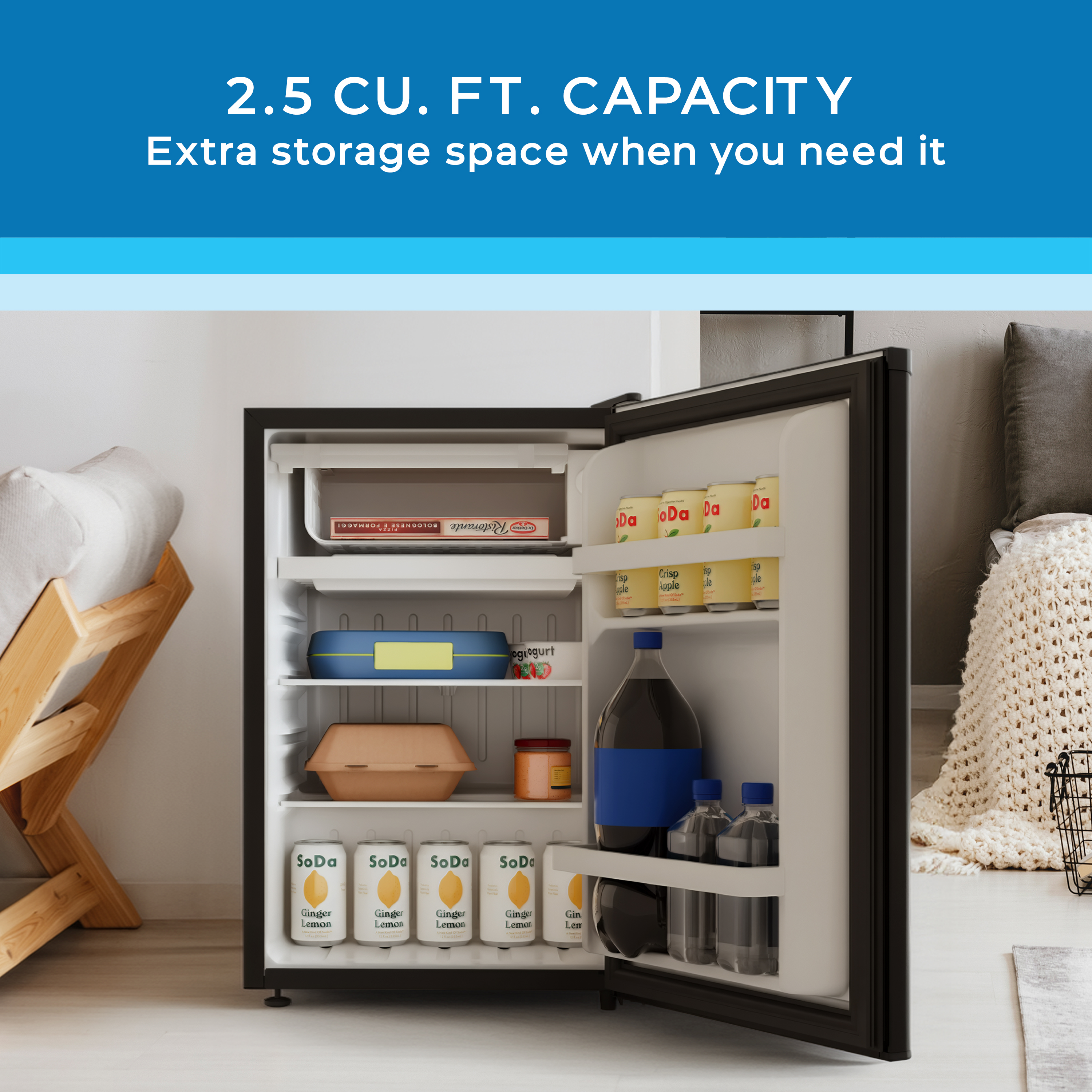| Bullet 1 | Compact Design: 2.5 cu. ft. capacity, ideal for small spaces like offices, dorms, and bedrooms |