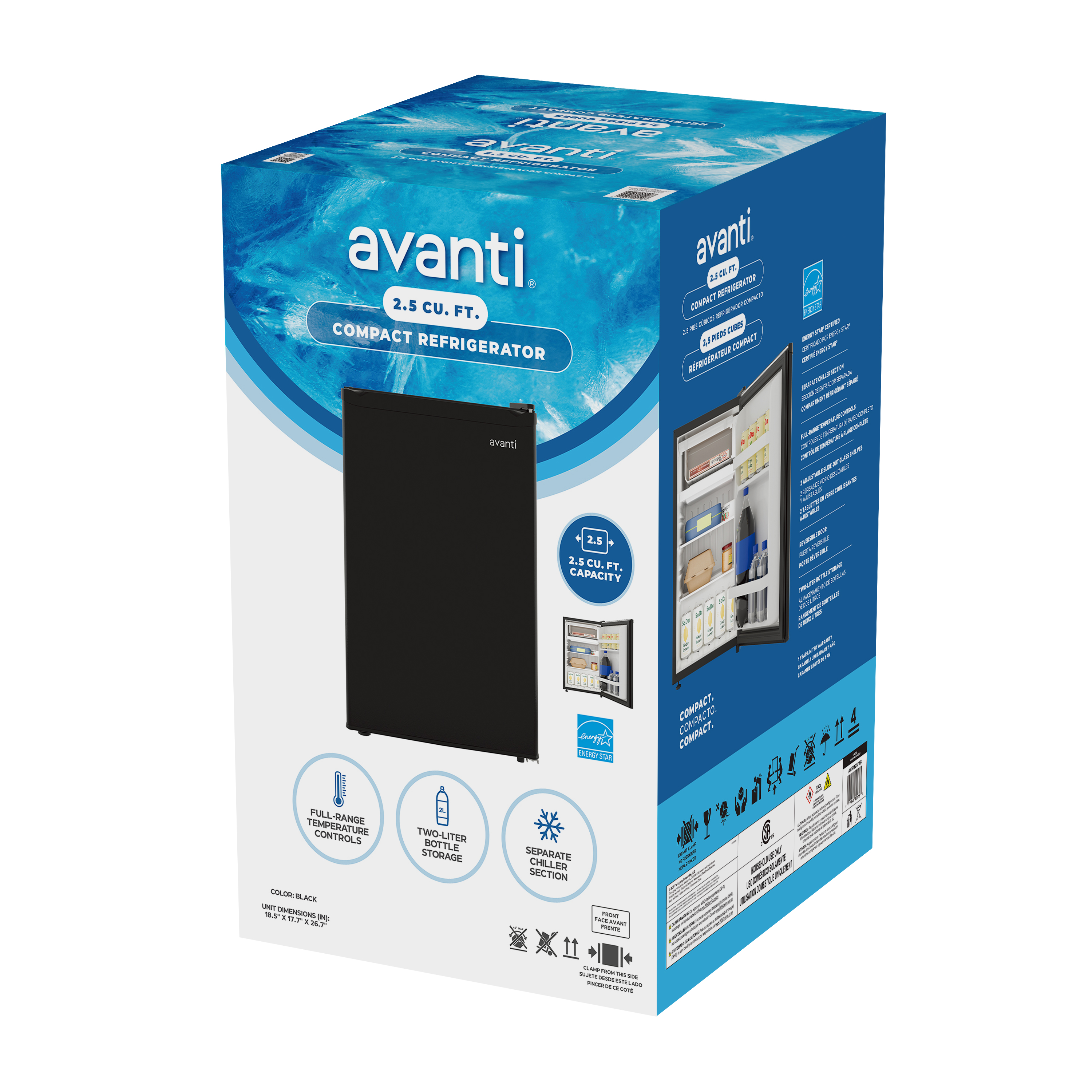| Long Description | Meet your new go-to appliance: the Avanti 2.5 cu. ft. Compact Refrigerator, perfectly designed for those snug spaces in your life—whether it’s your office, dorm room, or bedroom, this versatile appliance combines convenience and efficiency. The Avanti mini fridge is designed to maximize space efficiency without compromising on performance. With a 2.5 cu. ft. capacity, it offers ample storage for your drinks, snacks, and small food items. The refrigerator features a 2-liter bottle compartment for upright storage. The separate chiller compartment is perfect for storing items that require quick cooling, ensuring they stay fresh longer. The removable glass shelves allow you to customize the interior layout to suit your needs. Equipped with full range temperature control, you can easily adjust the settings to keep your contents at the optimal temperature. The manual defrost feature simplifies maintenance, keeping your refrigerator running smoothly. The space-saving recessed door handle adds a stylish touch to the overall design. The reversible door gives you the flexibility to set the door swing to either the left or right, depending on your space layout. Additionally, this compact refrigerator is ENERGY STAR certified, indicating its energy-efficient operation that helps reduce energy costs. For added peace of mind, this Avanti refrigerator is backed by a 1-year manufacturer limited warranty. Elevate your cooling experience with the Avanti 2.5 cu. ft. Compact Refrigerator, the perfect blend of convenience, efficiency, and style. |