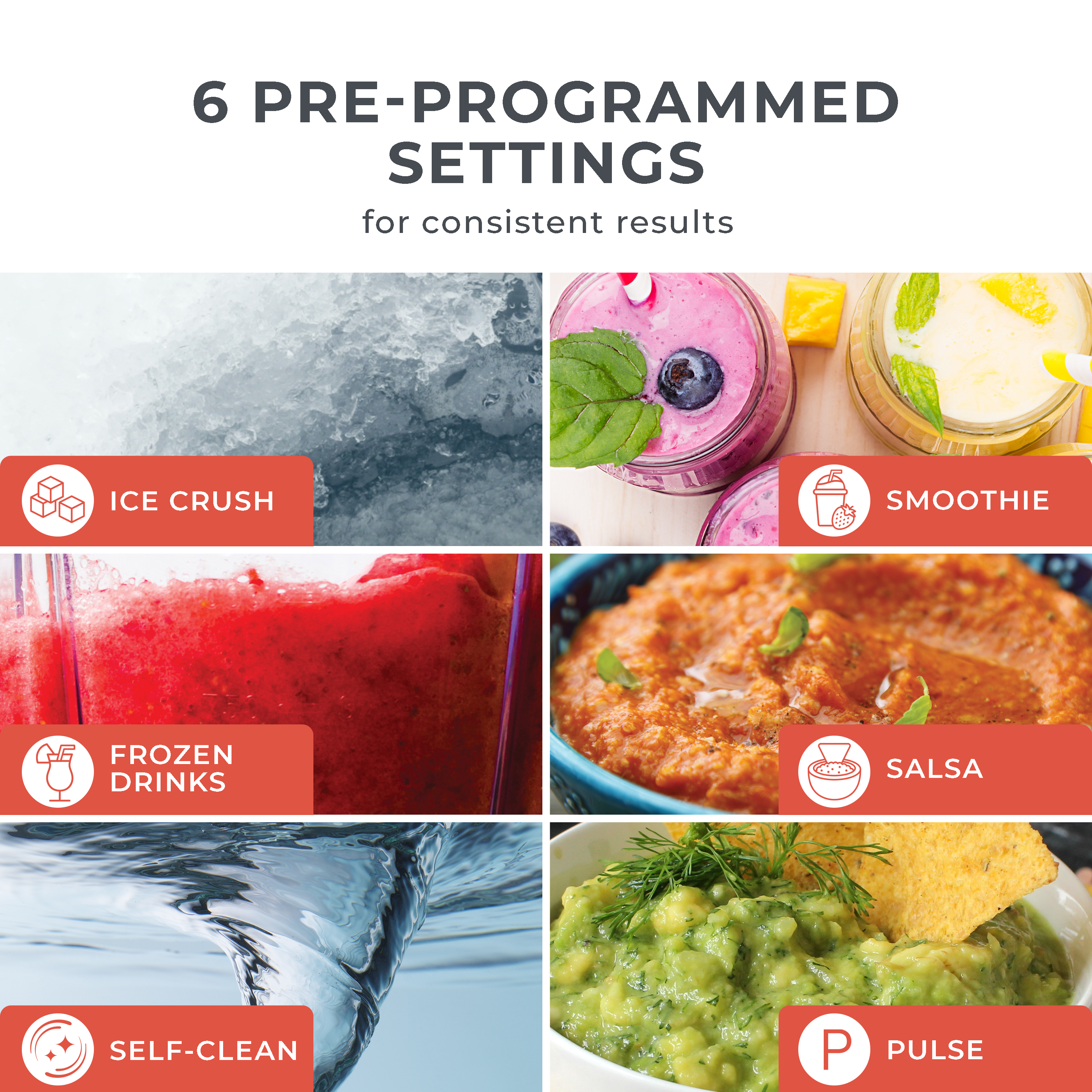 | Bullet 2 | 6 pre-programmed settings for consistent results: Smoothie, Salsa, Frozen Drinks, Ice Crush, Pulse, and Self Clean |