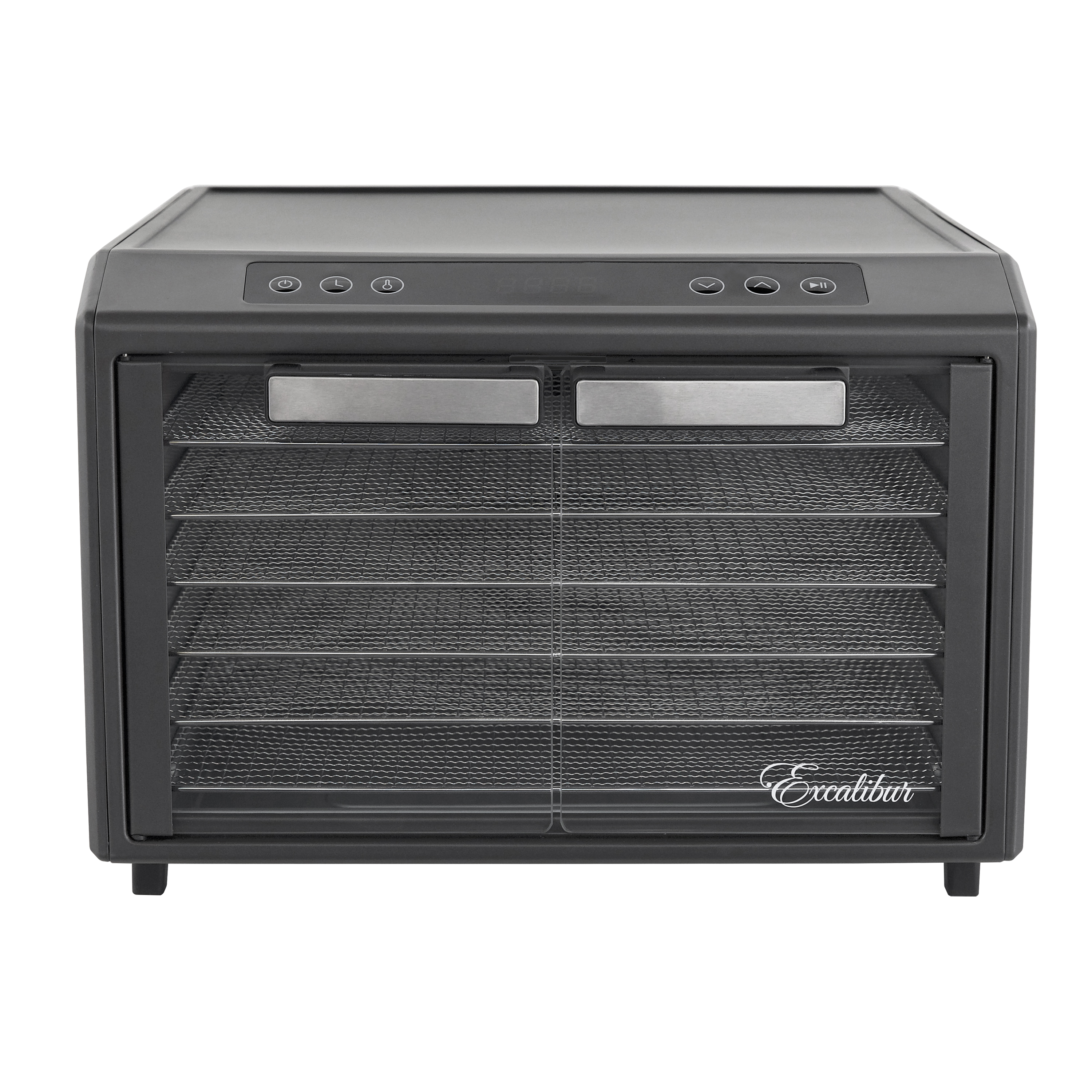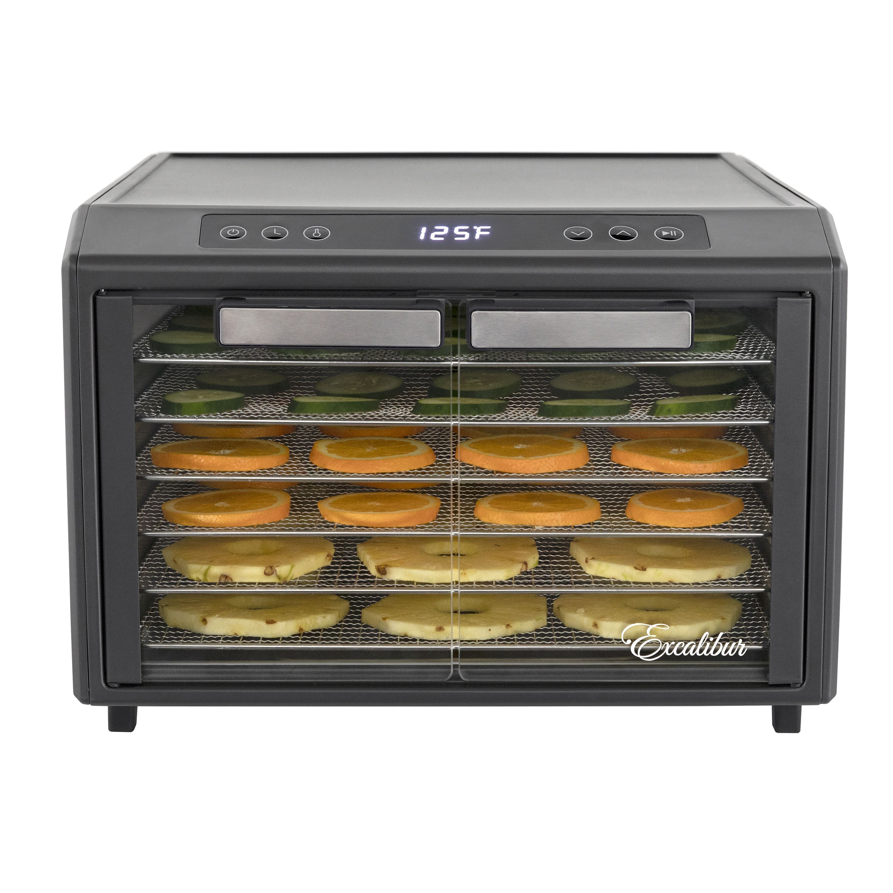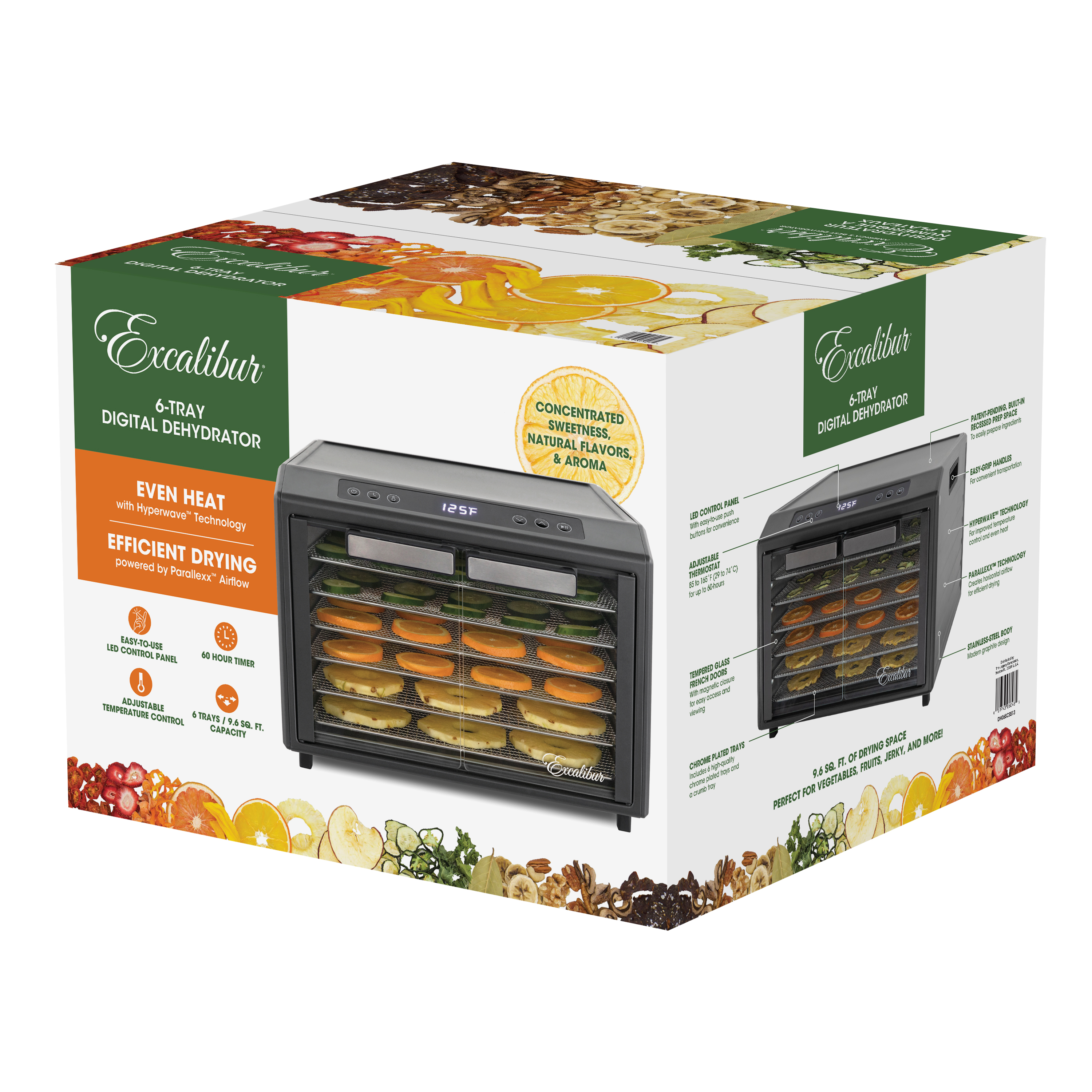 | Long Description | Preserve your food with the Excalibur 6 Tray Select Digital Dehydrator. This expertly crafted stainless-steel dehydrator features 9.6 square feet of drying space and includes six chrome trays, offering plenty of room to meet all your dehydrating needs. The patented Hyperwave Technology along with the Horizontal Parallex Air Flow fluctuates the temperature to remove water from food with a continuous circulation of thermostatically-controlled warm air for even drying without tray rotation. Set precise time and temperature with the easy-to-use LED control panel with temperatures ranging from 85°F to 165°F for up to 60 hours. The countdown timer will appear on the screen, and the unit will automatically shut off when drying is complete. Easily monitor the drying process through the clear glass French door. This unit is perfect for you, whether you are drying vegetables, fruits, herbs, meat, flowers, and more. Preserve your seasonal harvest or fresh catch, create healthier treats, or simply get crafty with this high-quality Excalibur dehydrator. Explore the world of preservation and get creative with the included digital book, "Preserve it Naturally." Covered by the Excalibur Three-Year Limited Warranty. |