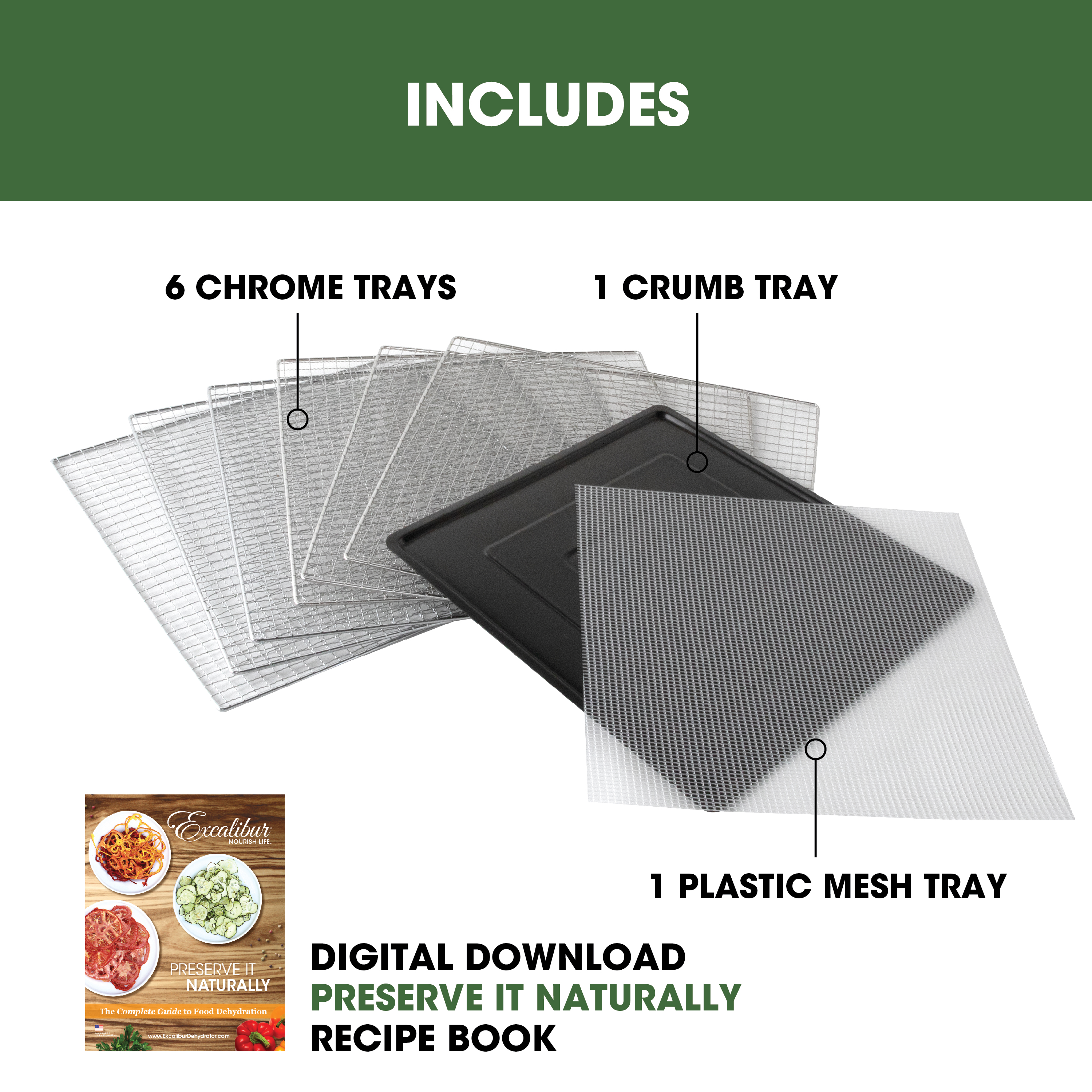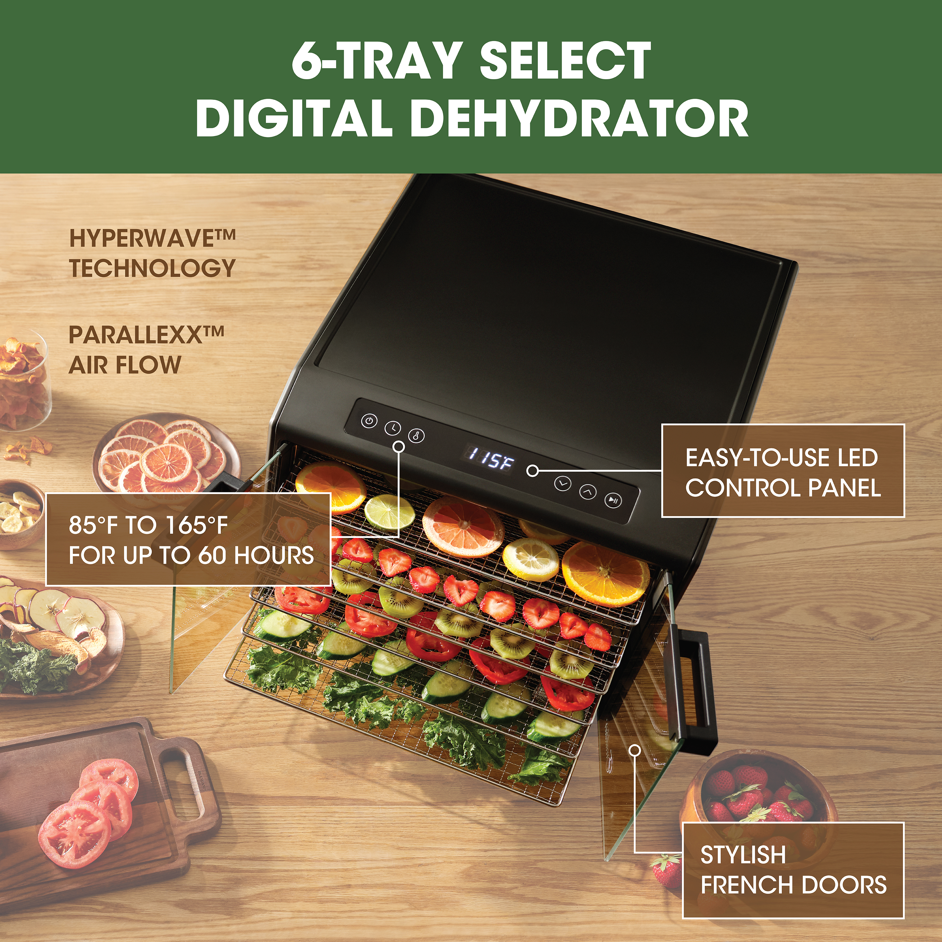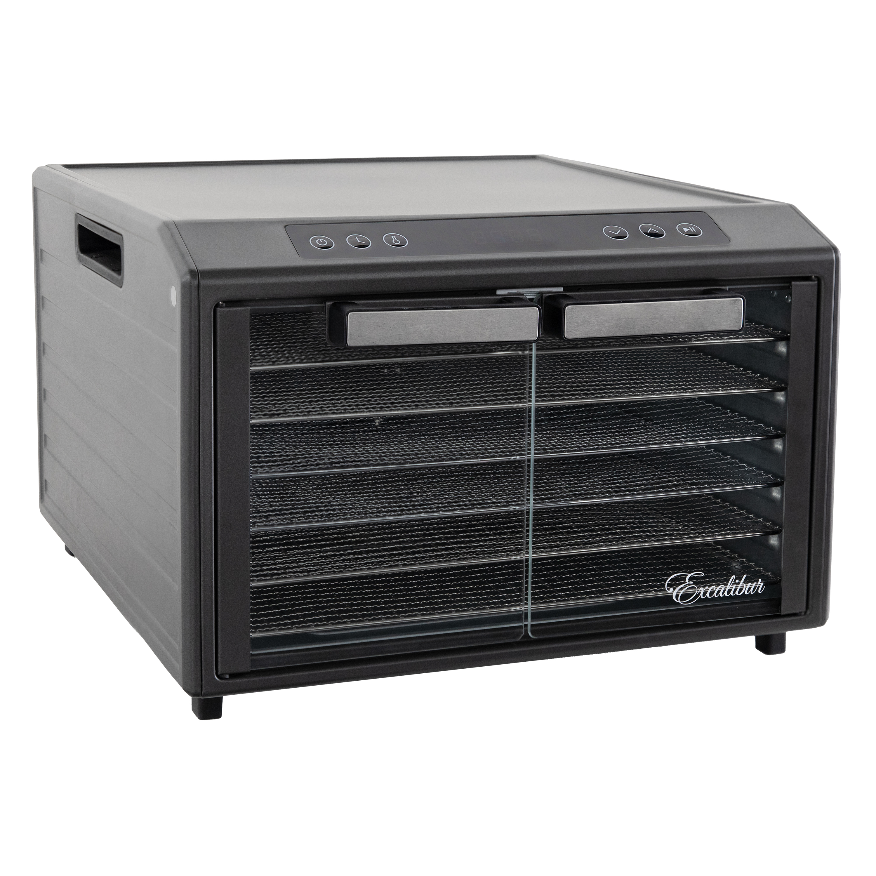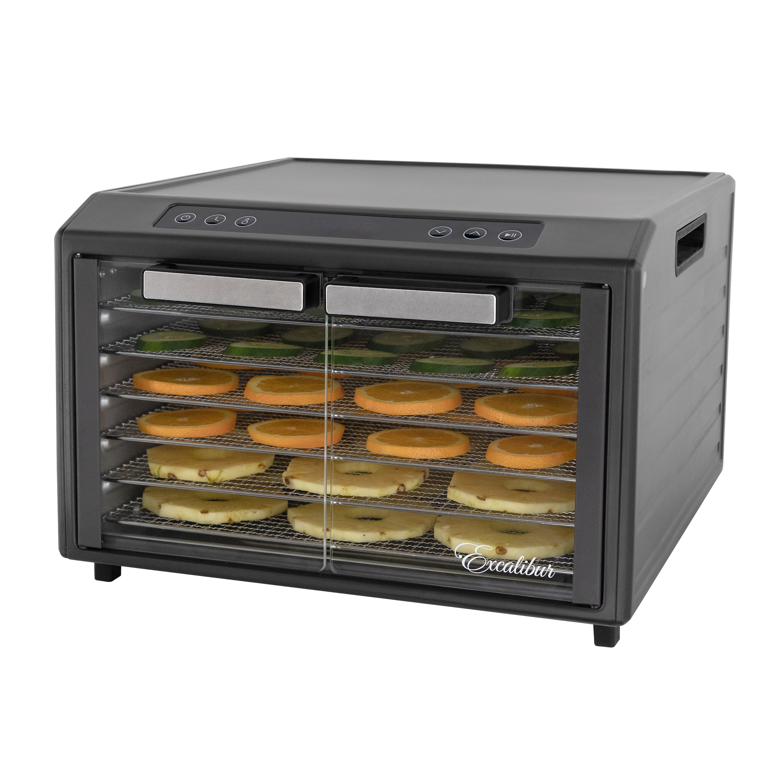 | Long Description | Preserve your food with the Excalibur 6 Tray Select Digital Dehydrator. This expertly crafted stainless-steel dehydrator features 9.6 square feet of drying space and includes six chrome trays, offering plenty of room to meet all your dehydrating needs. The patented Hyperwave Technology along with the Horizontal Parallex Air Flow fluctuates the temperature to remove water from food with a continuous circulation of thermostatically-controlled warm air for even drying without tray rotation. Set precise time and temperature with the easy-to-use LED control panel with temperatures ranging from 85°F to 165°F for up to 60 hours. The countdown timer will appear on the screen, and the unit will automatically shut off when drying is complete. Easily monitor the drying process through the clear glass French door. This unit is perfect for you, whether you are drying vegetables, fruits, herbs, meat, flowers, and more. Preserve your seasonal harvest or fresh catch, create healthier treats, or simply get crafty with this high-quality Excalibur dehydrator. Explore the world of preservation and get creative with the included digital book, "Preserve it Naturally." Covered by the Excalibur Three-Year Limited Warranty. |