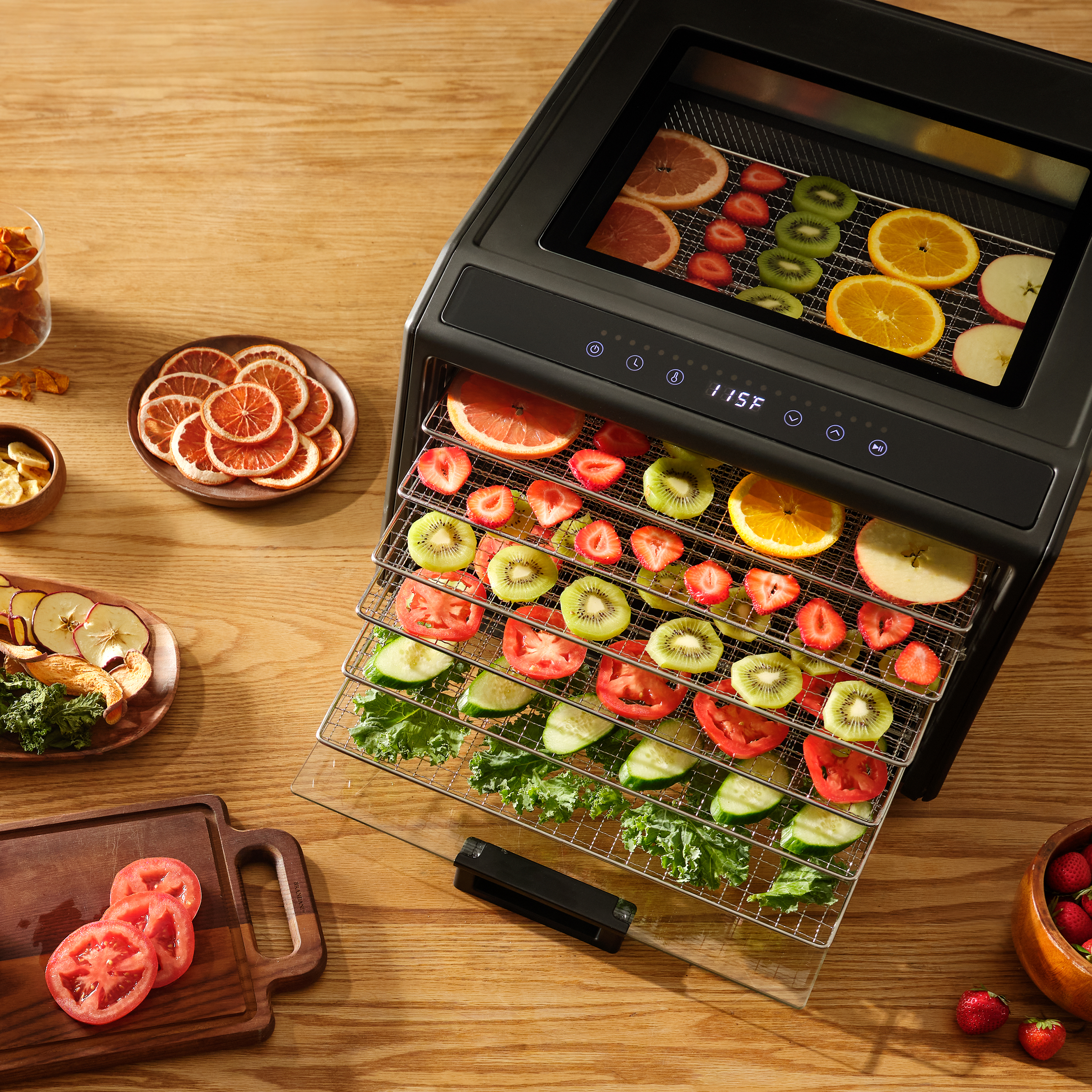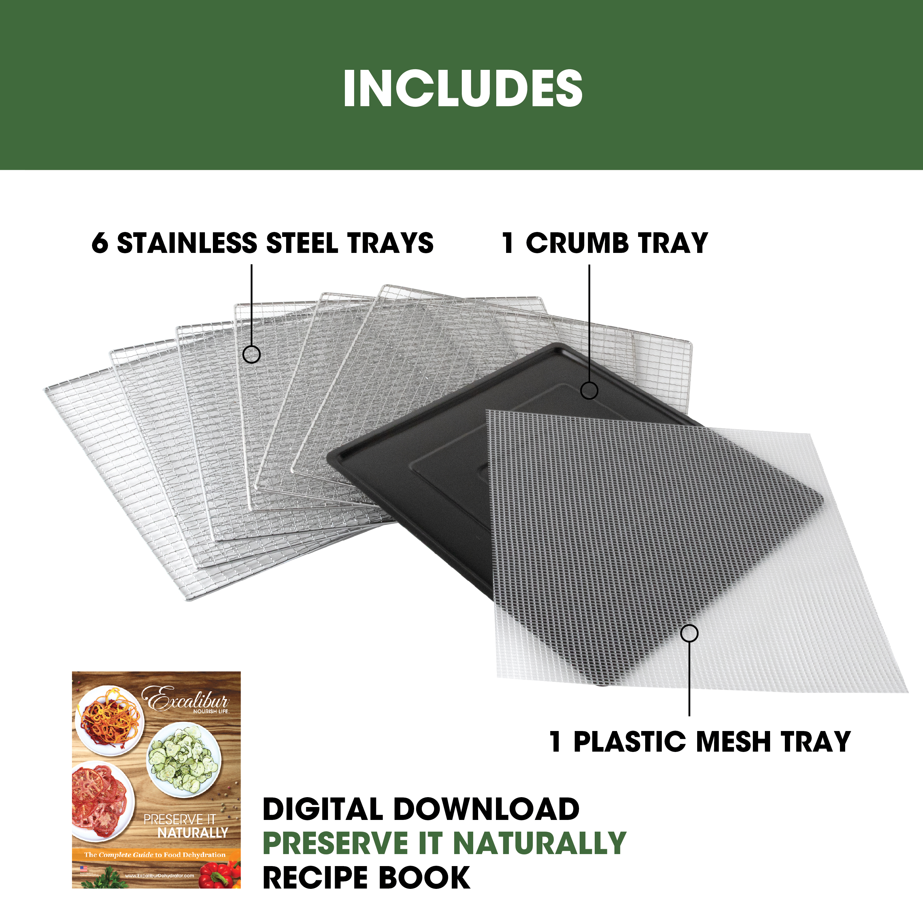| Bullet 1 | 6 dishwasher-safe stainless trays for enough space to dry a wide variety of foods |